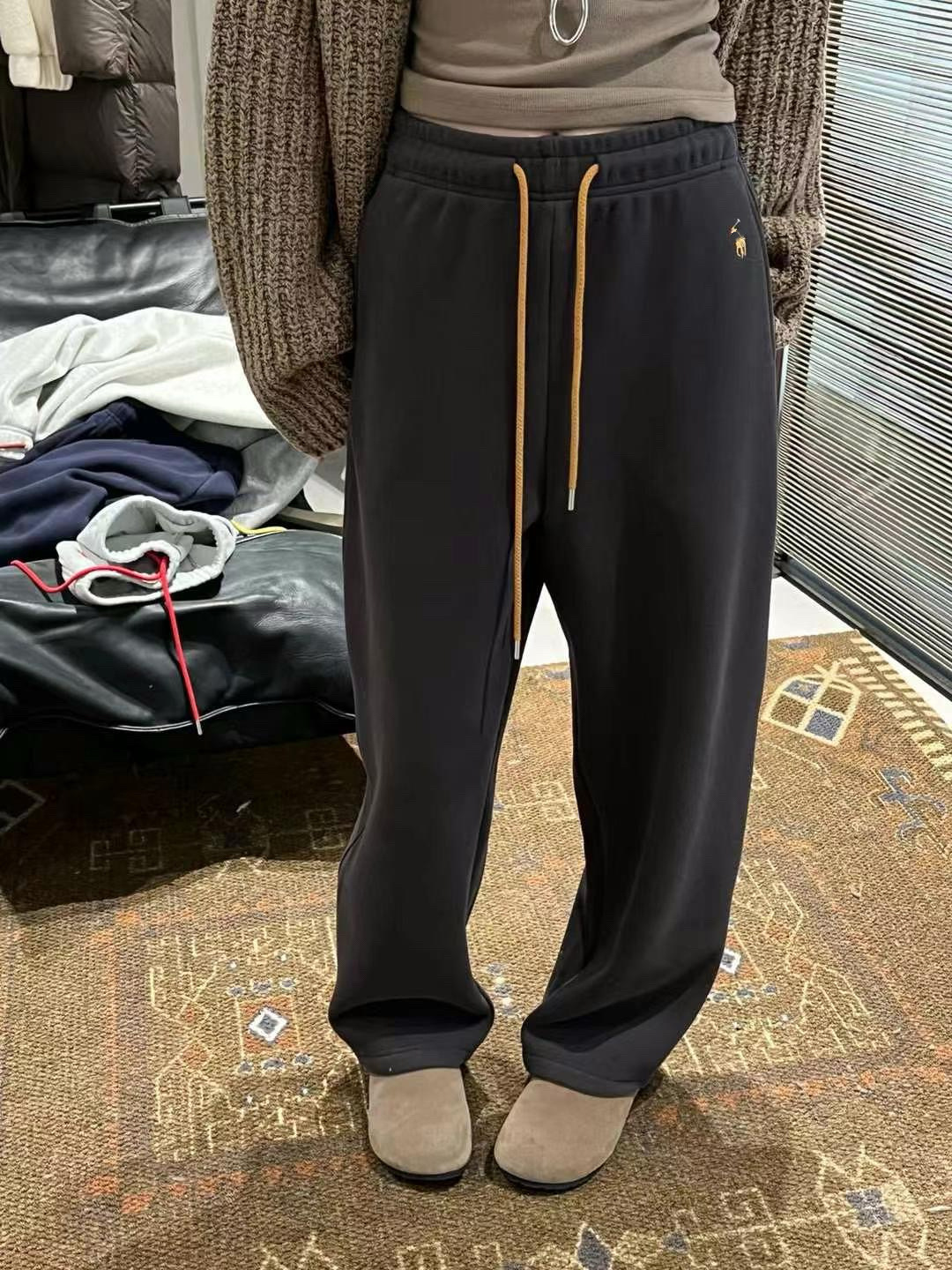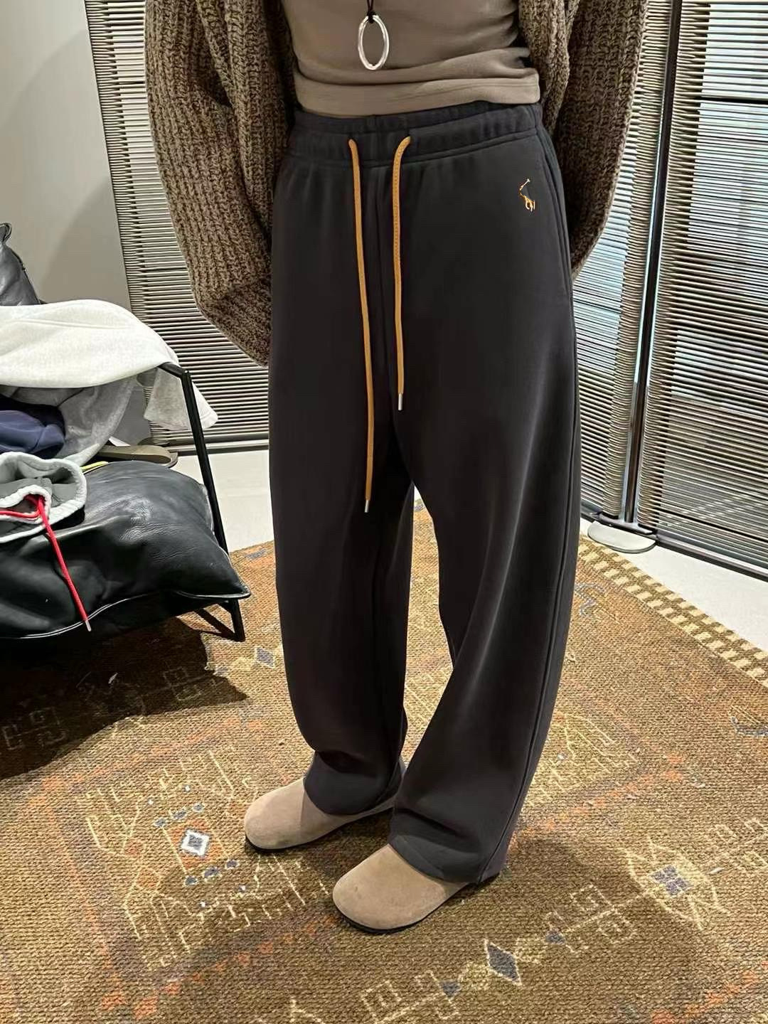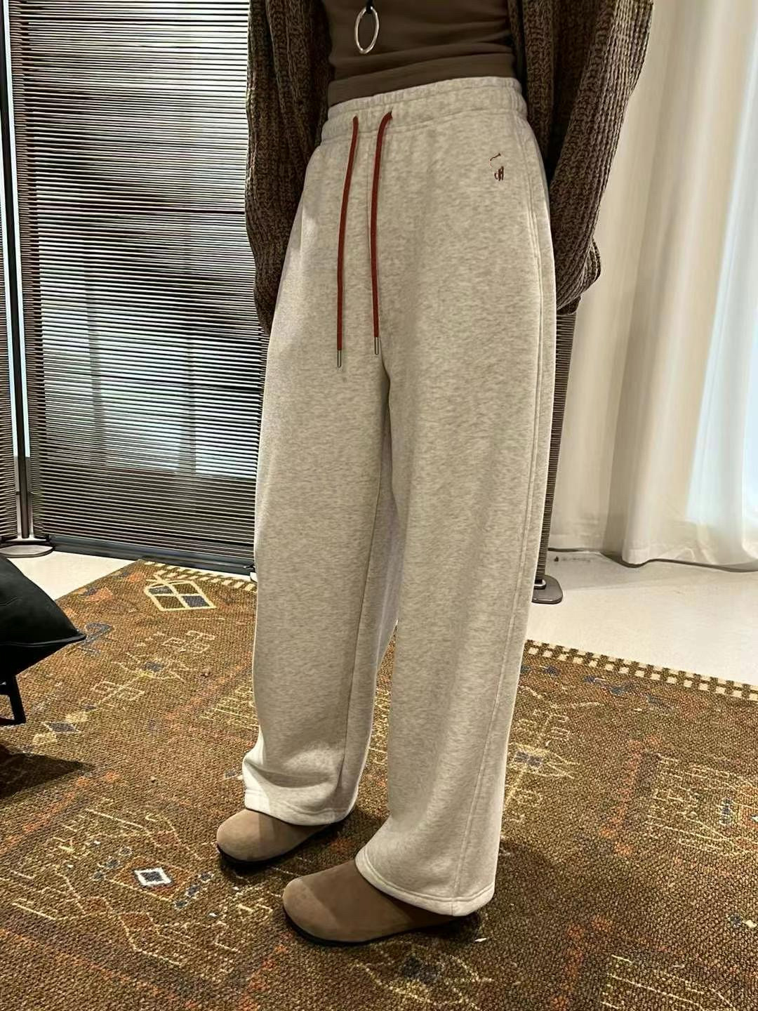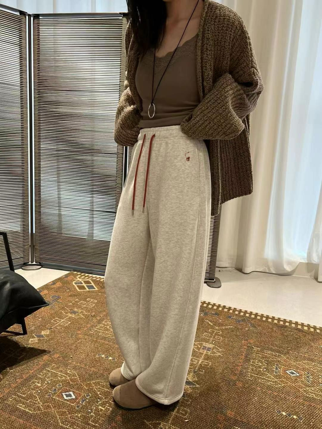 유럽 역 2024 겨울 새 기모 명암 Drawstring 자수 라벨 기모 넓은 다리 바지 캐주얼 마체테 바지스토어 가기