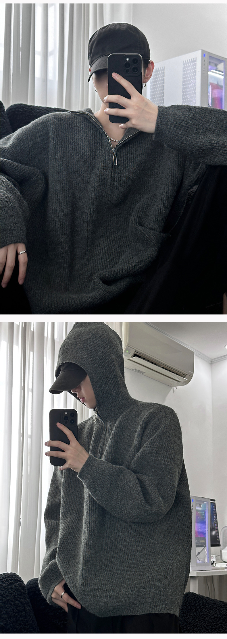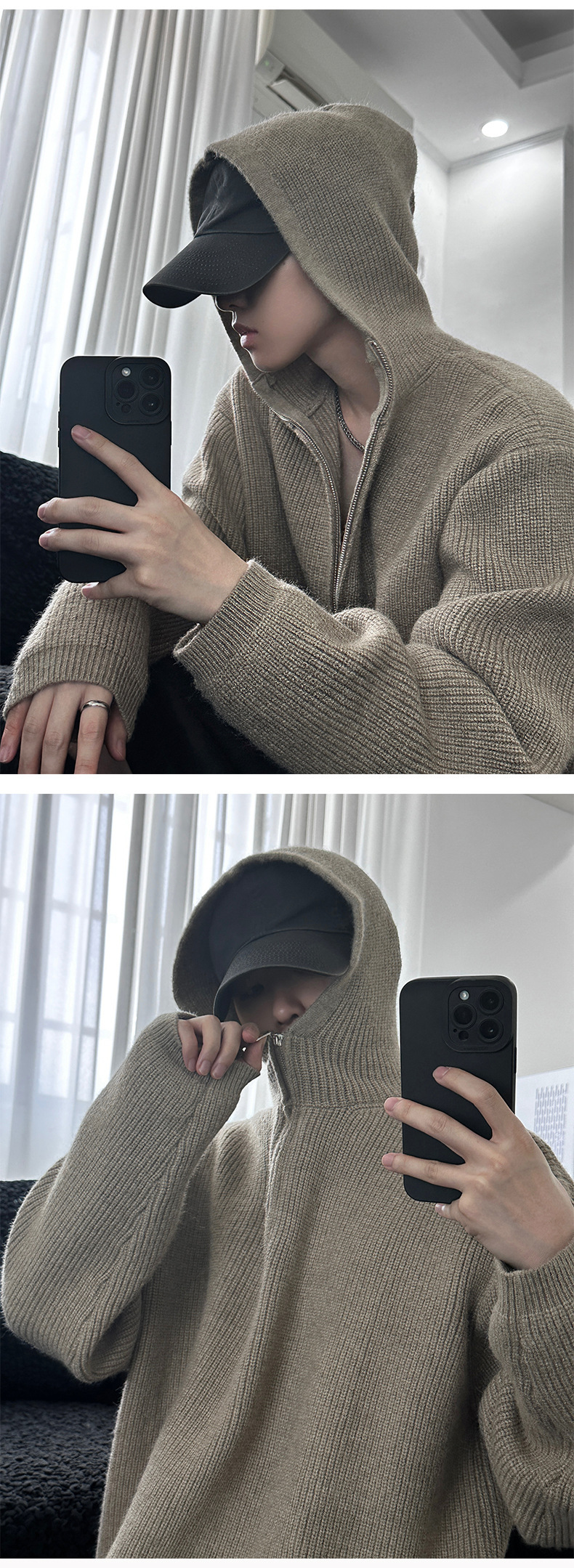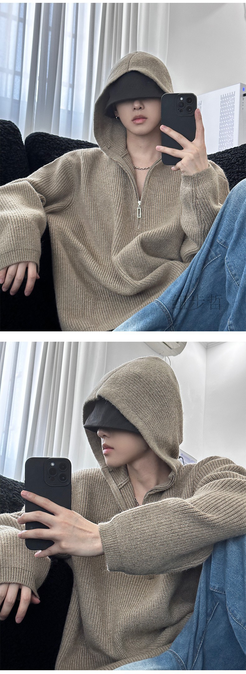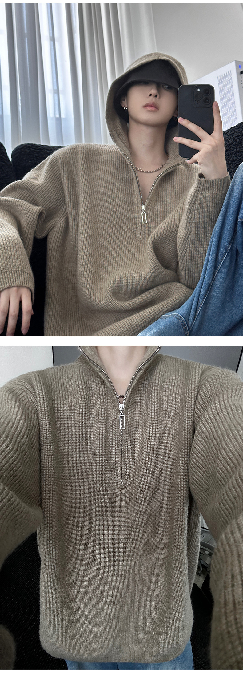 카키 클린 핏 니트 후드 스웨터 남자 가을 겨울 반 지퍼베이스 셔츠 게으른 스타일 고급 스웨터스토어 가기