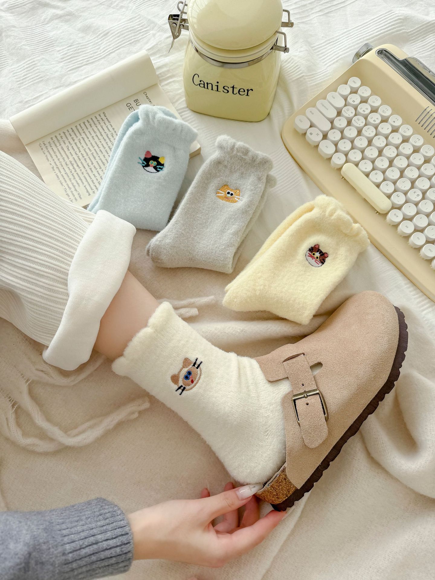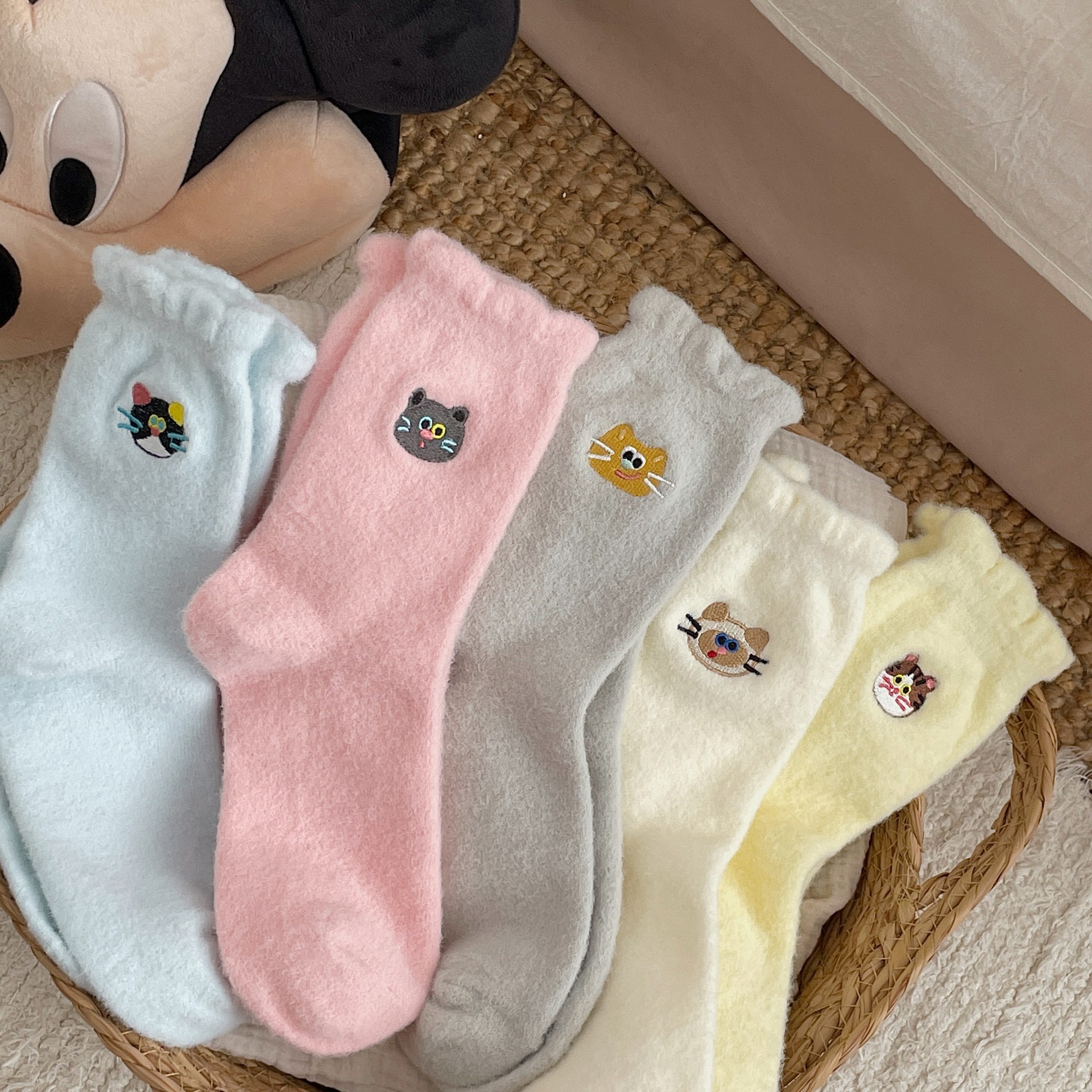 호주 벨벳 고양이 자수 양말 어린이 가을과 겨울 두꺼운 따뜻한 튜브 양말 귀여운 만화 집 수면 아기 양말