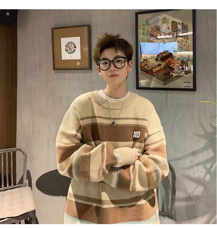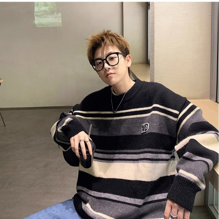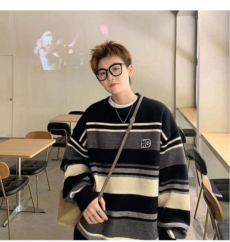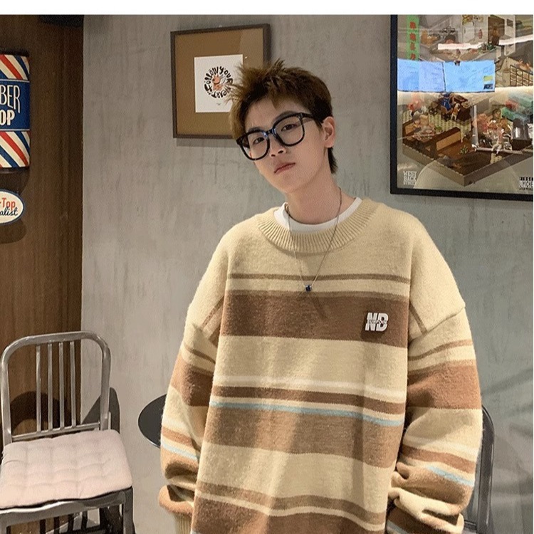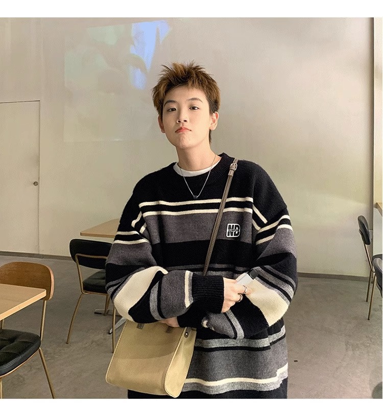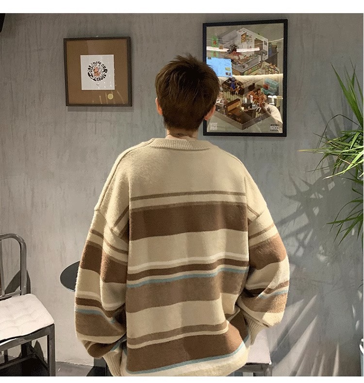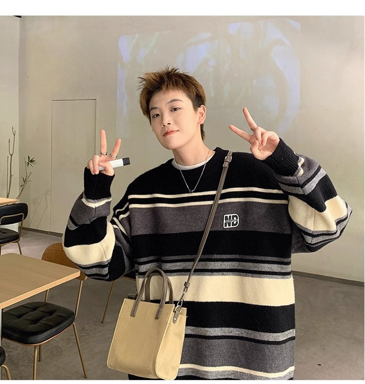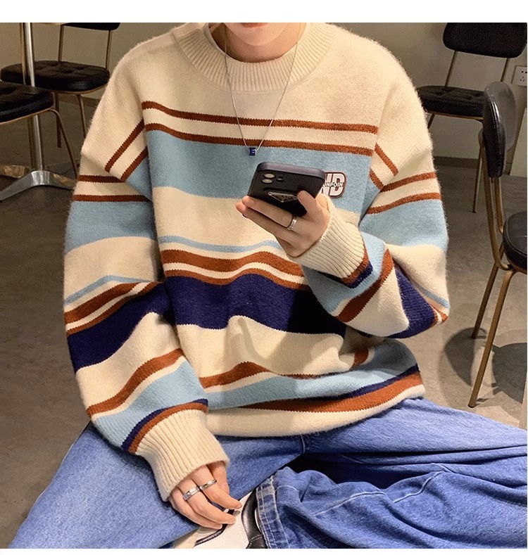 스트라이프 콘트라스트 컬러 스웨터 남자의 가을과 겨울 트렌디 브랜드 유행 느슨한 크루 넥 풀오버 스웨터 일본 스타일 레트로 스웨터 재킷스토어 가기