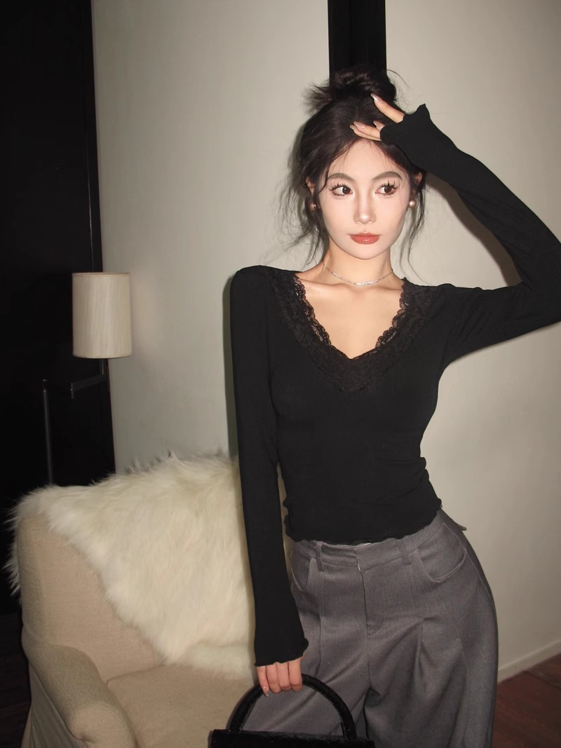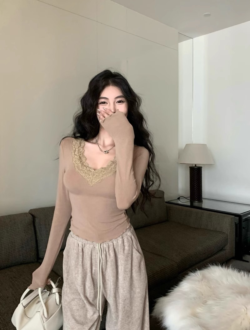 가을과 겨울 새로운 긴팔 따뜻한 벨벳 이너 탑 여성용 순수한 섹시한 레이스 바느질 슬림 핏 우아한베이스 셔츠