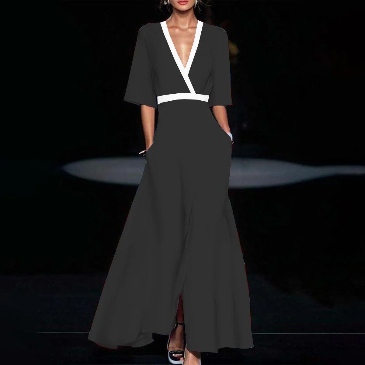 2024 새로운 아마존 유럽과 미국 여성 패션 우아한 우아한 V-목 인쇄 주름 큰 치마 긴 원피스