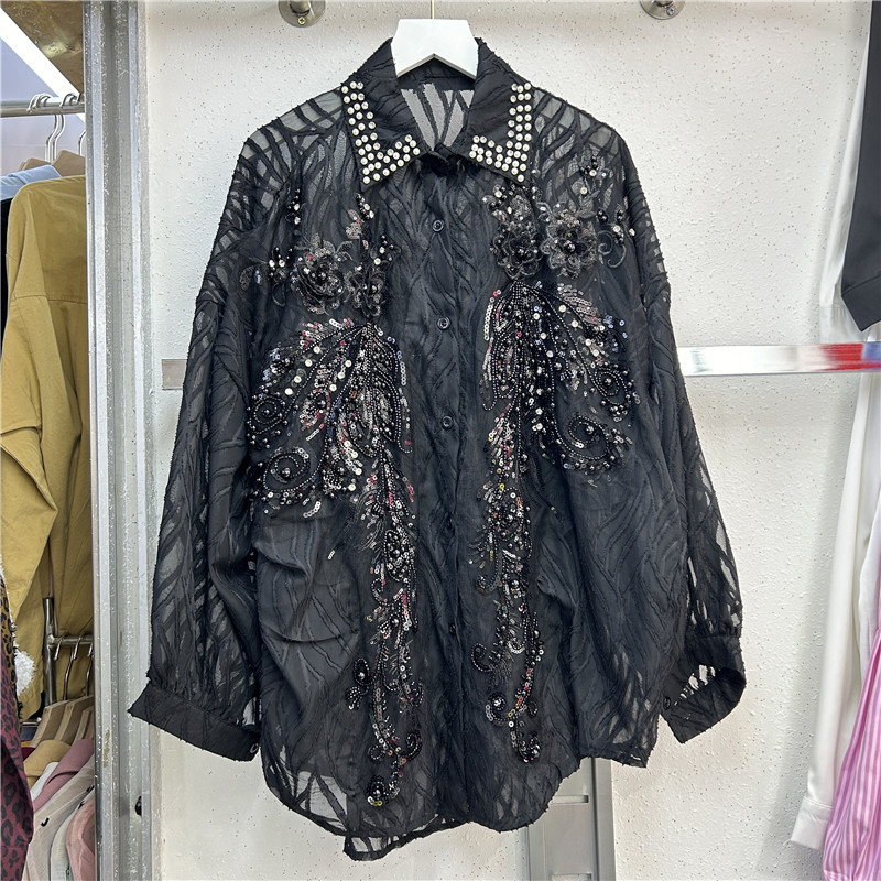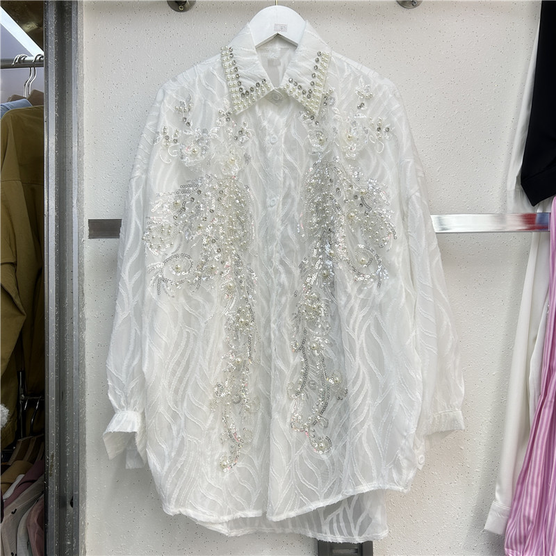 이른 봄 Loosen 옷깃 싱글 브레스트 긴팔 뉴 올 매치 여자 중간 길이의 헤비 듀티 세퀸 레이스 다이아몬드 셔츠스토어 가기