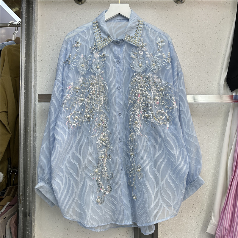 이른 봄 Loosen 옷깃 싱글 브레스트 긴팔 뉴 올 매치 여자 중간 길이의 헤비 듀티 세퀸 레이스 다이아몬드 셔츠