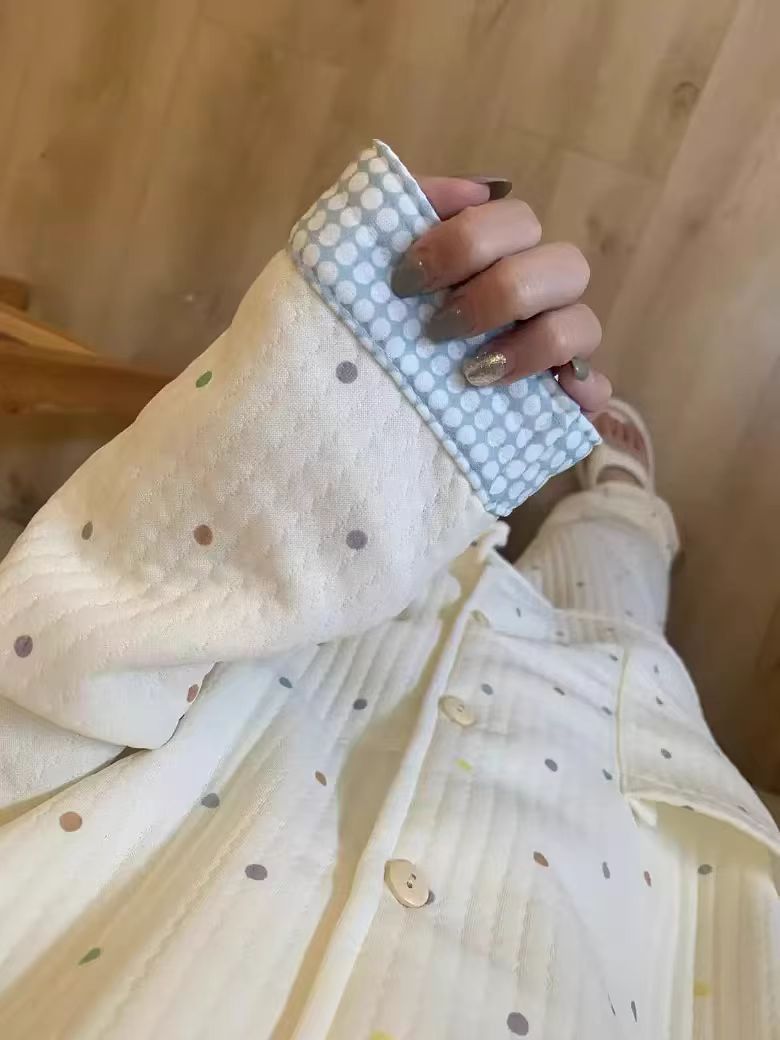 한국식 컬러 웨이브 도트 스트라이프 긴팔 잠옷 여성 가을 · 겨울 새 달콤한 스타일 코튼 퀼트 홈 의류 세트 아우터웨어