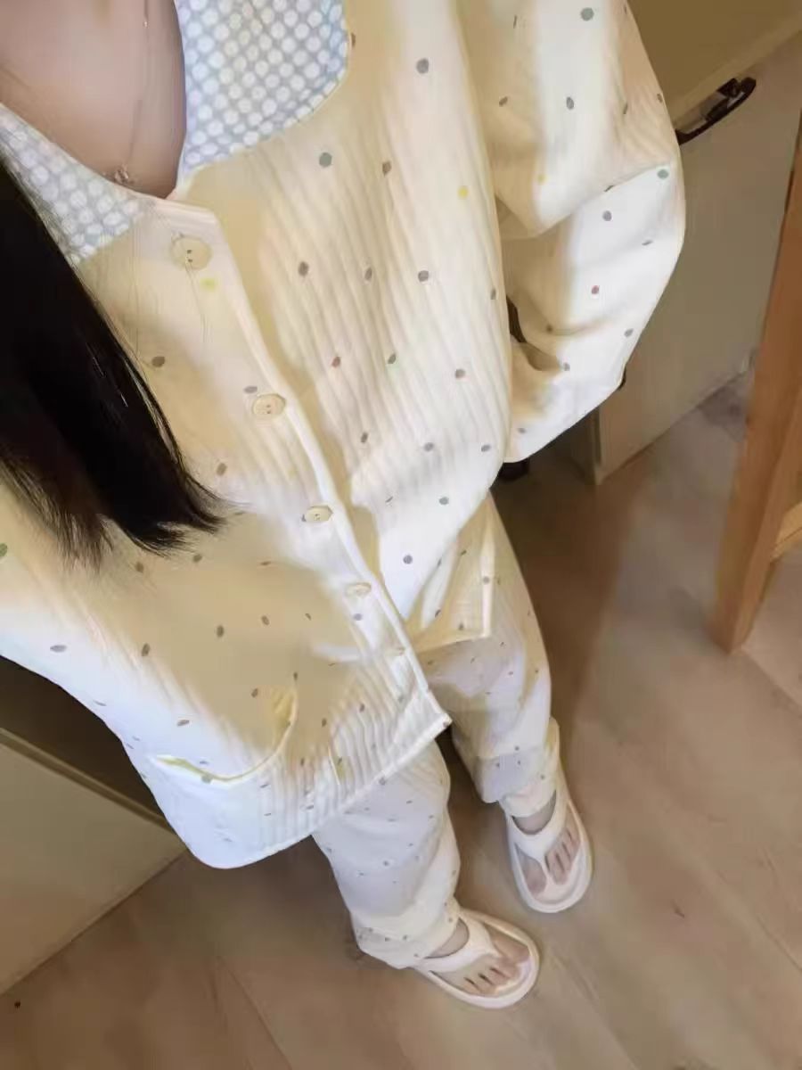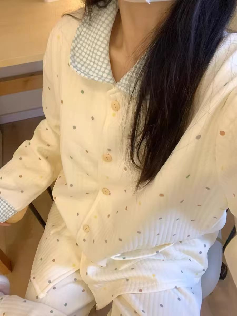 한국식 컬러 웨이브 도트 스트라이프 긴팔 잠옷 여성 가을 · 겨울 새 달콤한 스타일 코튼 퀼트 홈 의류 세트 아우터웨어스토어 가기