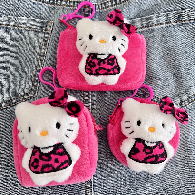 로즈 레드 레오파드 프린트 헬로키티 고양이 사각형 플러시 동전 지갑 휴대용 원형 이어폰 가방 귀여운 미니 가방 여성용스토어 가기