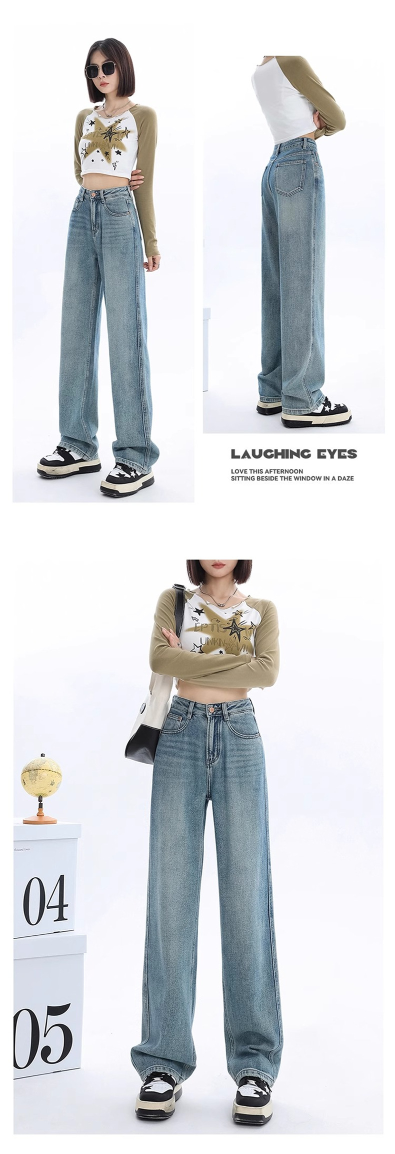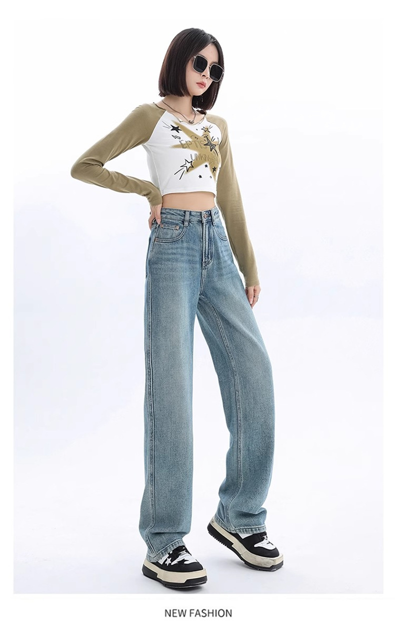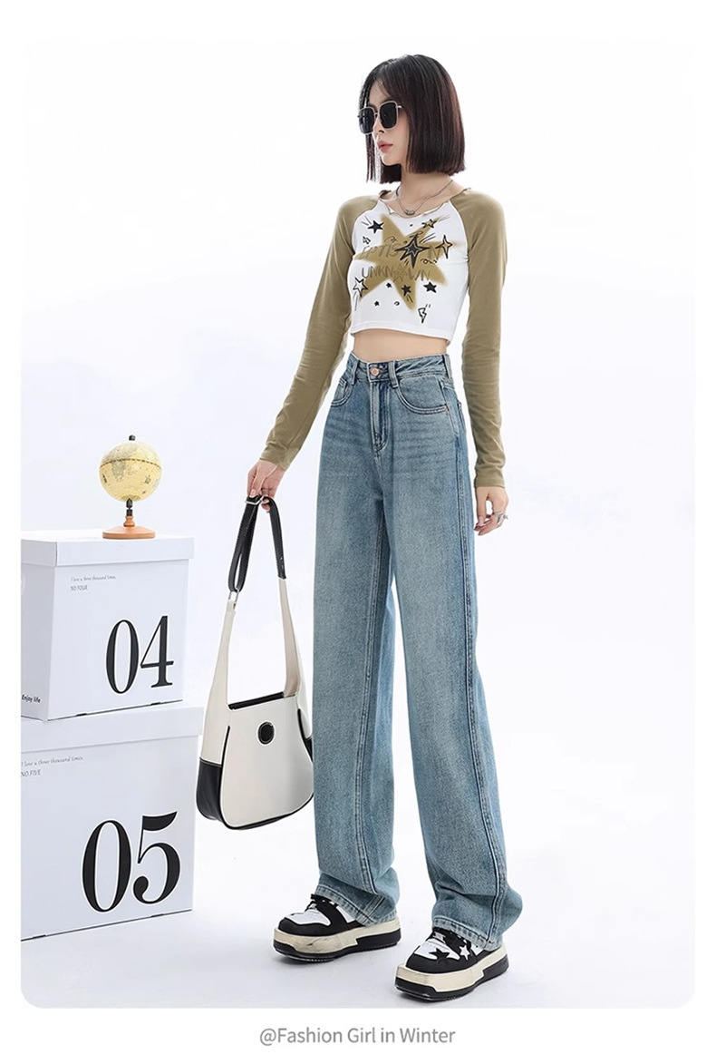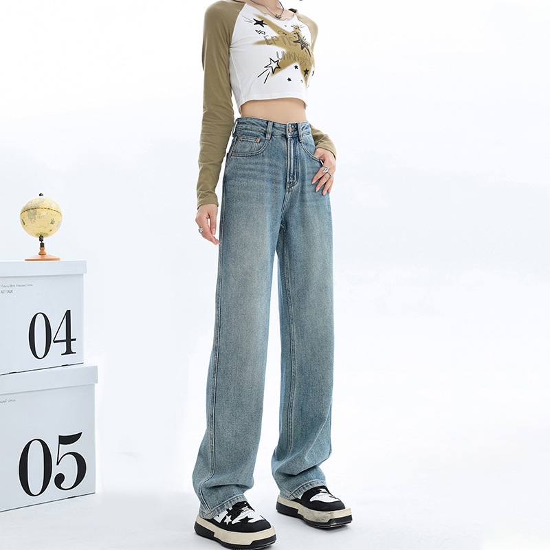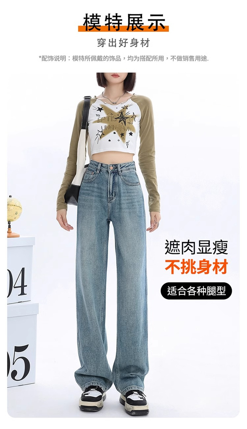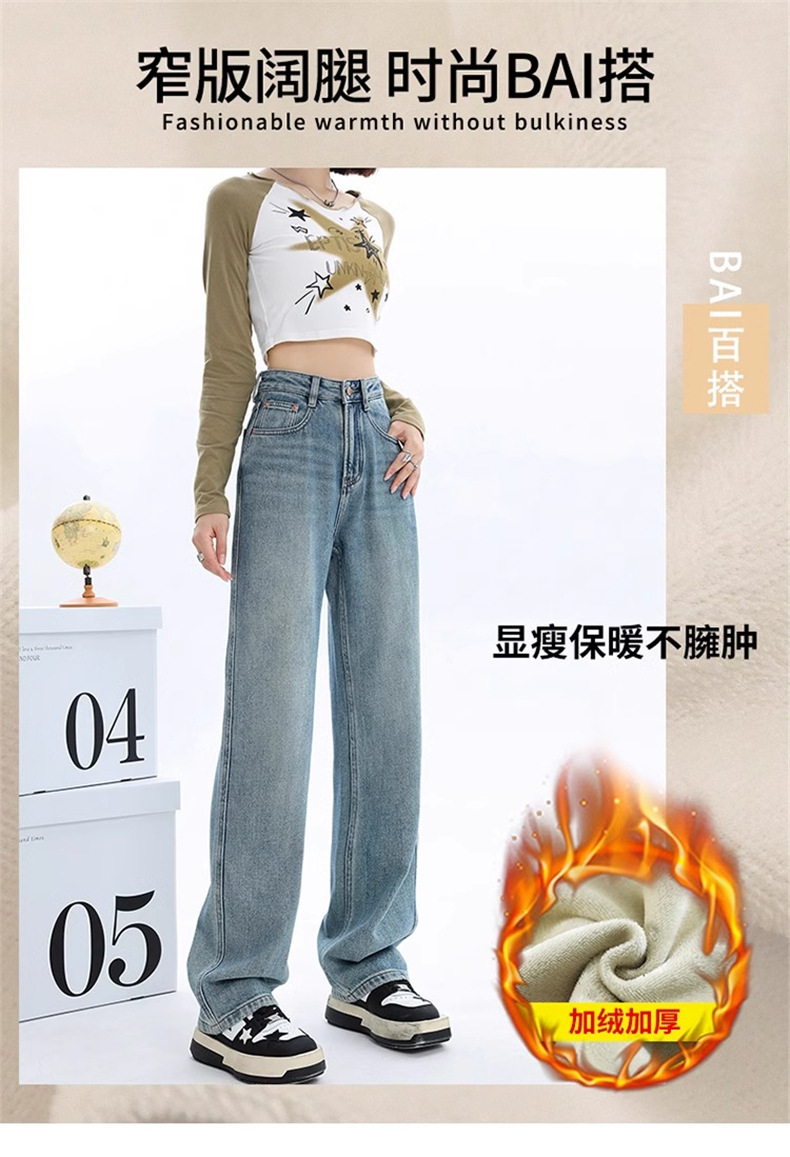 가을과 겨울 기모 넓은 다리 청바지 여성의 2024 새로운 기저귀 배 모양의 몸 느슨한 좁은 판 스트레이트 바지스토어 가기