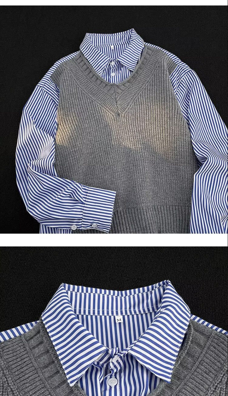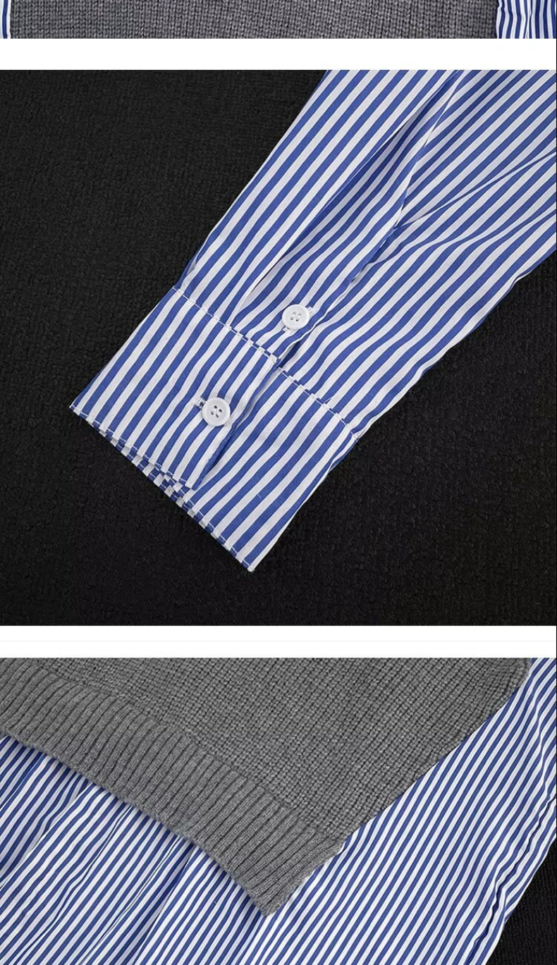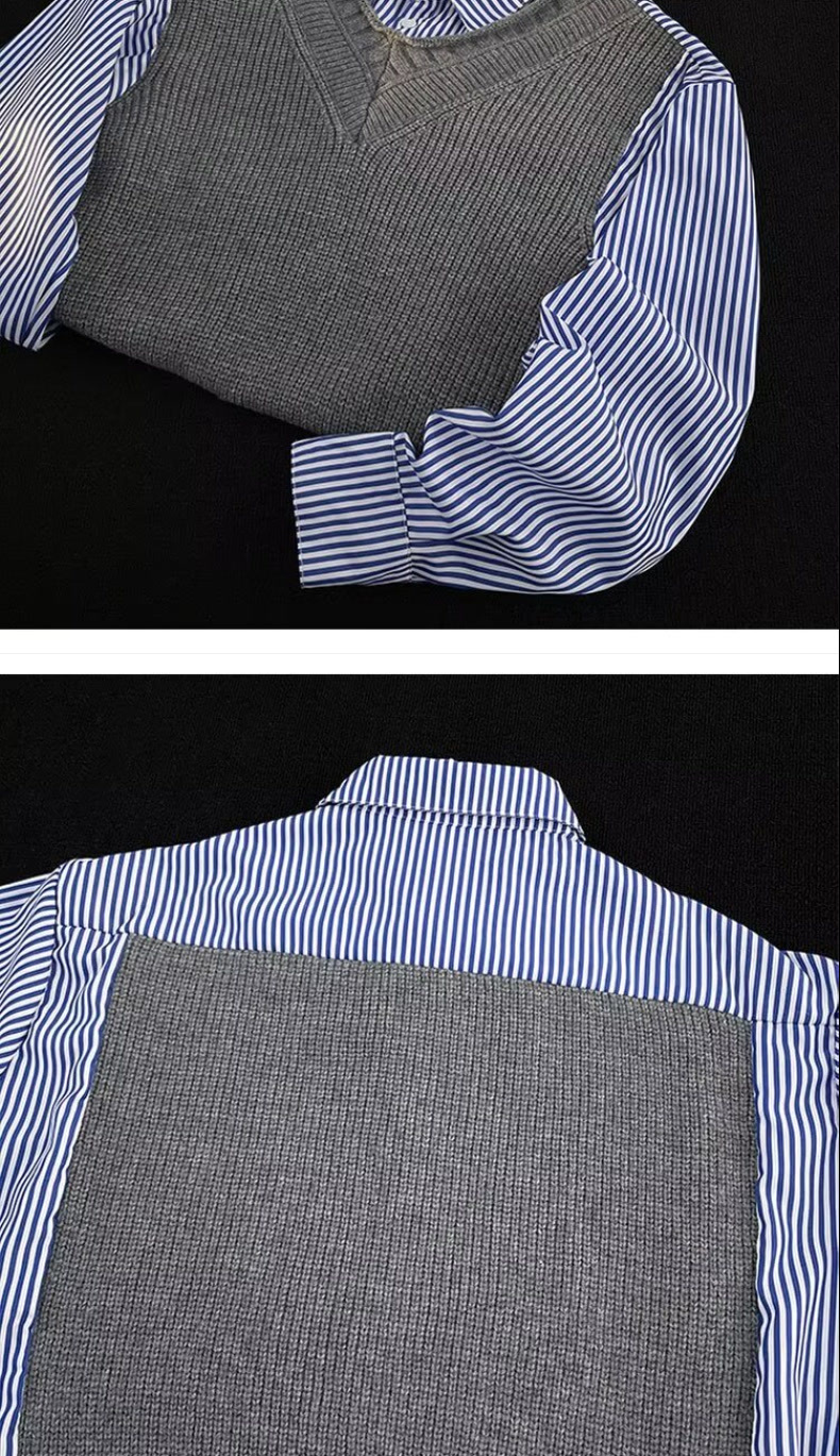 가짜 투피스 스트라이프 스티칭 니트웨어 남자 가을 겨울 새 한국식 하이 엔드 센스 루즈 캐주얼 올 매치 옷깃 스웨터스토어 가기