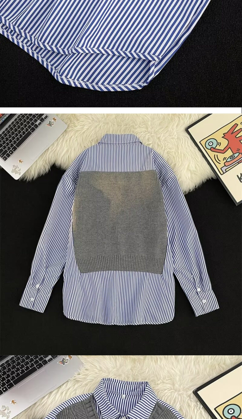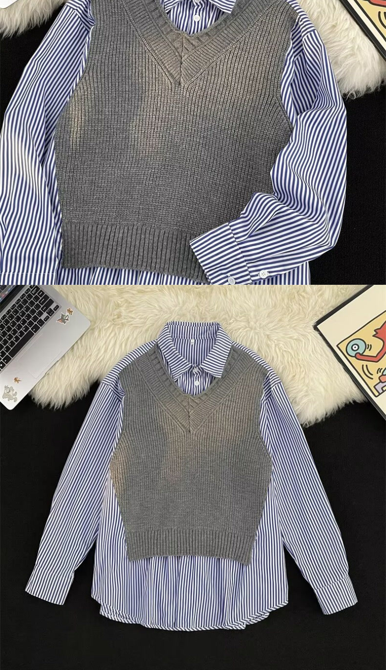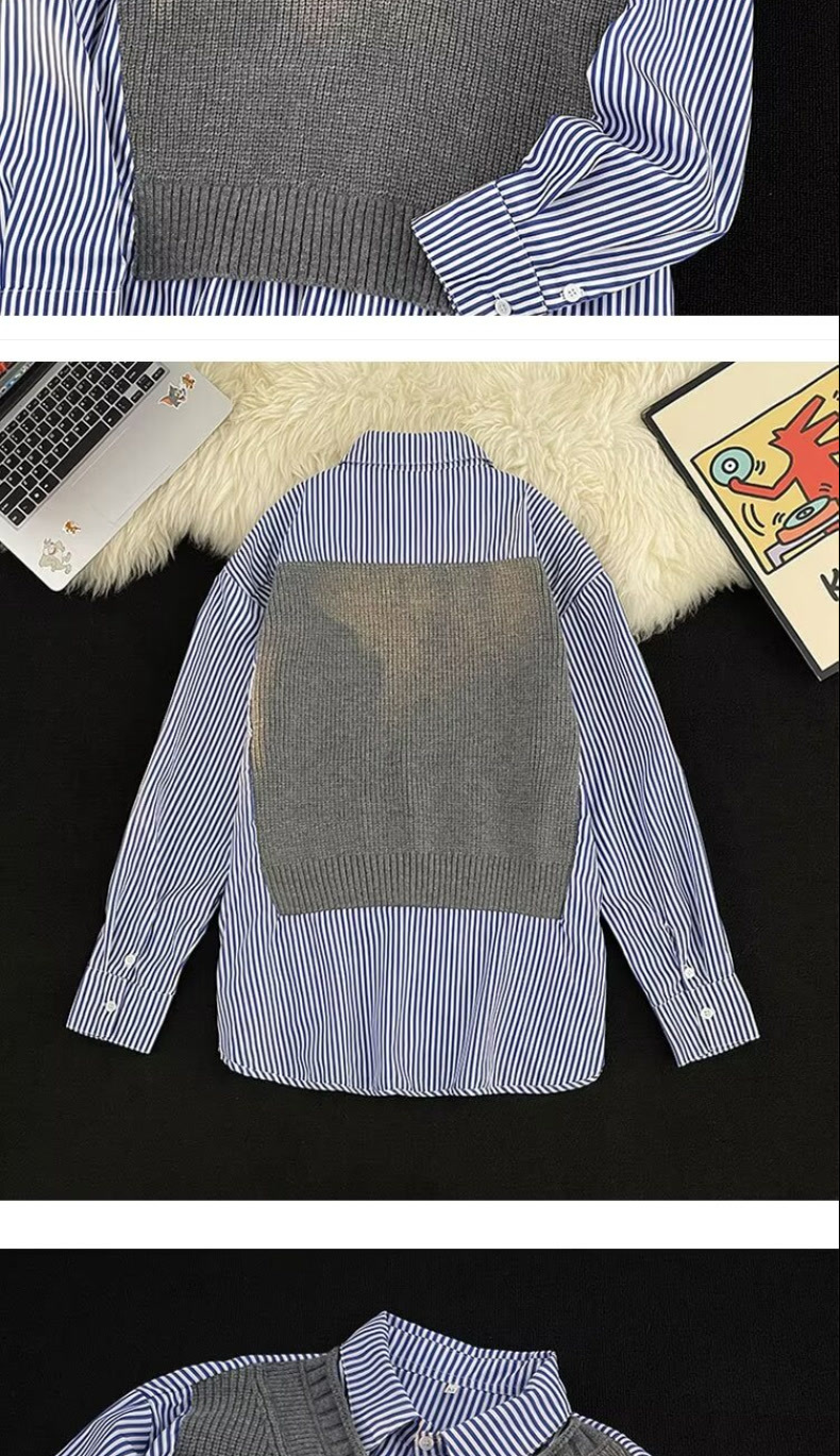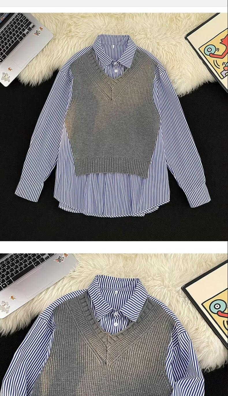 가짜 투피스 스트라이프 스티칭 니트웨어 남자 가을 겨울 새 한국식 하이 엔드 센스 루즈 캐주얼 올 매치 옷깃 스웨터스토어 가기
