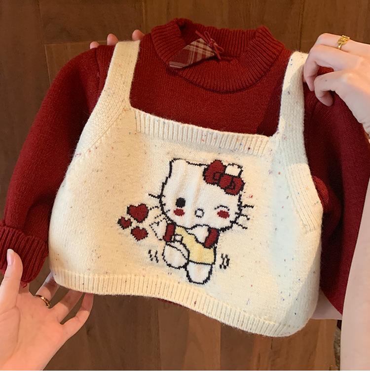 달콤한 소녀 스타일의 두꺼운 스웨터, 가짜 투피스 디자인, 새로운 스타일의 아기 소녀용 귀여운 올인원 스웨터