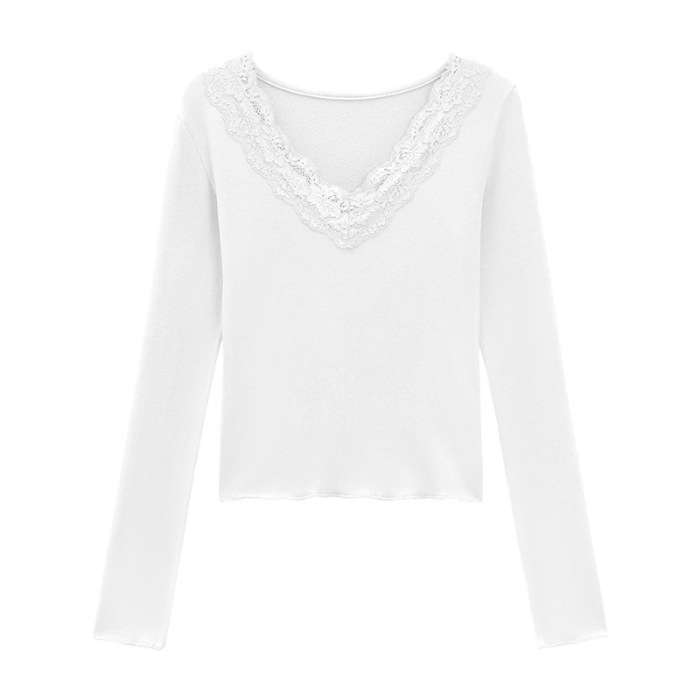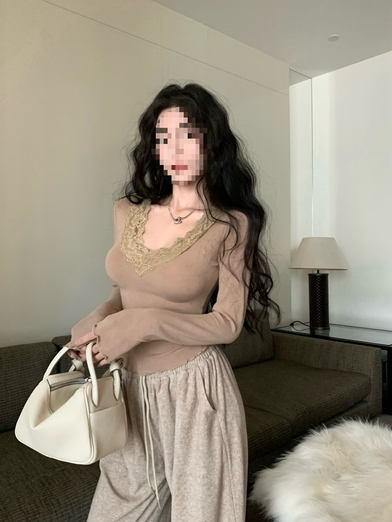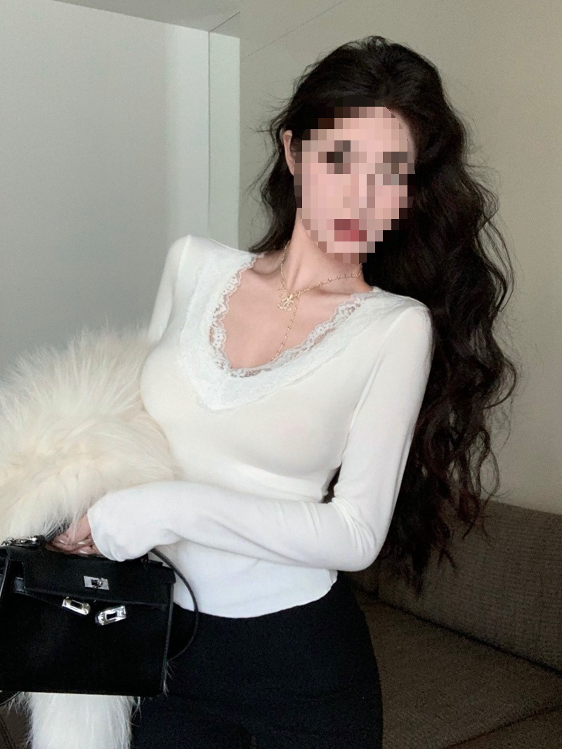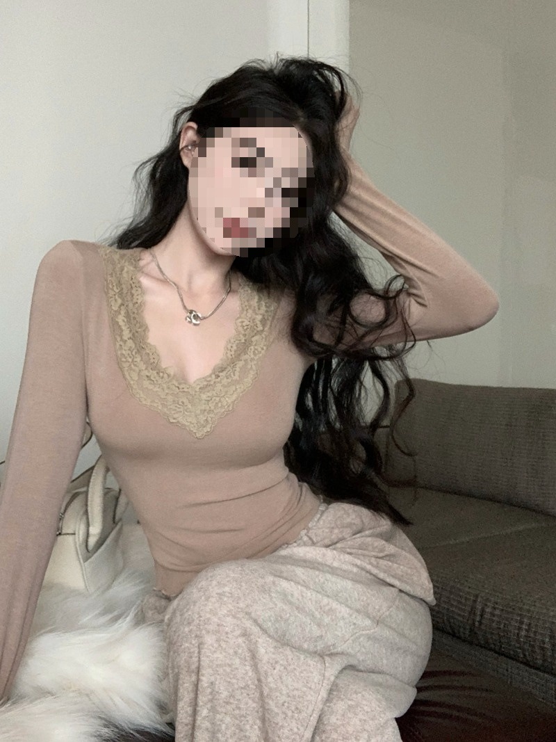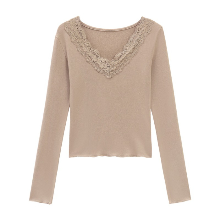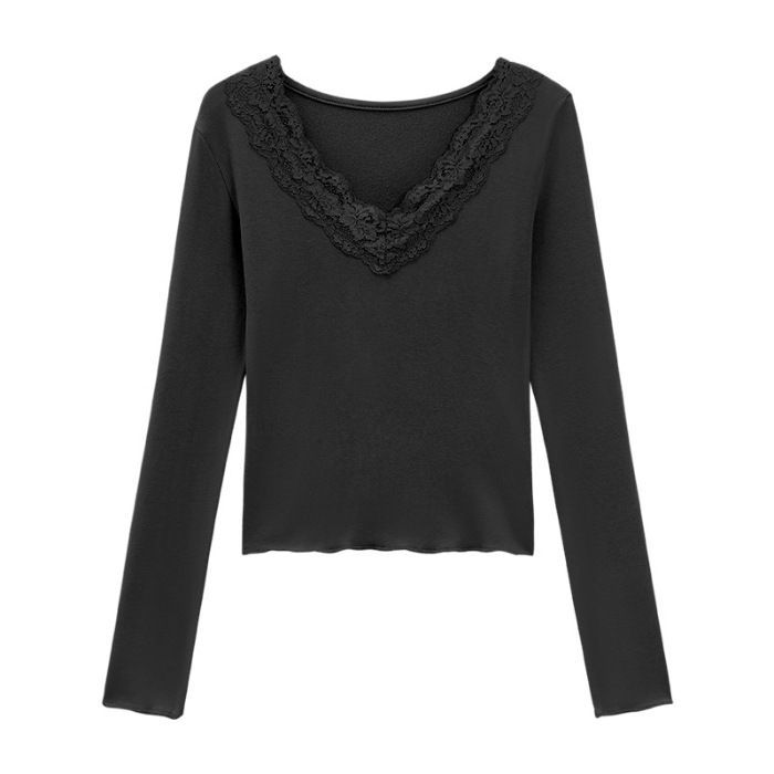 국경 도매 가을과 겨울 따뜻한 스레드 벨벳 순수 레이스 V 넥 슬림 슬림 짧은 긴 소매 티셔츠 여성용