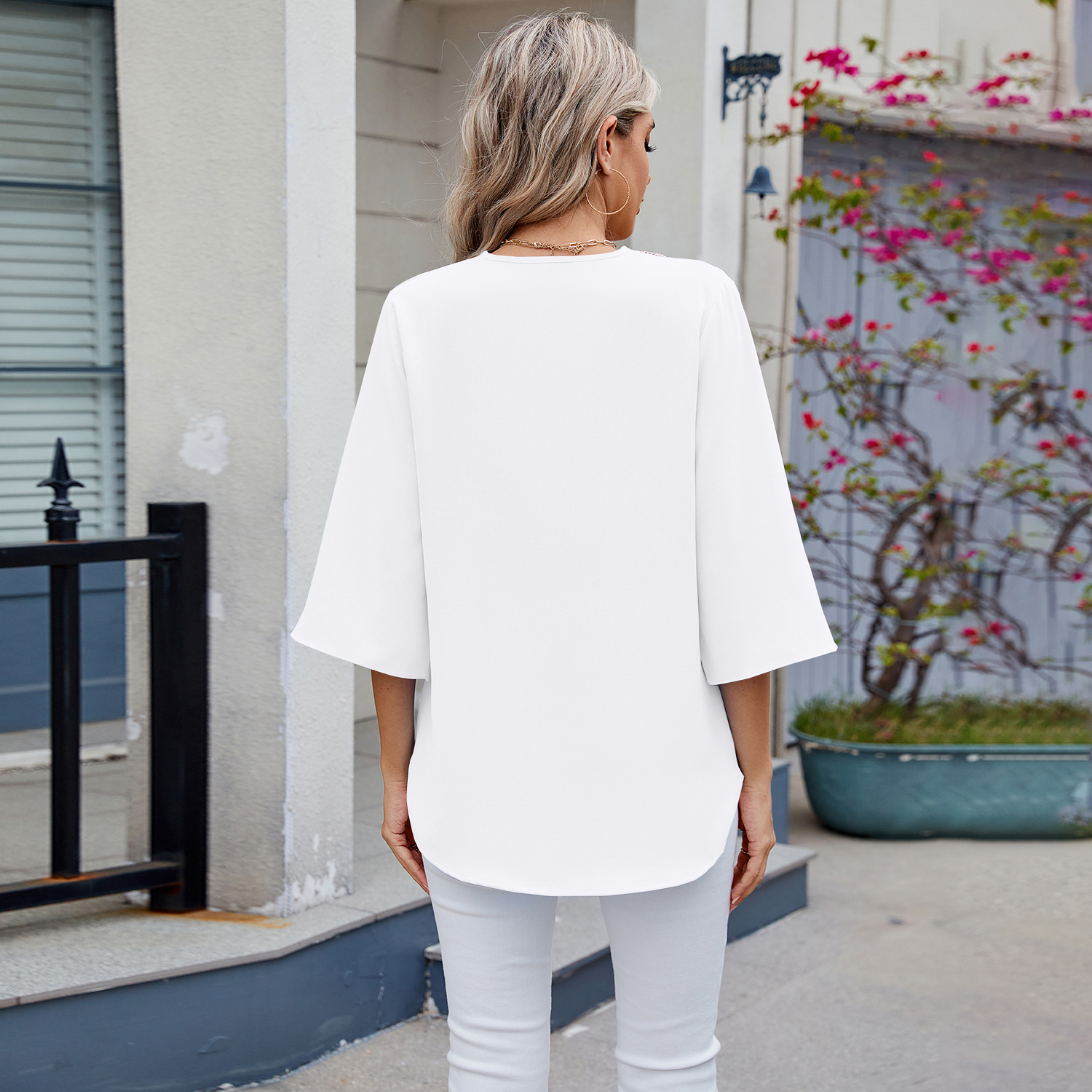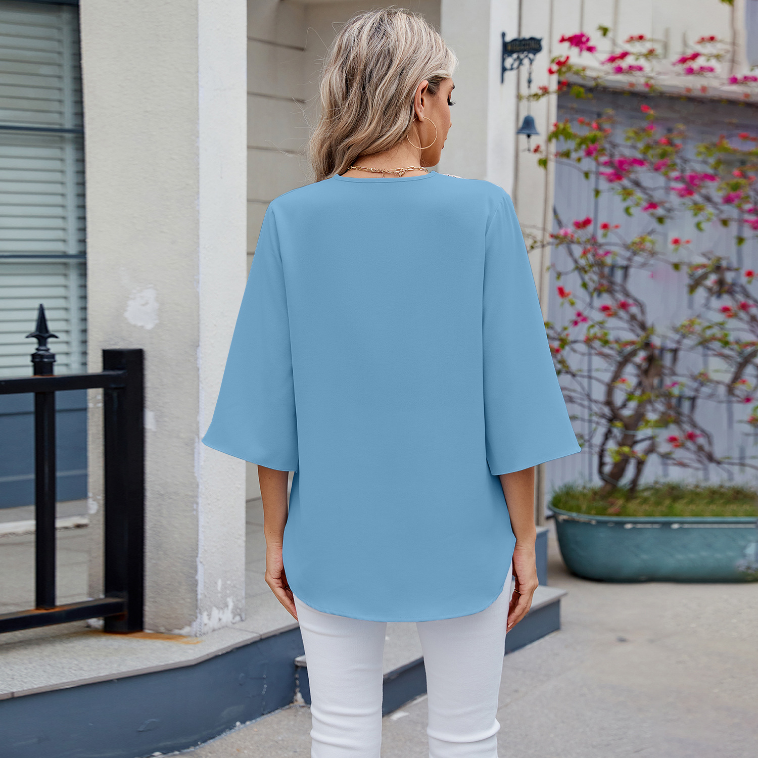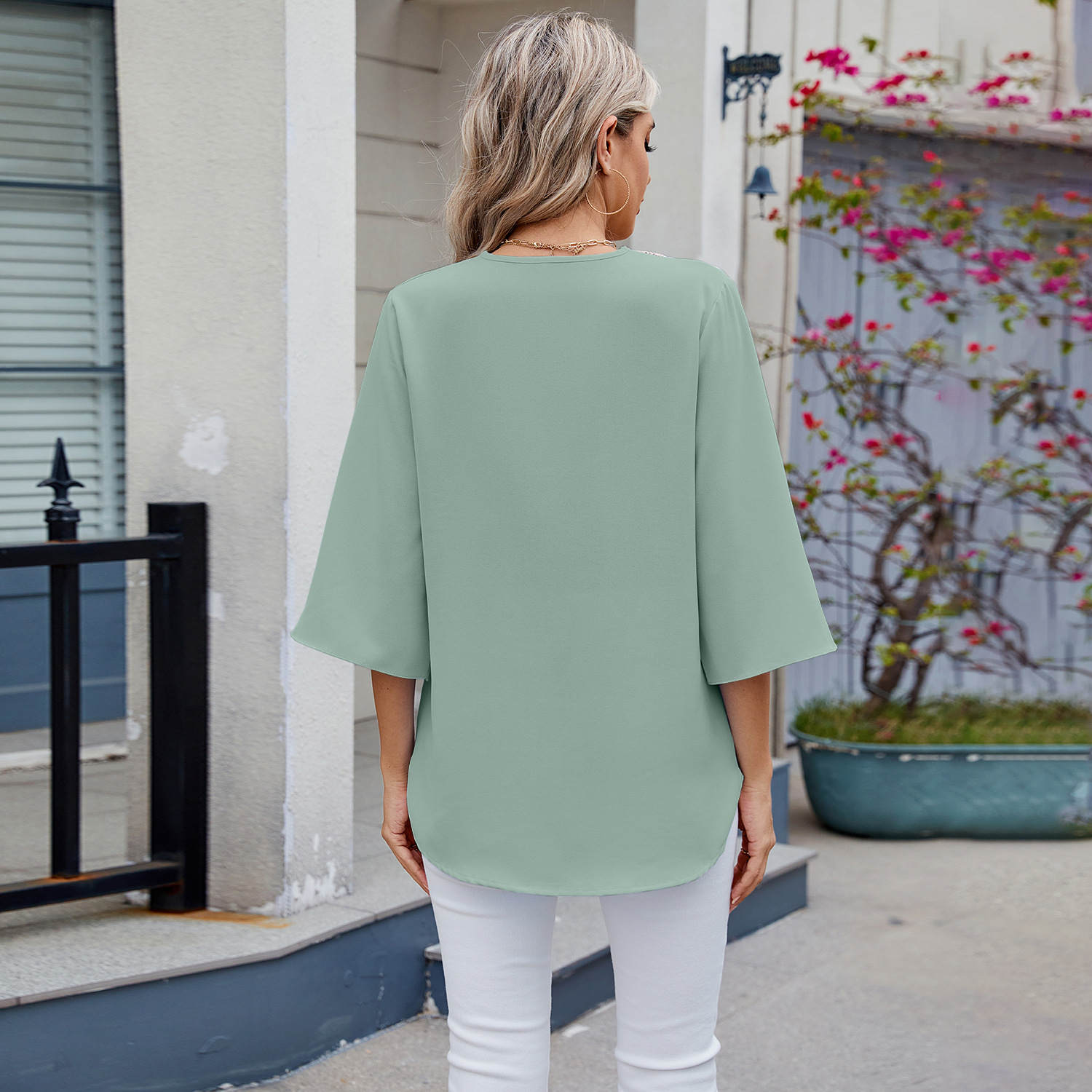 아마존 유럽과 미국 국경 대외 무역 2025 봄과 여름 새로운 단색 V 넥 소매 느슨한 쉬폰 셔츠 여성용 탑스토어 가기