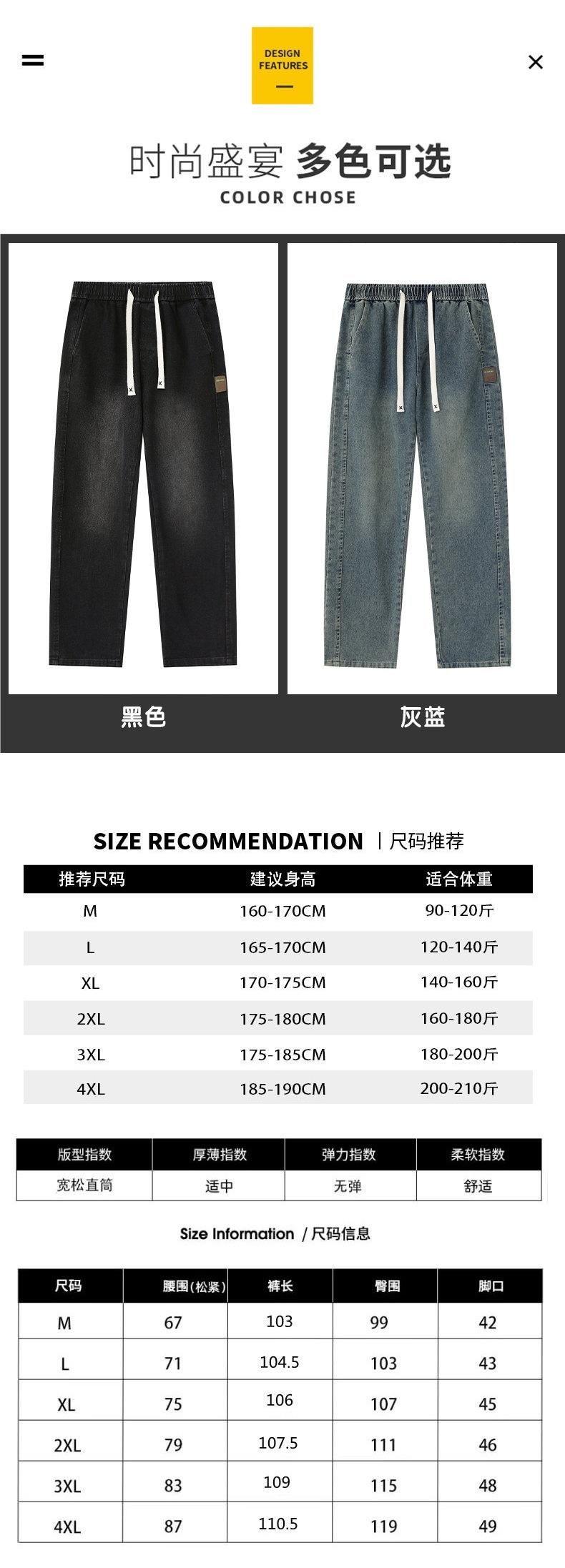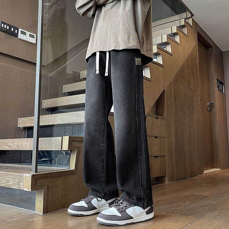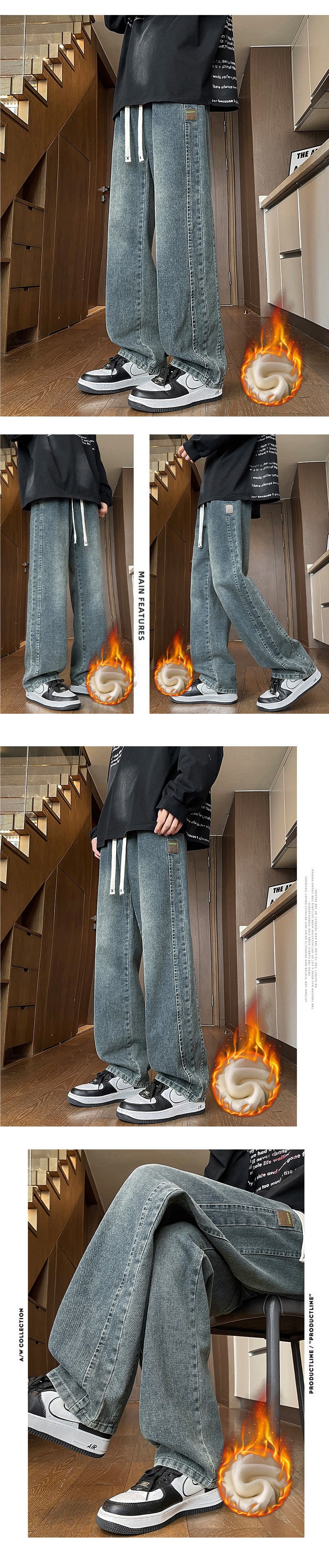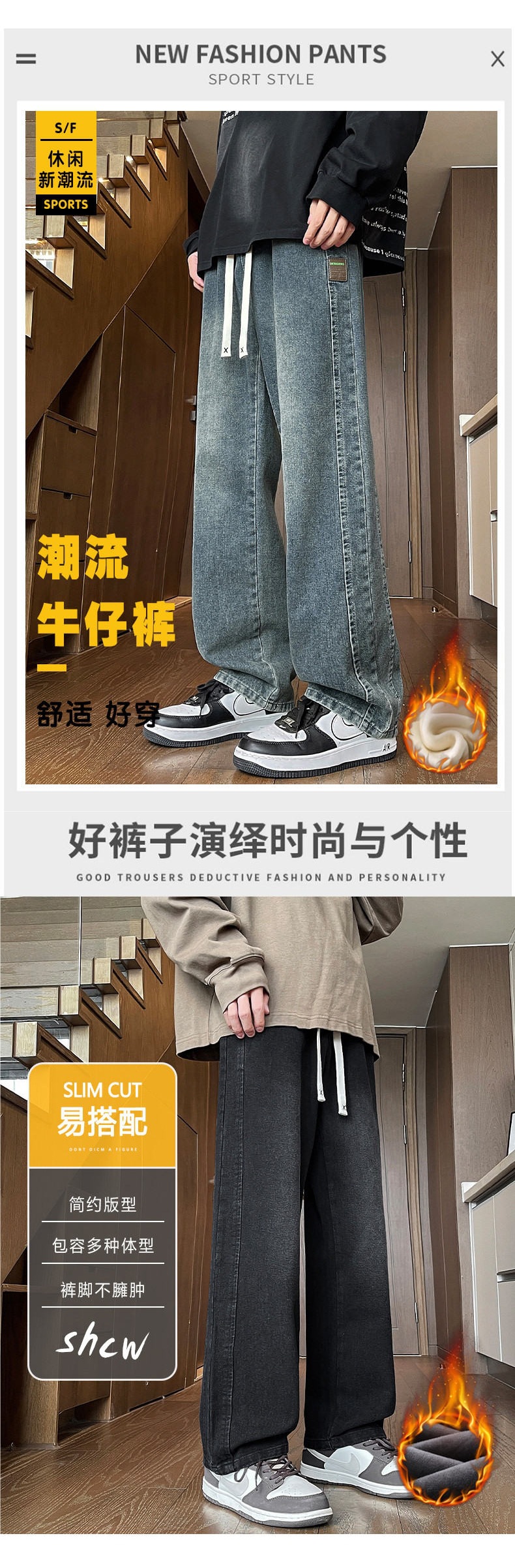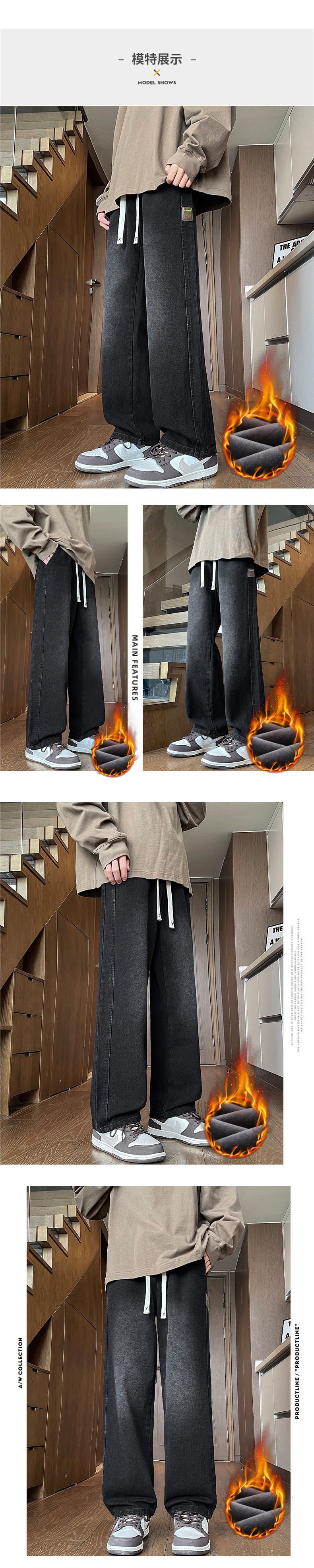 기모 청바지 남자 가을과 겨울 2024 새로운 넓은 다리 바지 십대 소년을위한 똑바로 두꺼운 바지스토어 가기