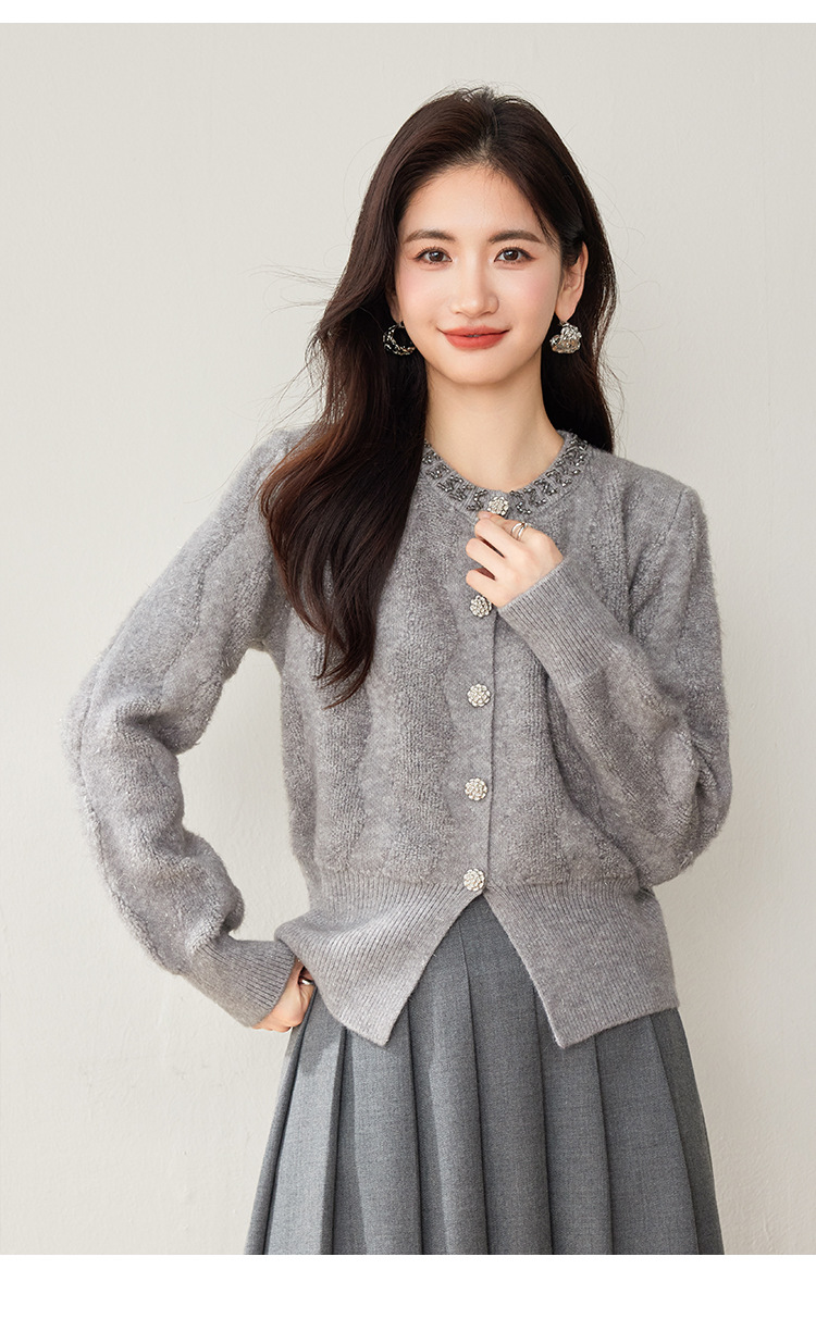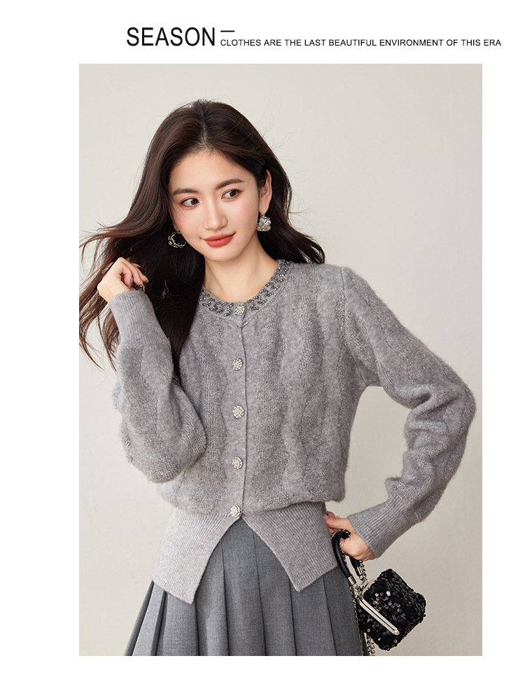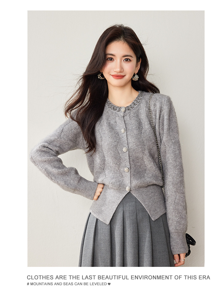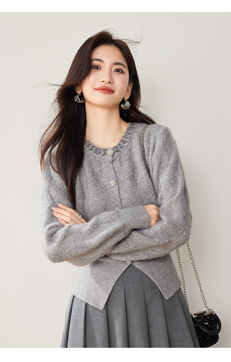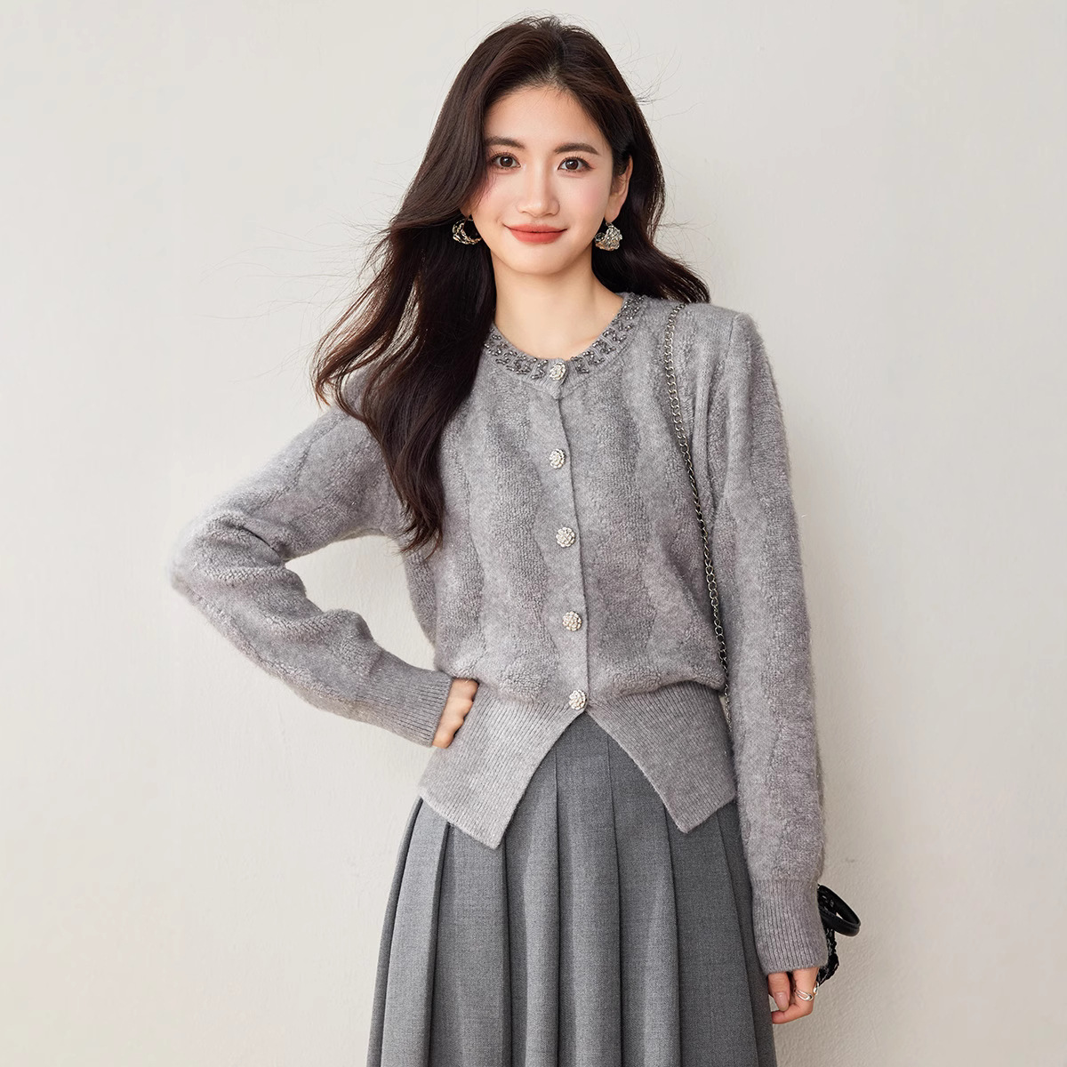 2024 겨울 새 스타일 샤넬 스타일 패션 그레이 분할 디자인 센스 로즈 버튼 니트 카디건 스웨터