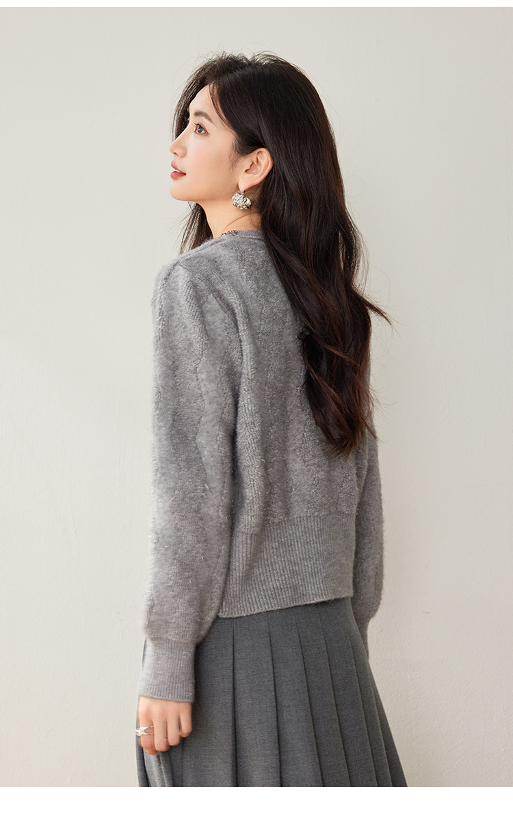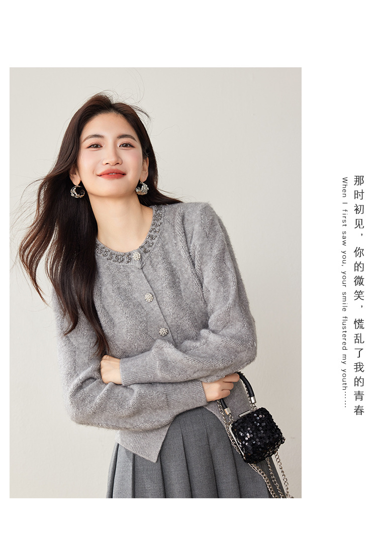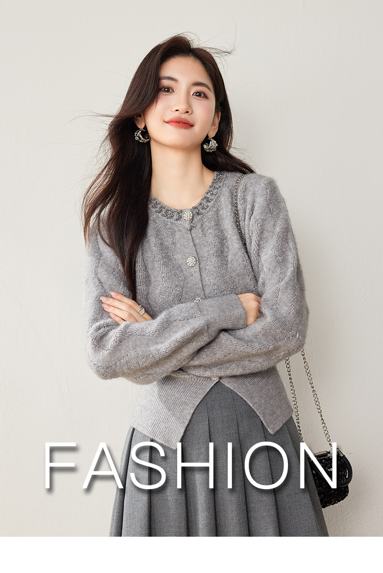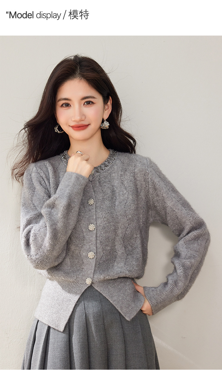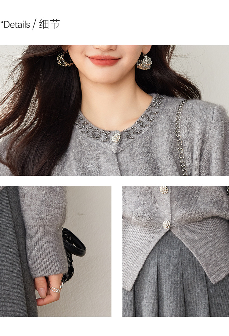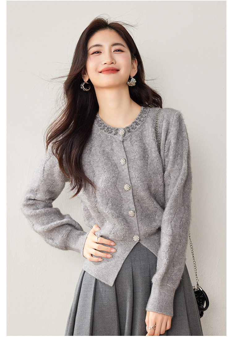 2024 겨울 새 스타일 샤넬 스타일 패션 그레이 분할 디자인 센스 로즈 버튼 니트 카디건 스웨터스토어 가기