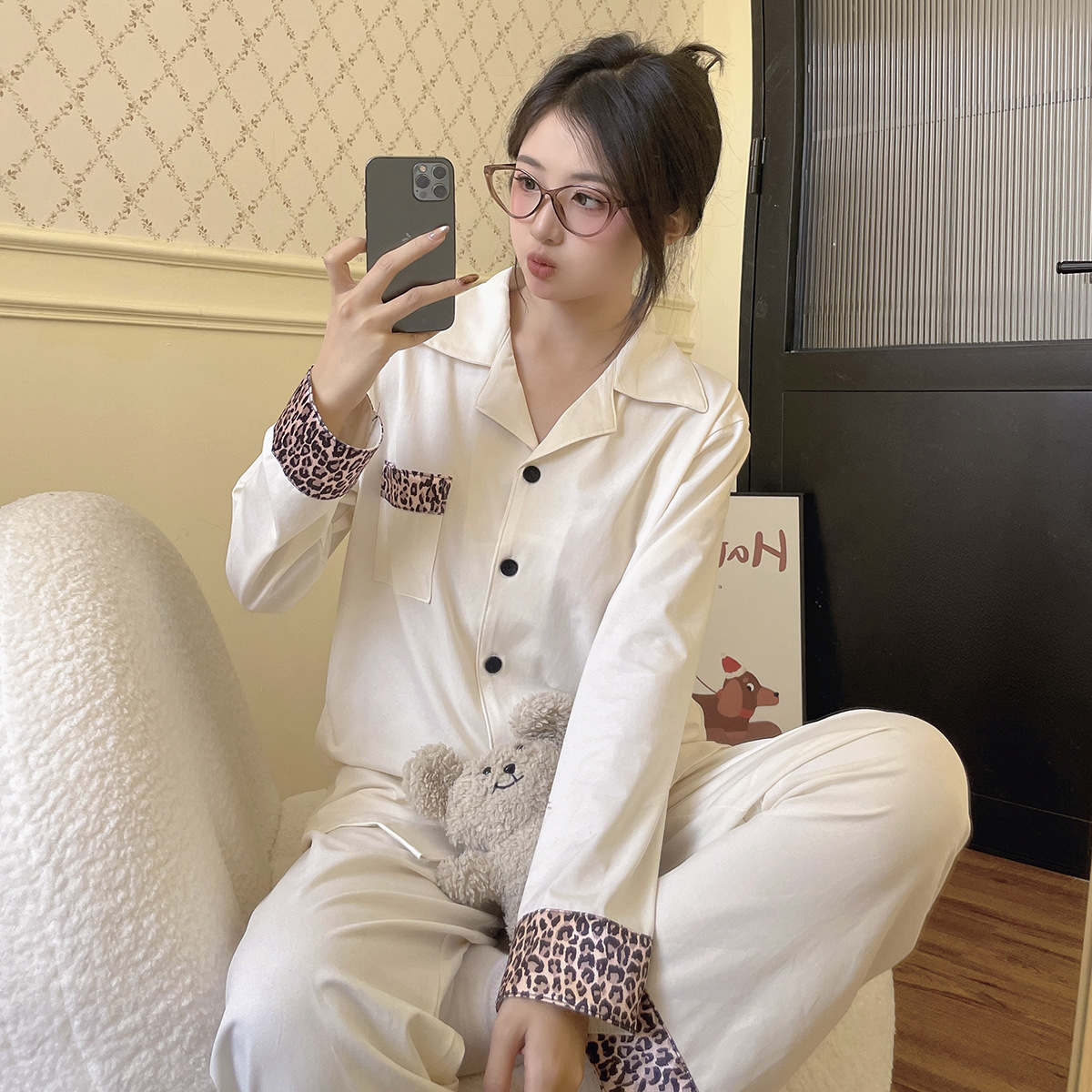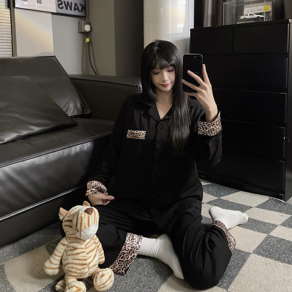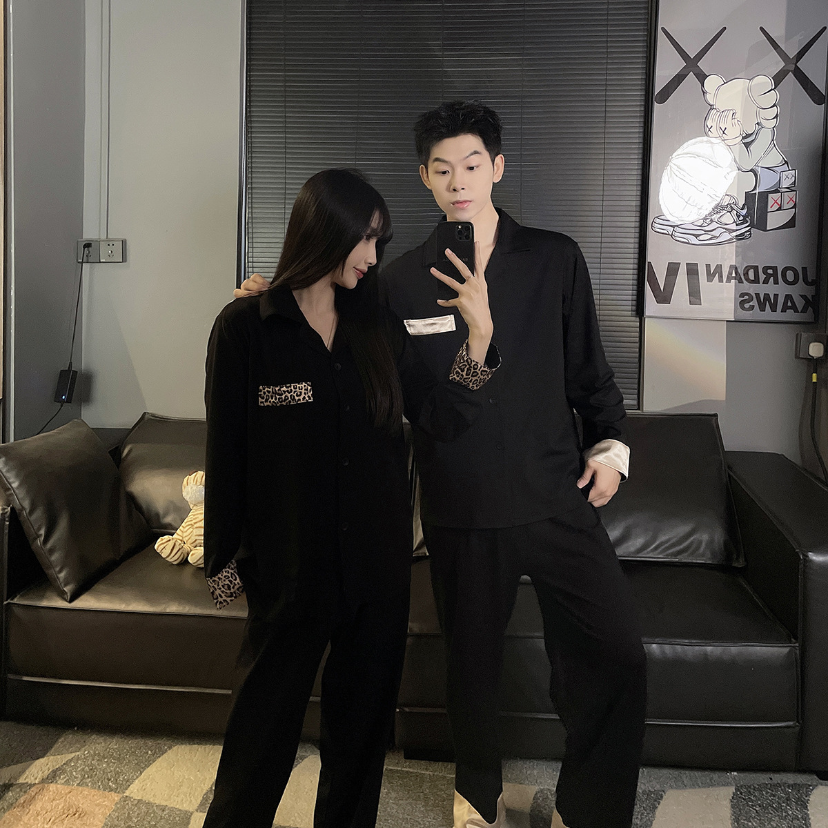 커플 잠옷 여성용 봄 가을 긴팔 긴바지 순면 블랙 고급스러운 남성용 가디건 외출복 세트스토어 가기