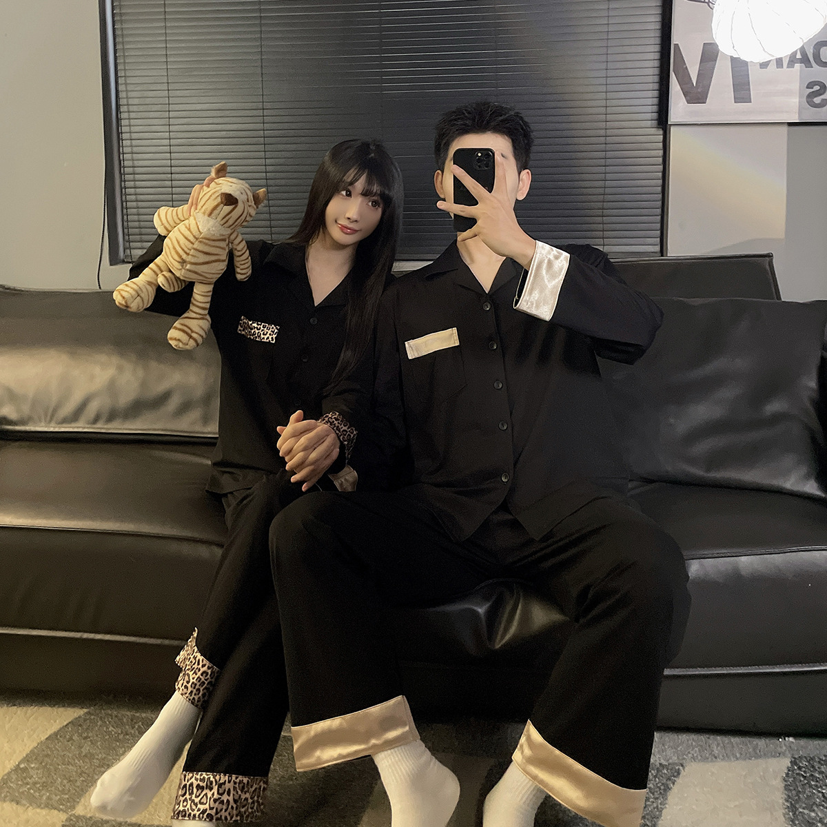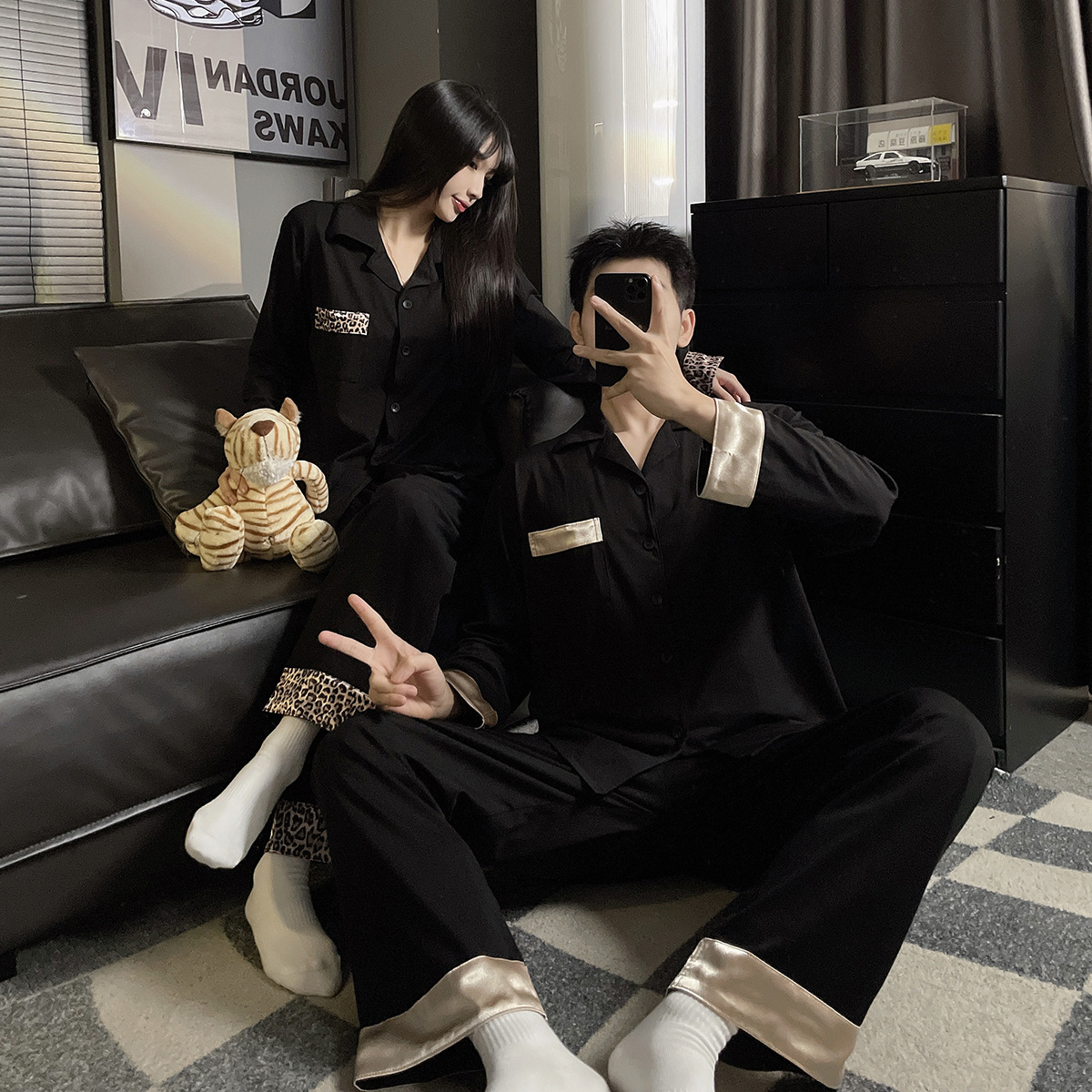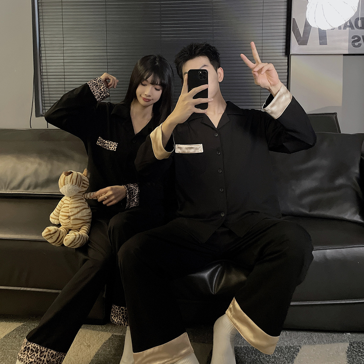 커플 잠옷 여성용 봄 가을 긴팔 긴바지 순면 블랙 고급스러운 남성용 가디건 외출복 세트
