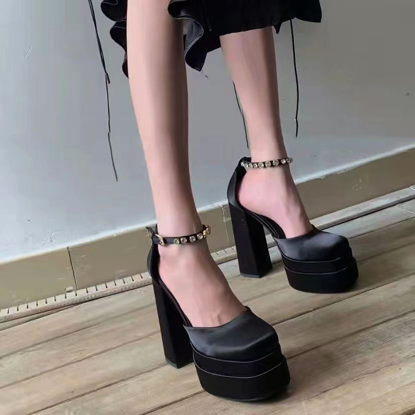 2024 봄 새로운 유럽과 미국 스타일 슈퍼 하이힐 라인스톤 여성 신발 더블 레이어 방수 플랫폼 새틴 스퀘어 할로우 바오터우 샌들스토어 가기