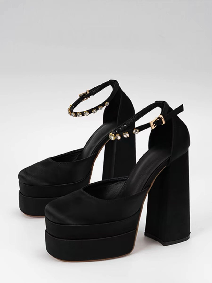 2024 봄 새로운 유럽과 미국 스타일 슈퍼 하이힐 라인스톤 여성 신발 더블 레이어 방수 플랫폼 새틴 스퀘어 할로우 바오터우 샌들