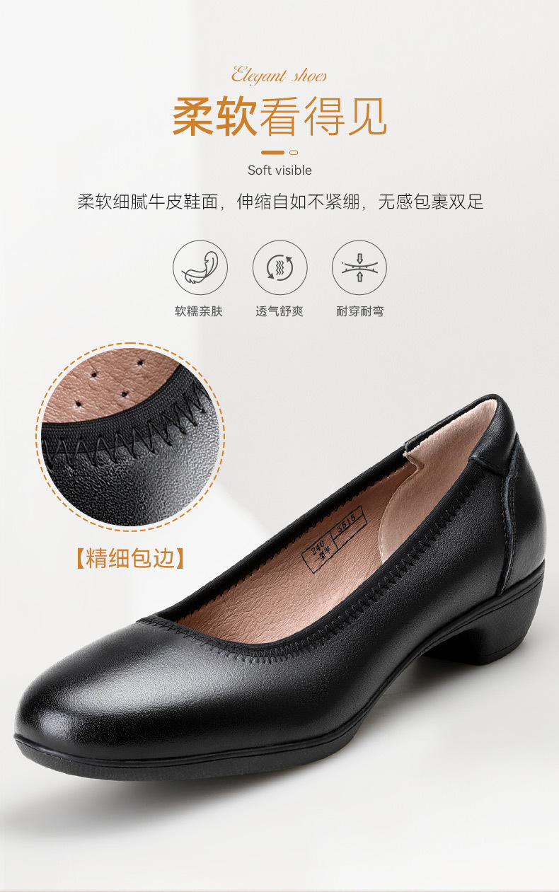 Jihua 3515 여성용 얕은 입 가죽 신발 새로운 올매치 가죽 두꺼운 힐 부드러운 바닥 작업 신발 장시간 스탠드 피곤하지 않은 전문 신발