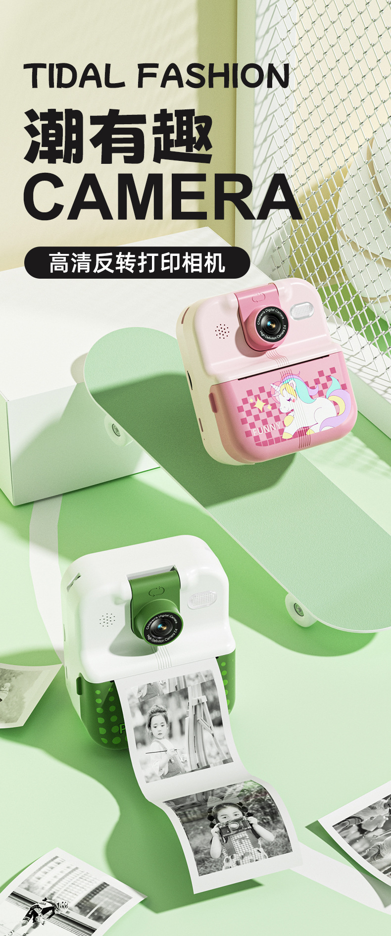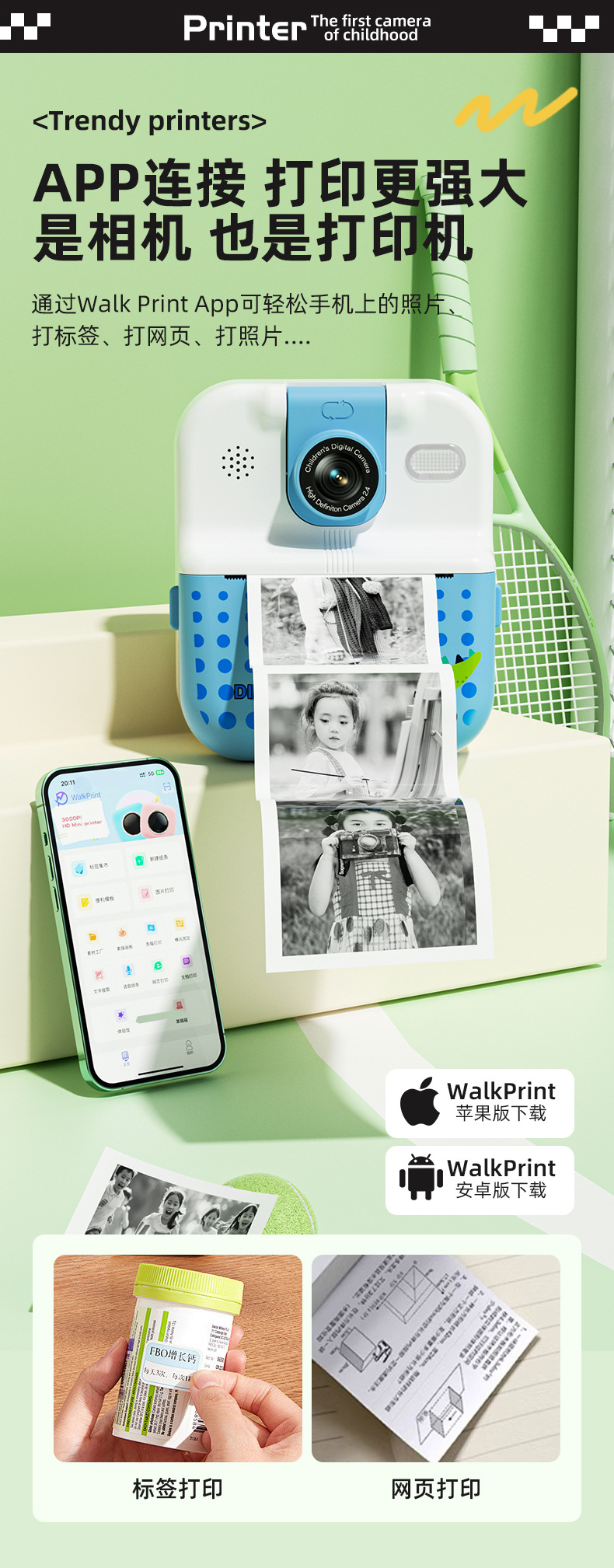 产品功能:蓝牙APP连接、DIY大头贴、相框、多种滤镜、即拍即得