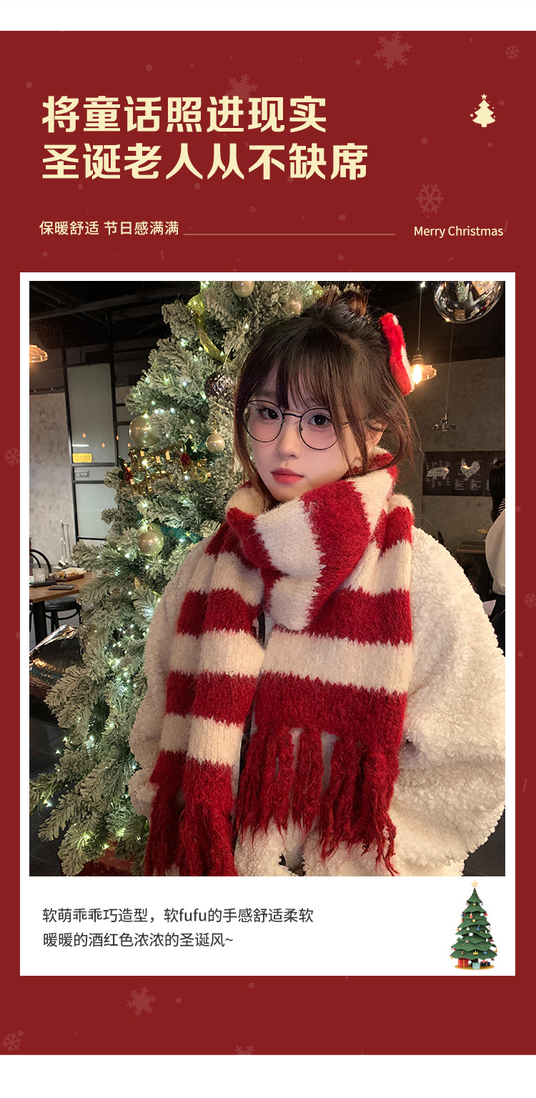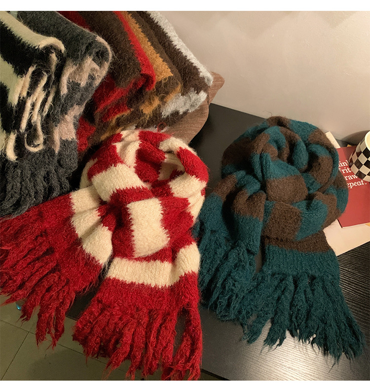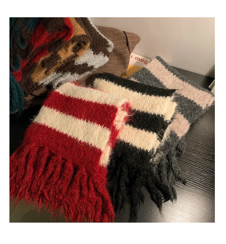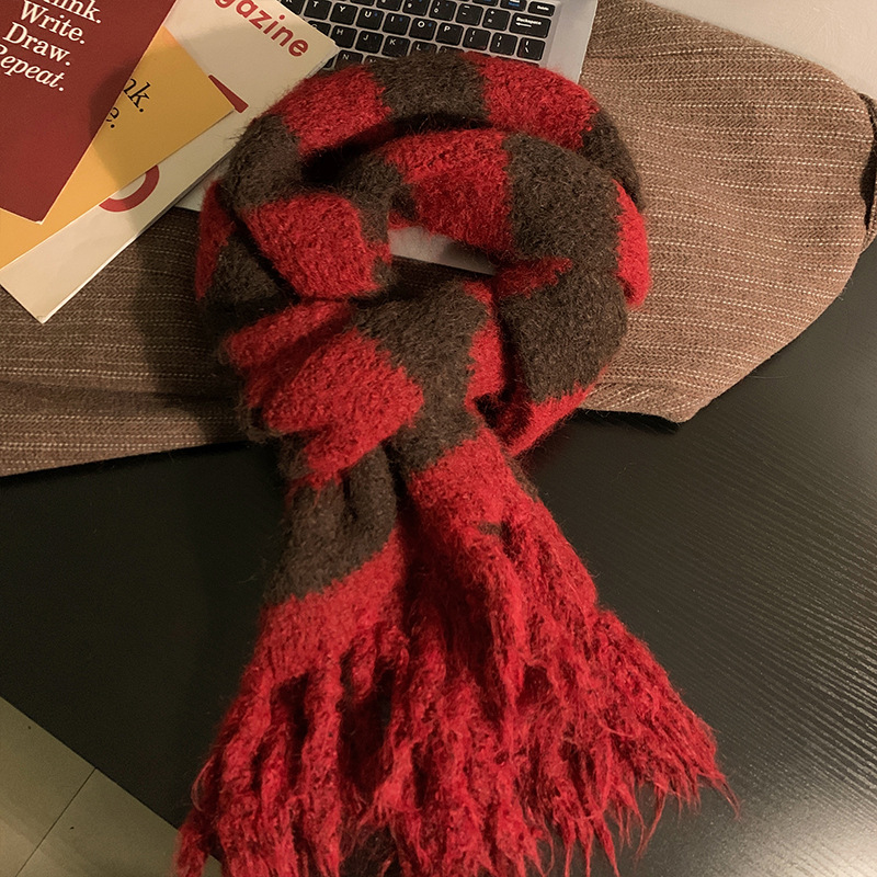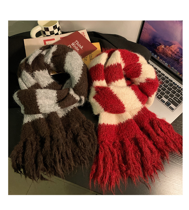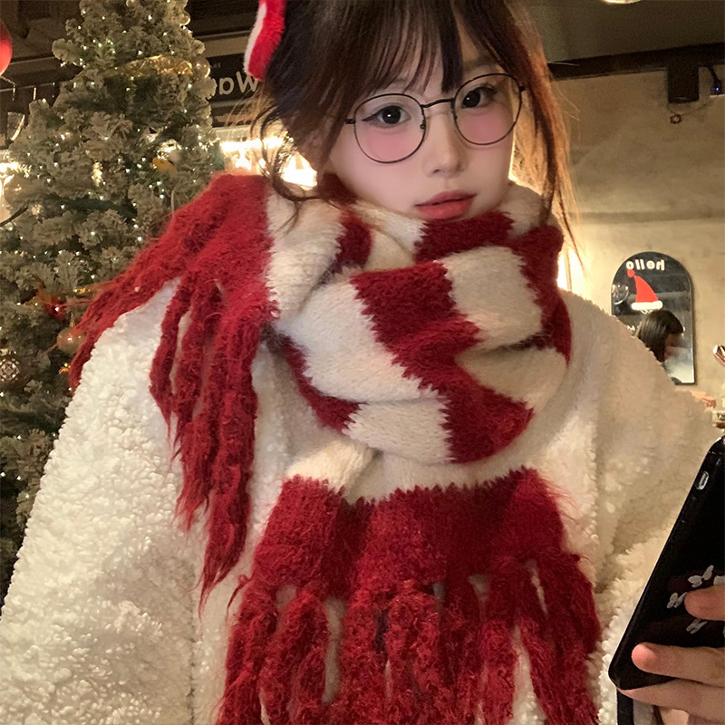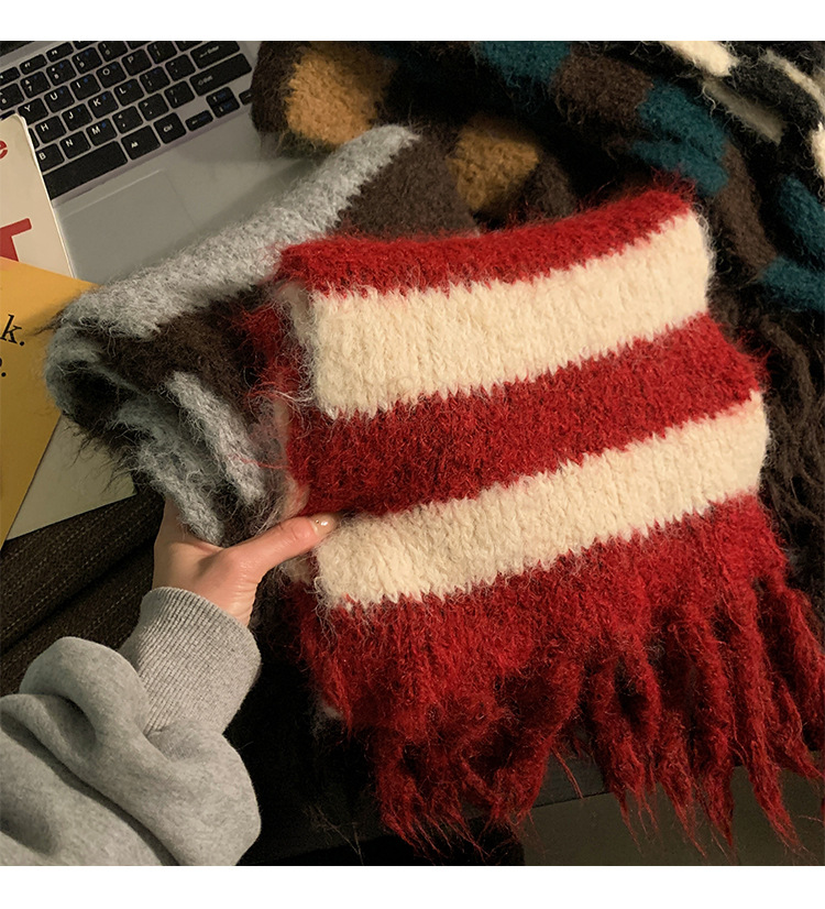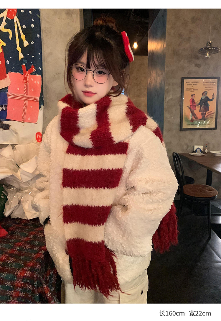 빈티지 레드 스트라이프 니트 스카프 여자 가을 겨울 2024 한국 스타일 분위기 커플의 올 매치 따뜻한 스카프스토어 가기