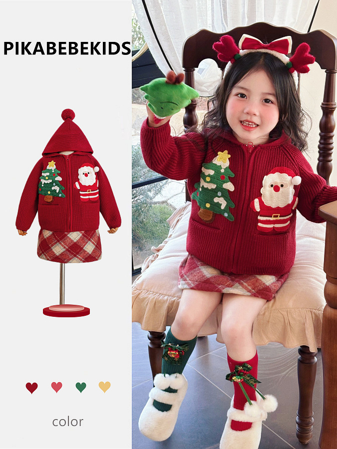 크리스마스 스웨터 코트 소녀 겨울 두꺼운 아동복 3 차원 자수 후드 카디건 격자 무늬 스커트스토어 가기