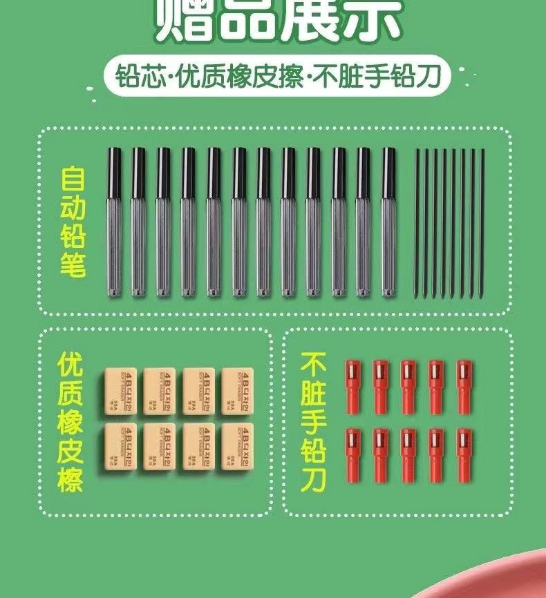 • 빨간색과 녹색 연필 5개 + 심 80개 + 지우개 1개