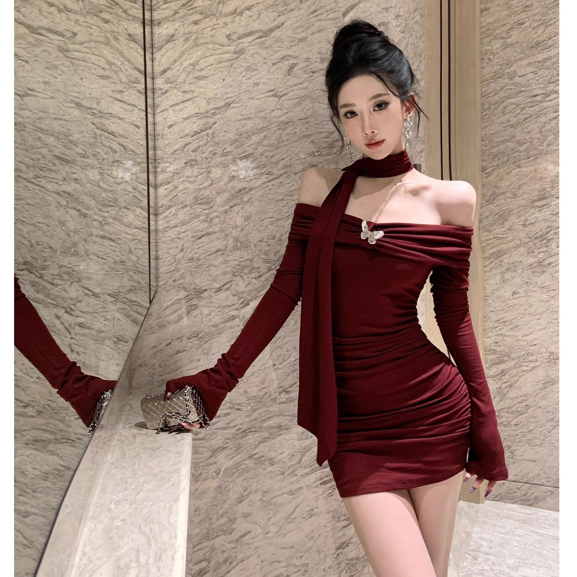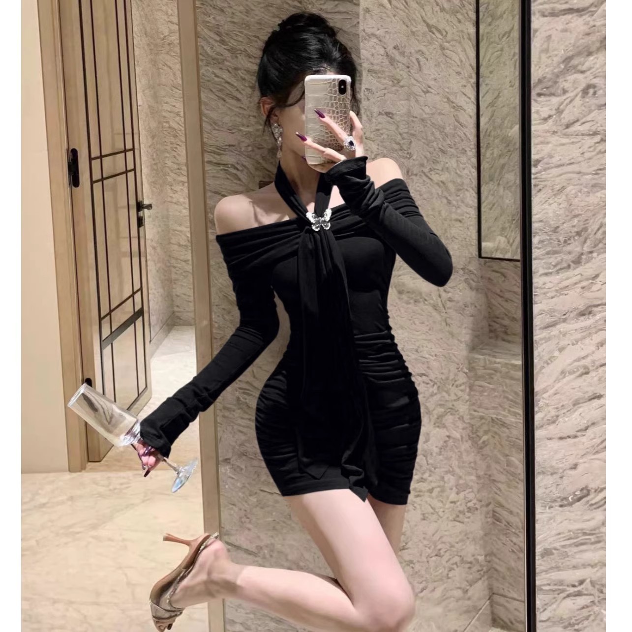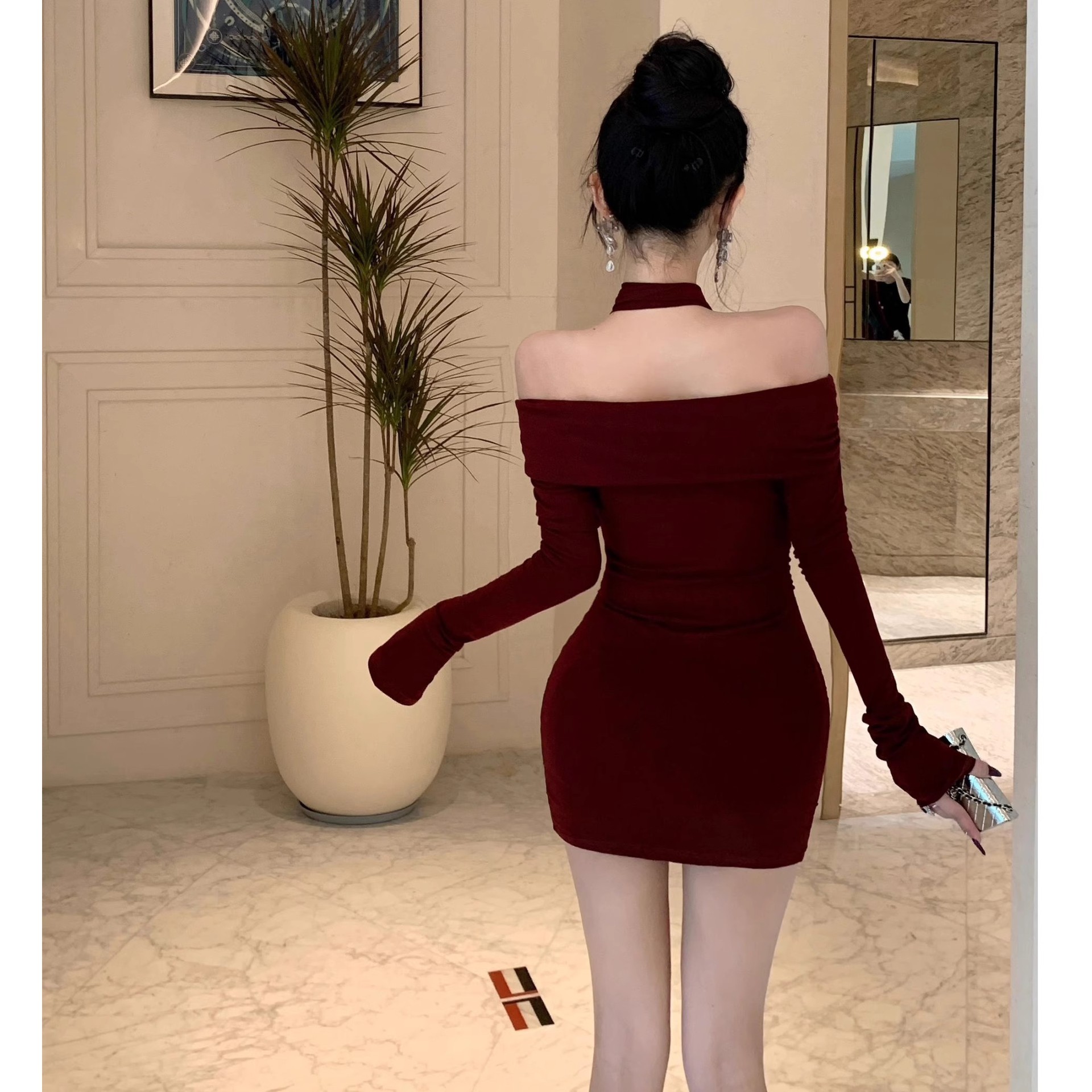 매달린 목 보라색 긴 소매 원피스 여성의 가을과 겨울 순수한 섹시한 슬림 엉덩이 스커트 숄더 사교계 내부 스커트스토어 가기