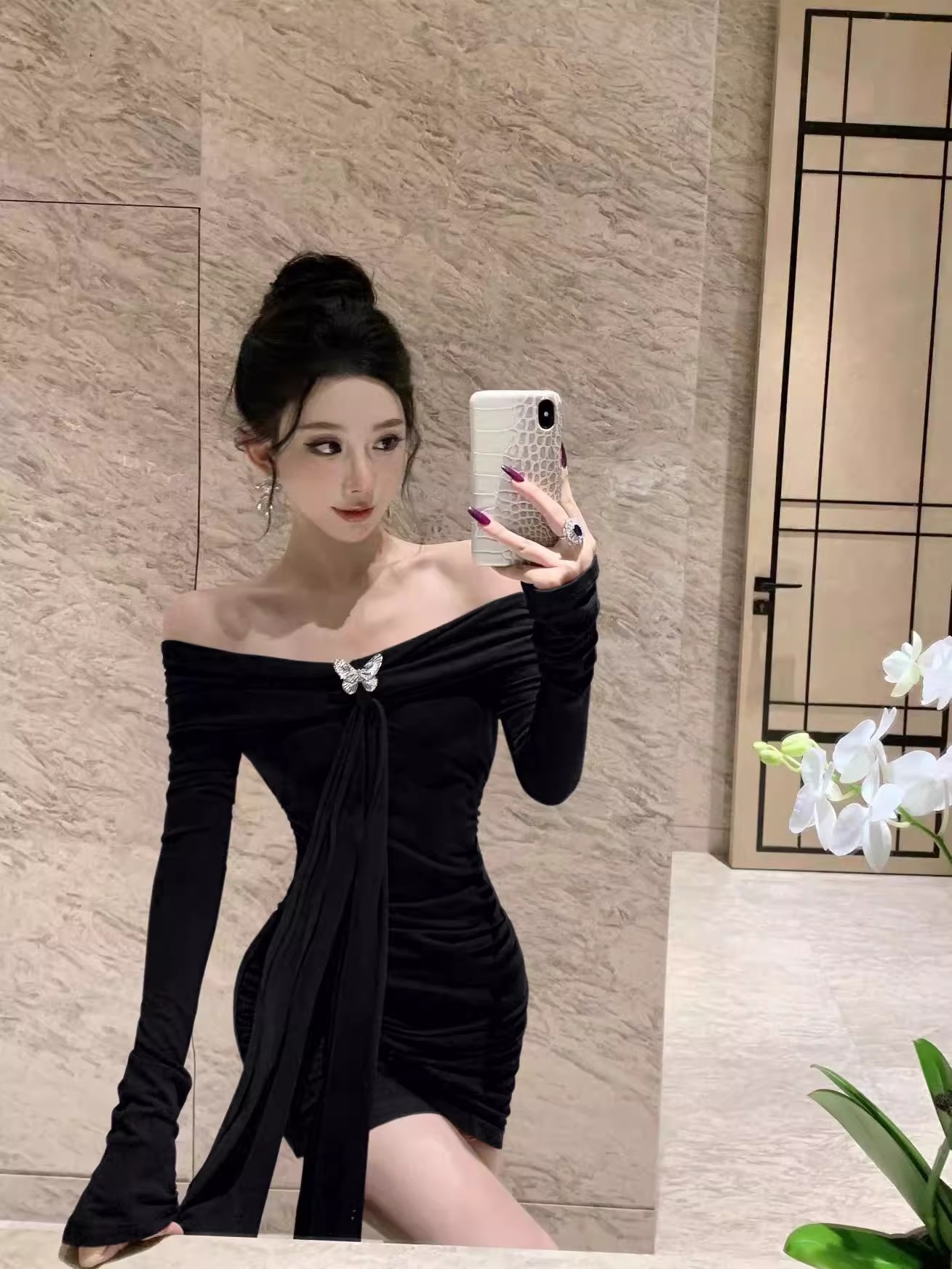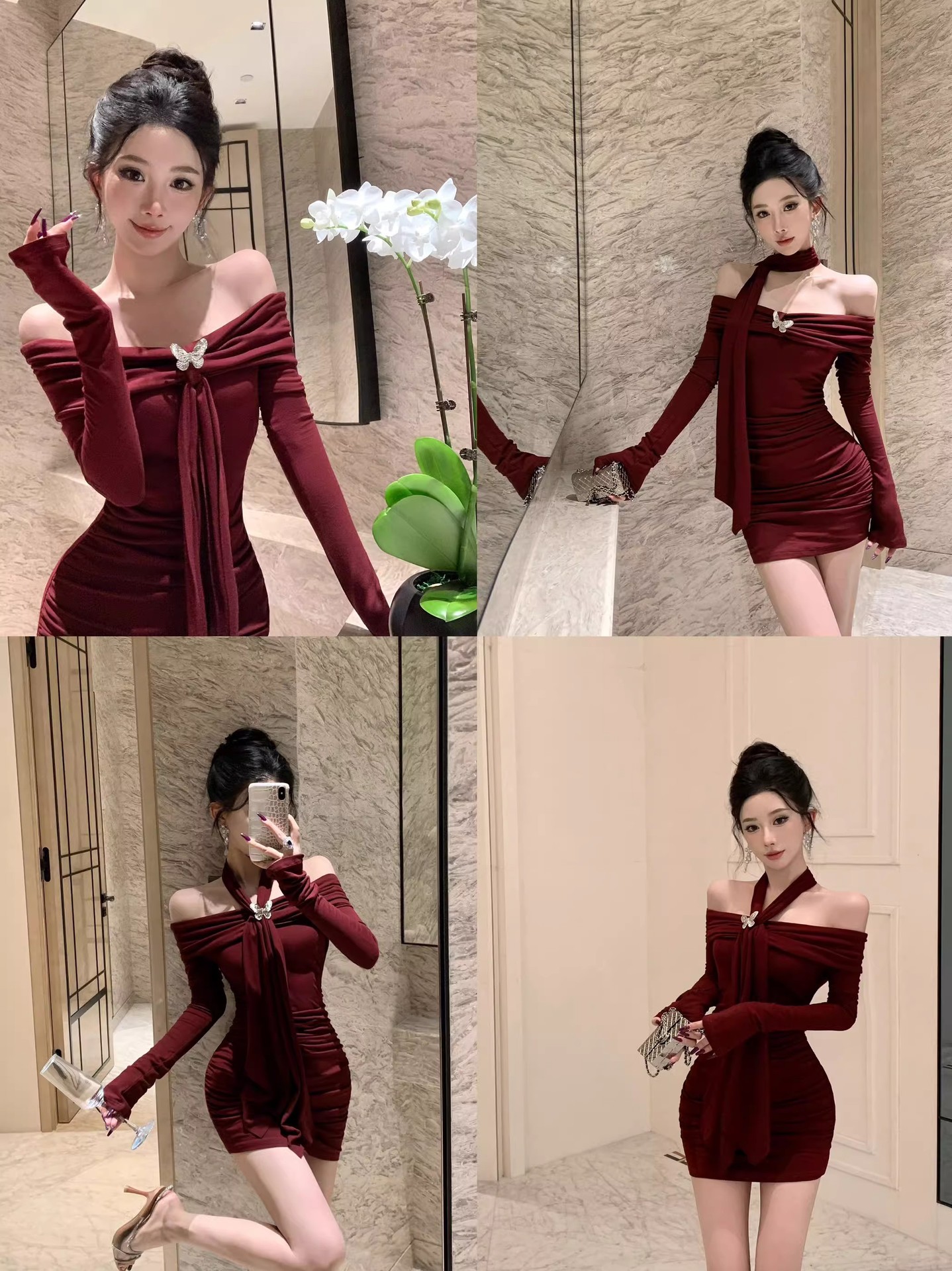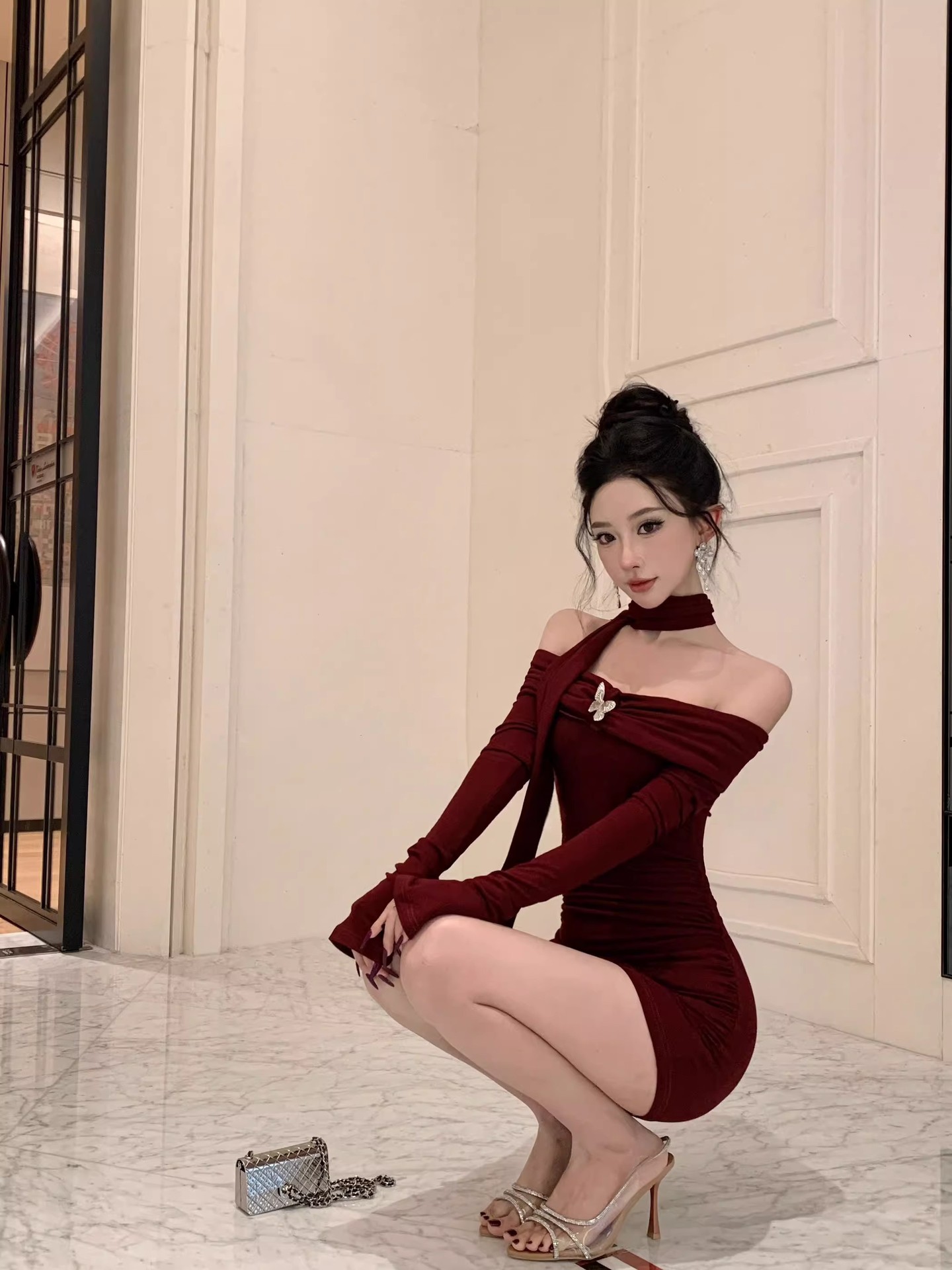 매달린 목 보라색 긴 소매 원피스 여성의 가을과 겨울 순수한 섹시한 슬림 엉덩이 스커트 숄더 사교계 내부 스커트스토어 가기