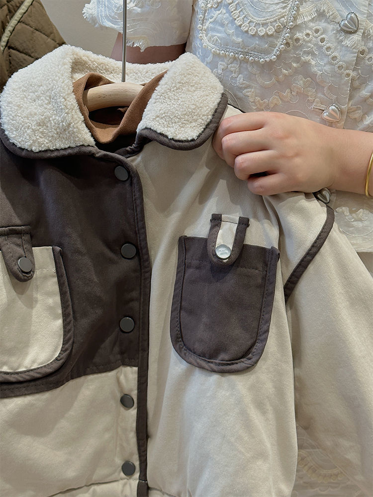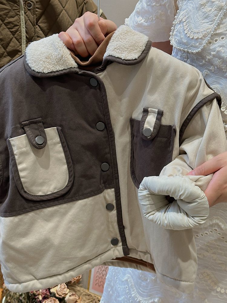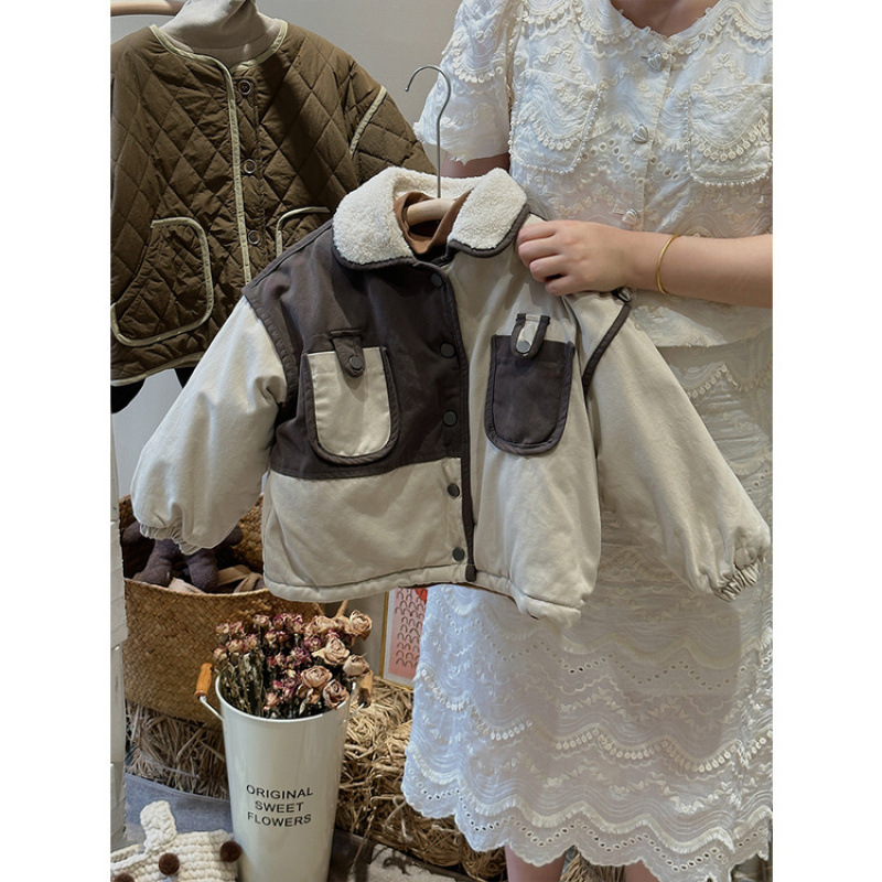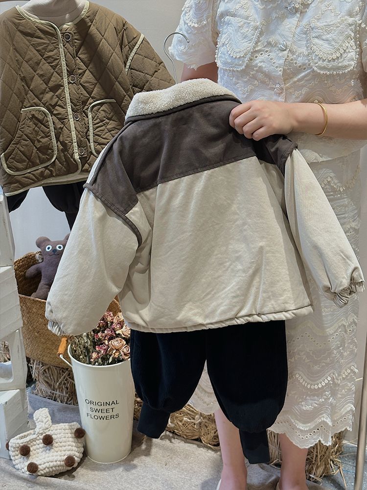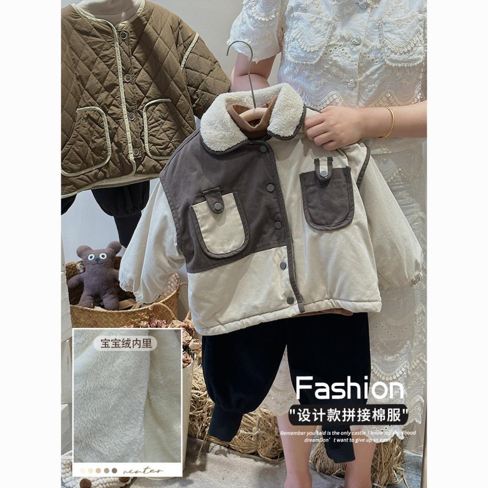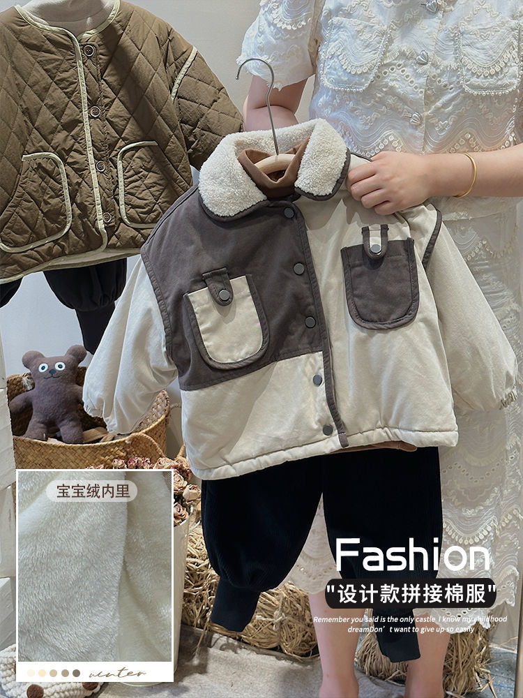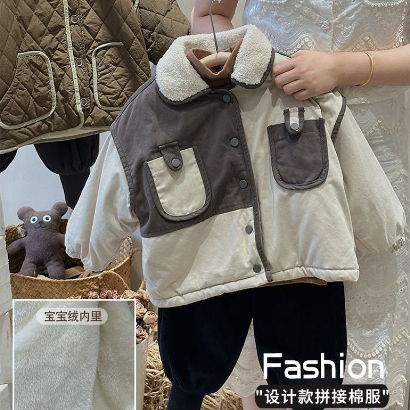 Winter New Boys 'and Girls 'Retro Velvet Jacket 어린이의 따뜻한 스티칭 대조 컬러 코튼 패딩 코트 두껍게 올매치 핸섬스토어 가기