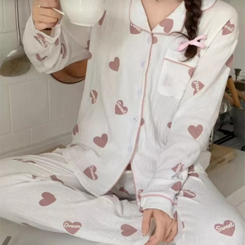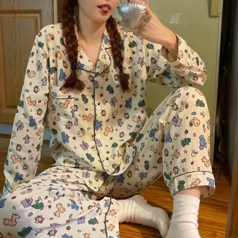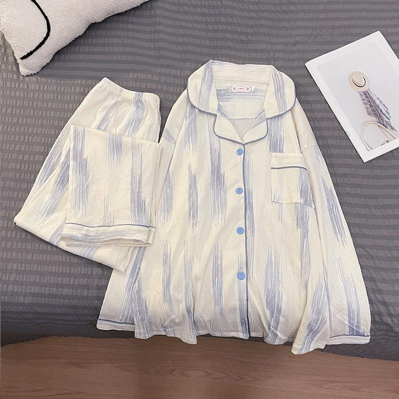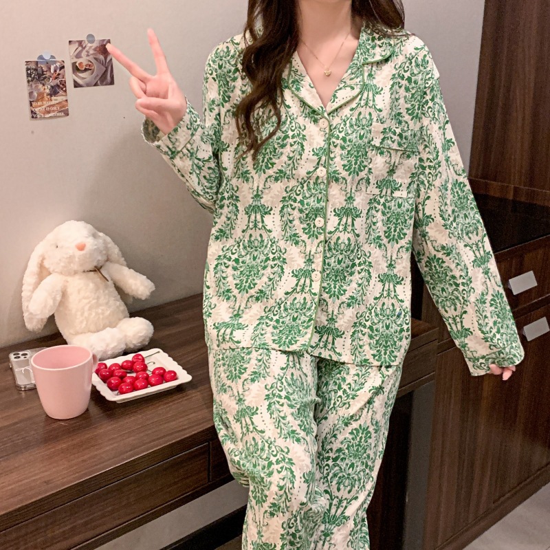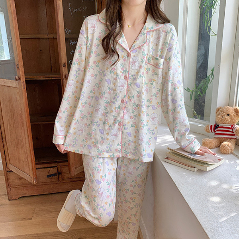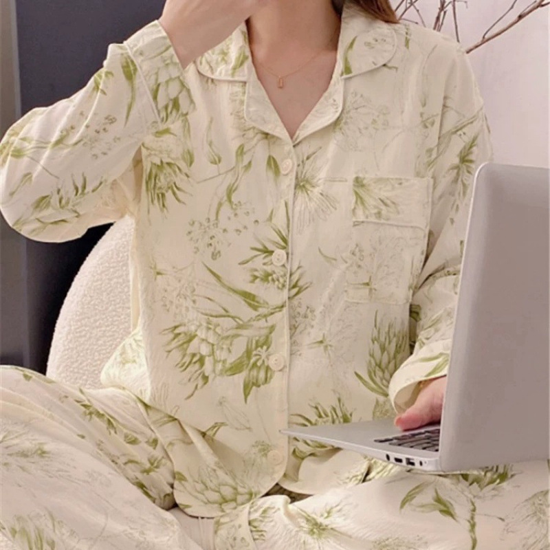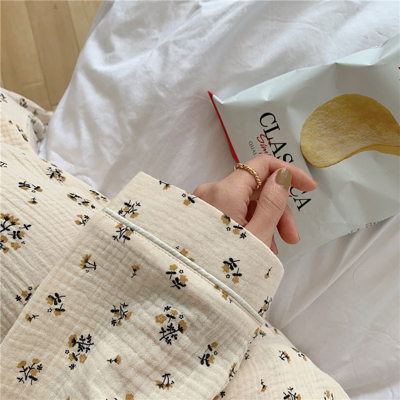 봄 새로운 긴 소매 잠옷 여성 목가적 스타일 꽃 옷깃 카디건 느슨한 느슨한 소녀의 달콤한 세트
