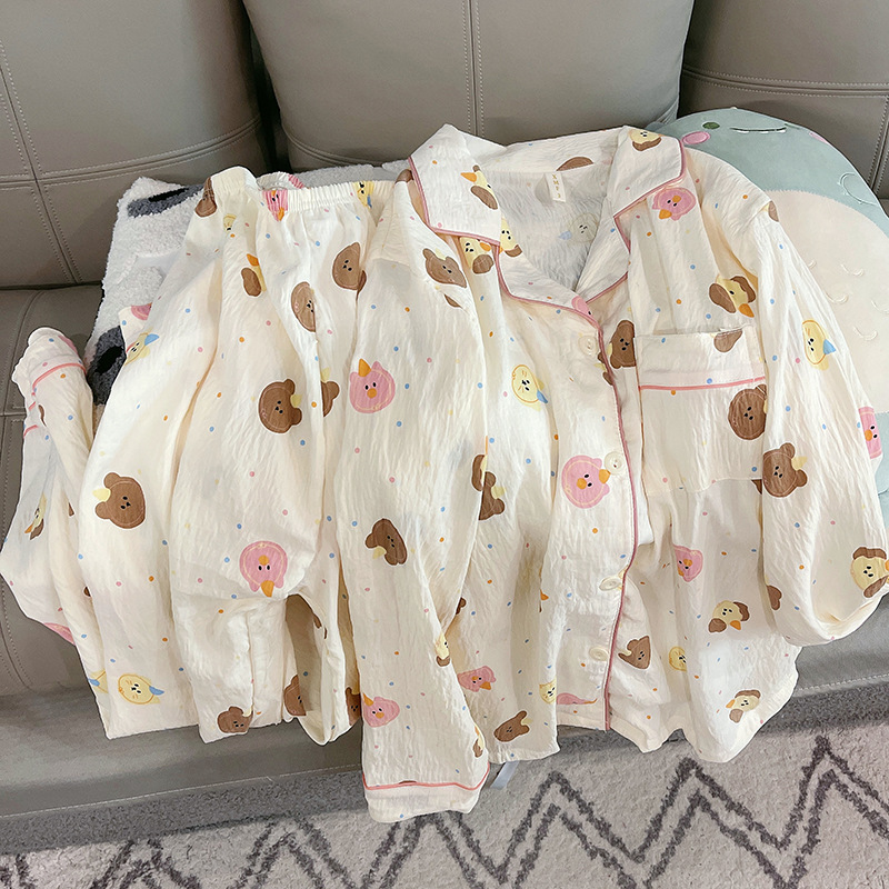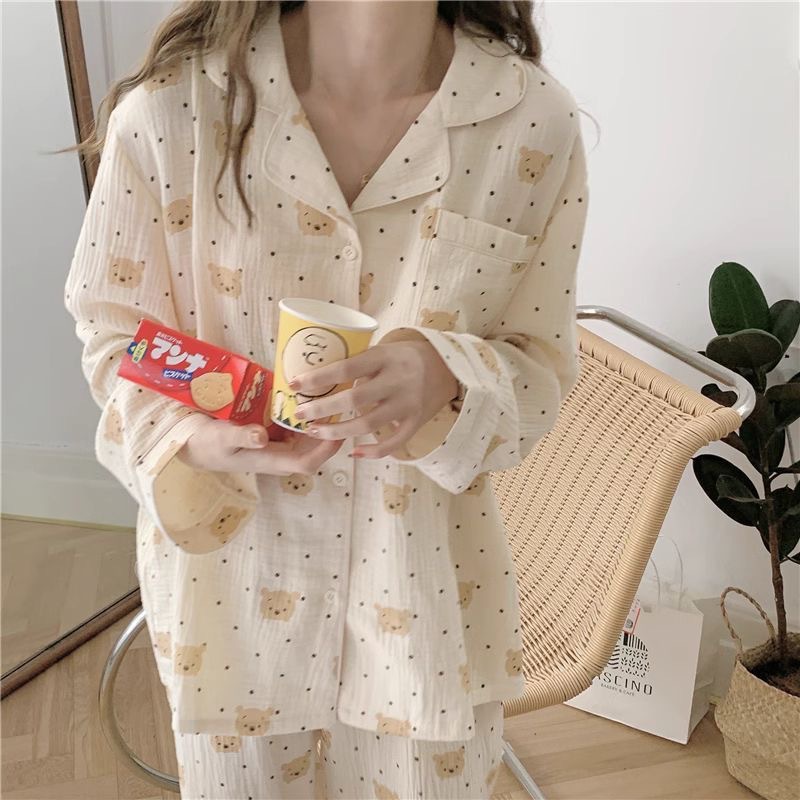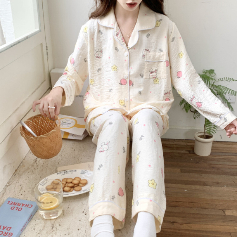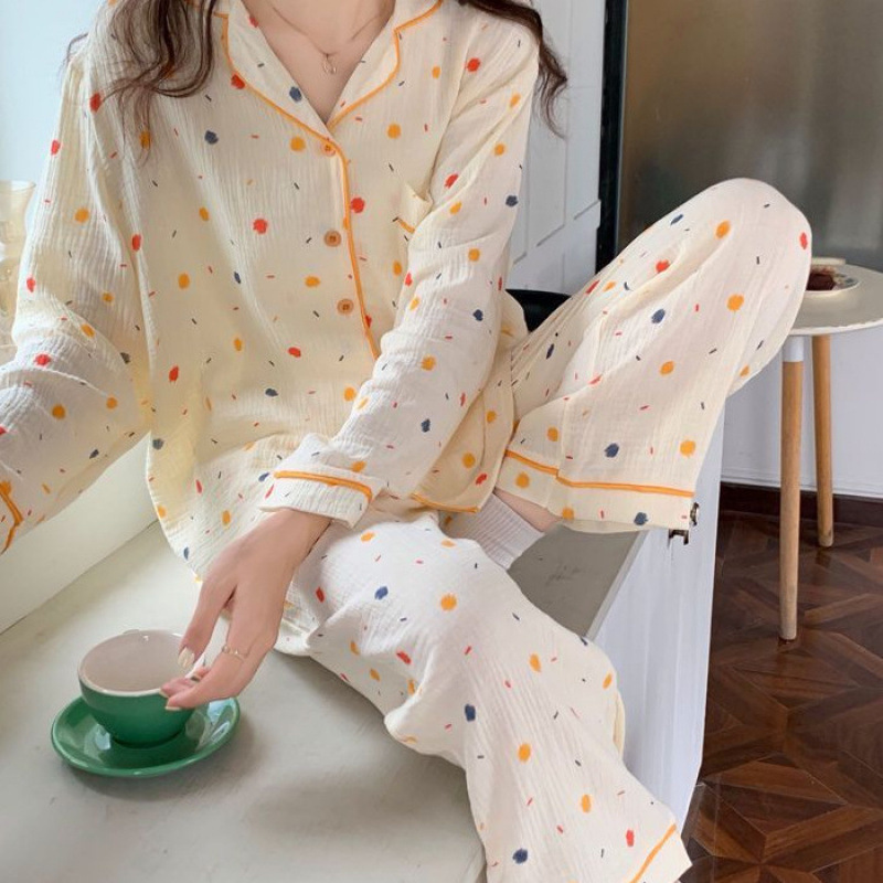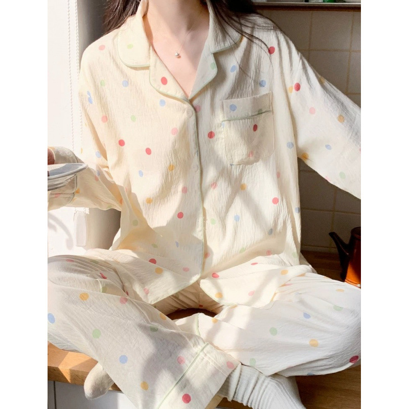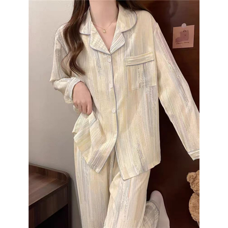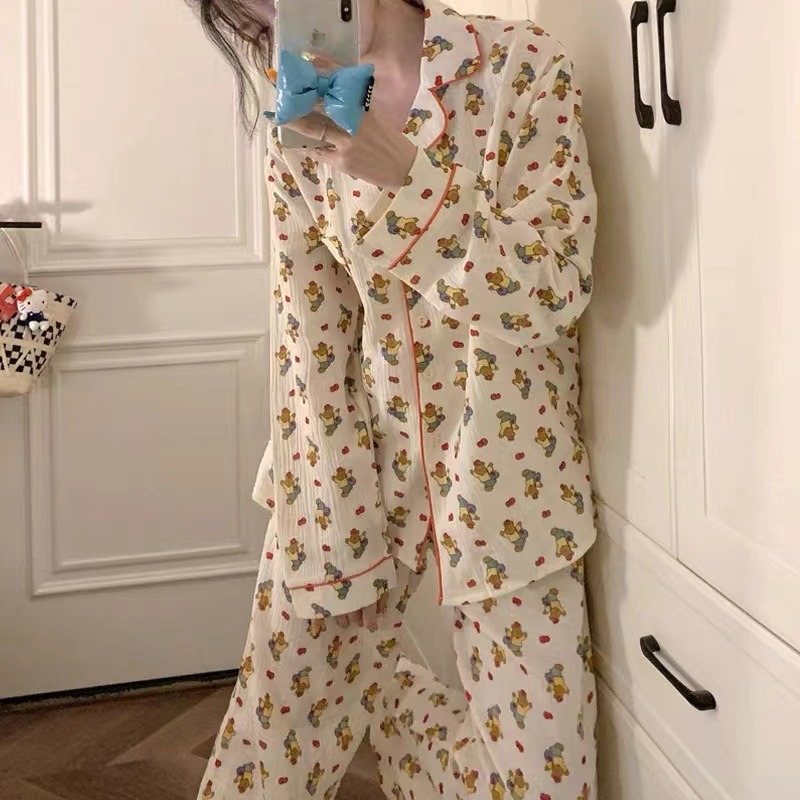 봄 새로운 긴 소매 잠옷 여성 목가적 스타일 꽃 옷깃 카디건 느슨한 느슨한 소녀의 달콤한 세트