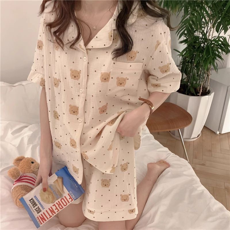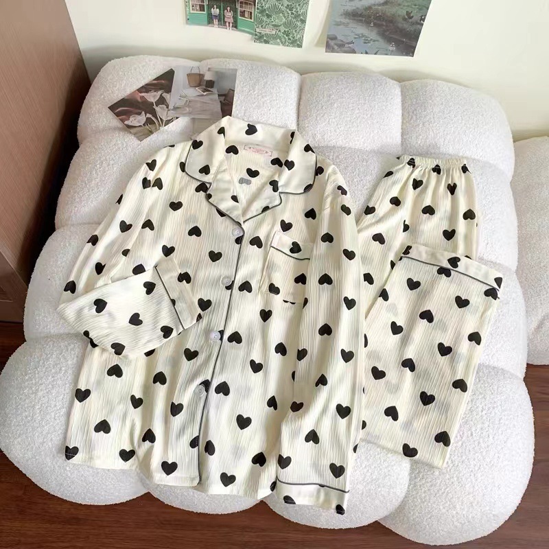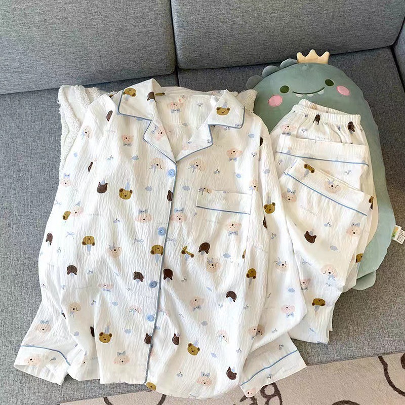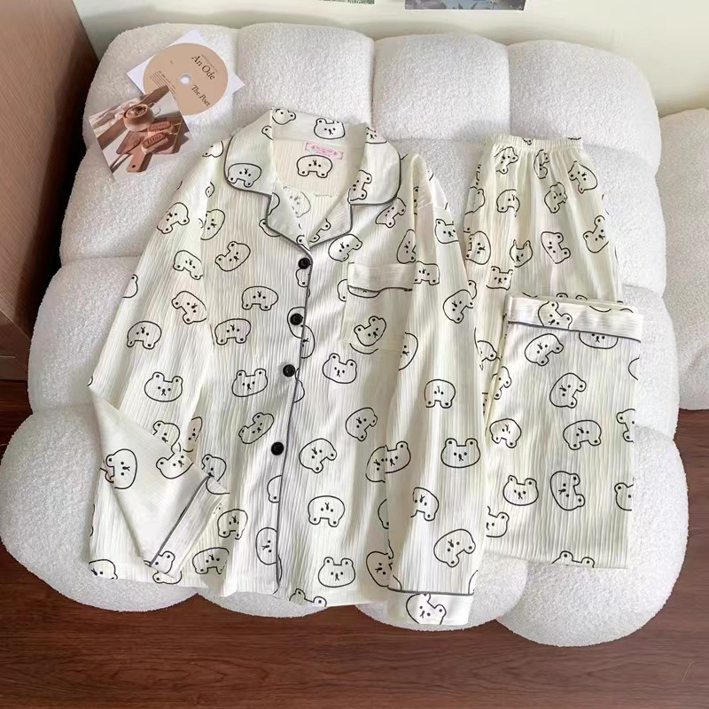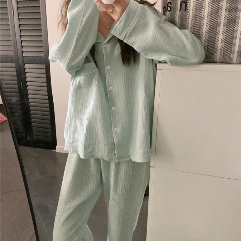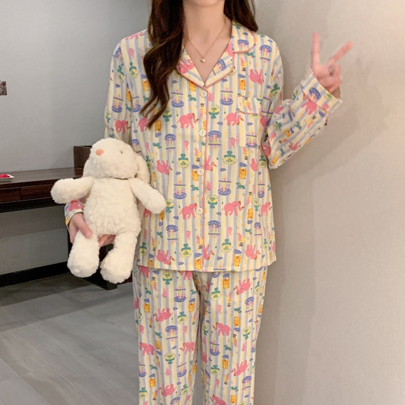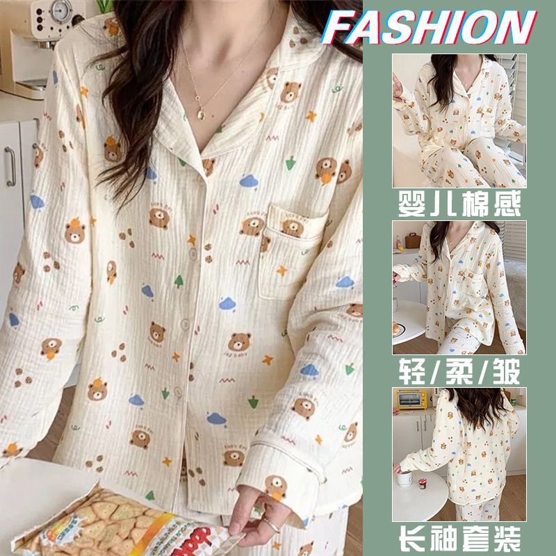 봄 새로운 긴 소매 잠옷 여성 목가적 스타일 꽃 옷깃 카디건 느슨한 느슨한 소녀의 달콤한 세트