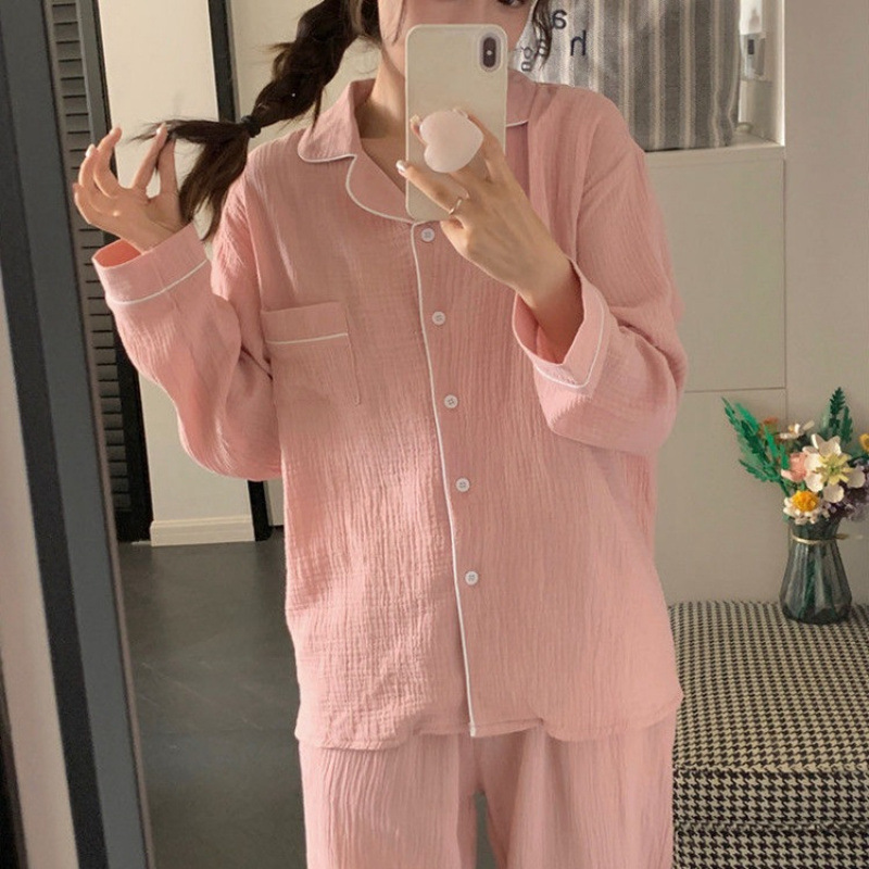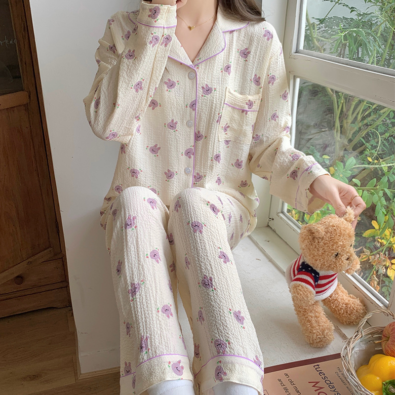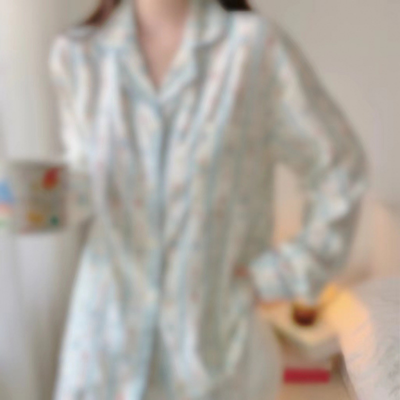 봄 새로운 긴 소매 잠옷 여성 목가적 스타일 꽃 옷깃 카디건 느슨한 느슨한 소녀의 달콤한 세트스토어 가기