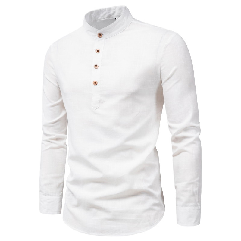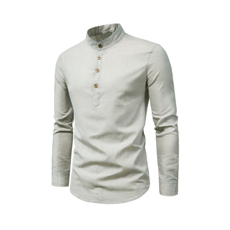 2024 남성용 긴팔 캐주얼 셔츠 슬림핏 비즈니스 스타일 스탠드 칼라 면마 혼방 반오픈 셔츠 해외 직구 전용 심플 캐주얼