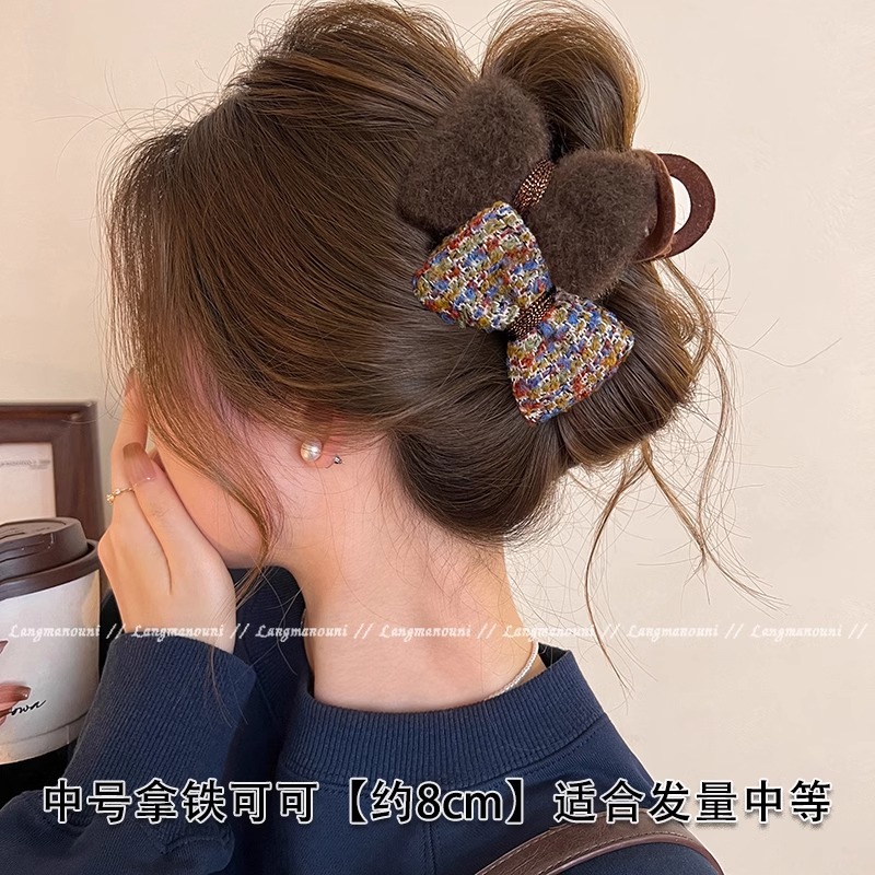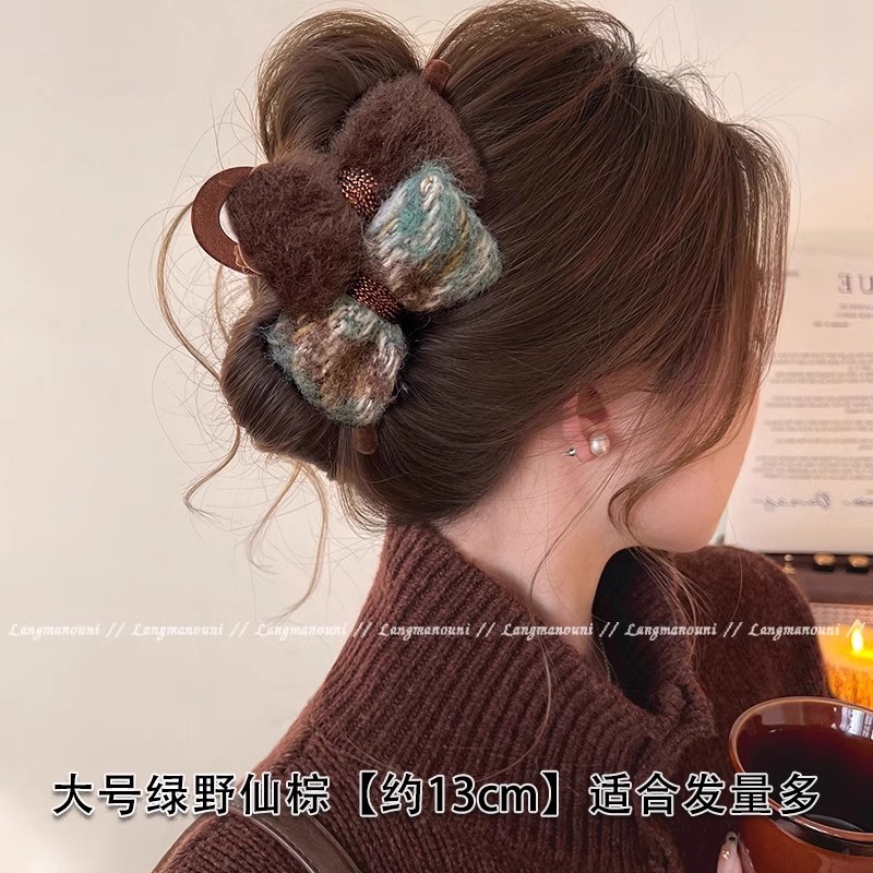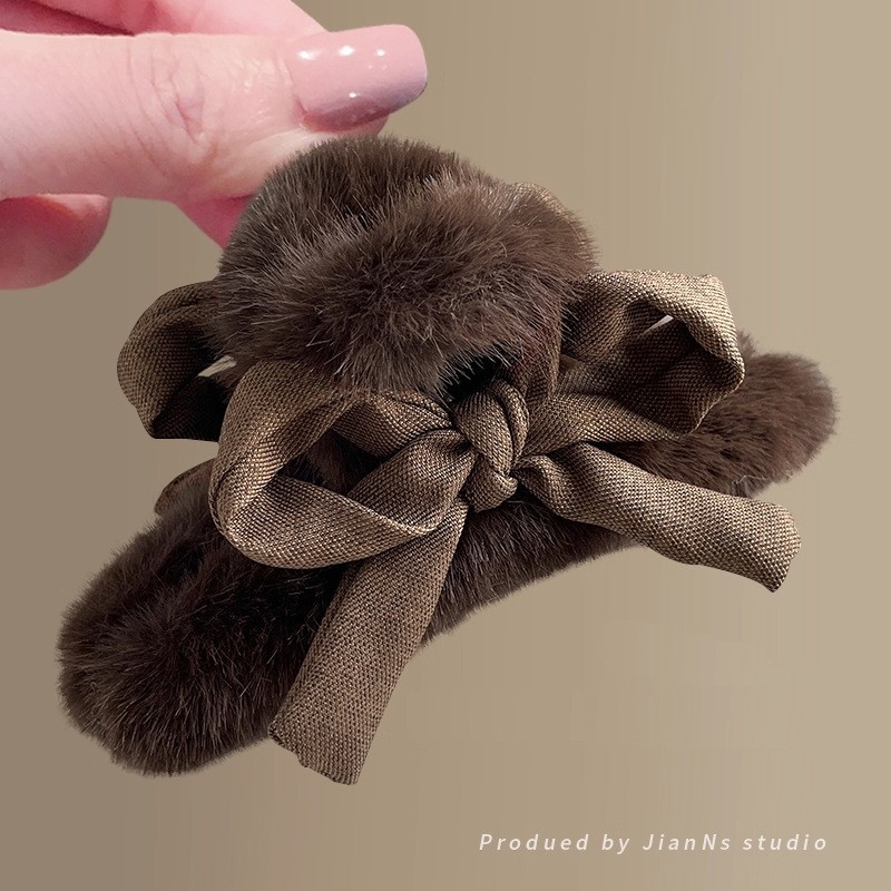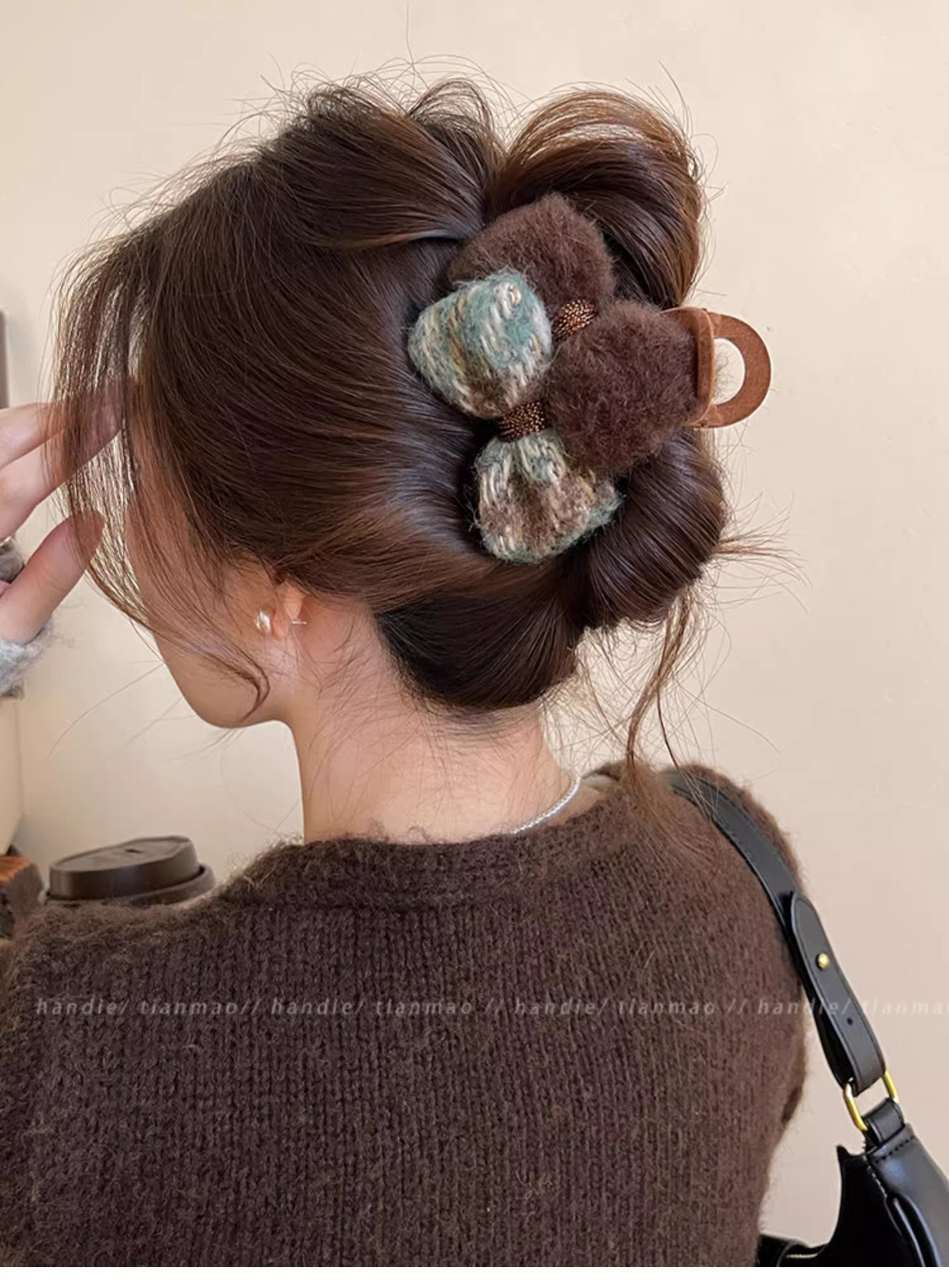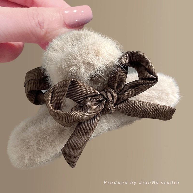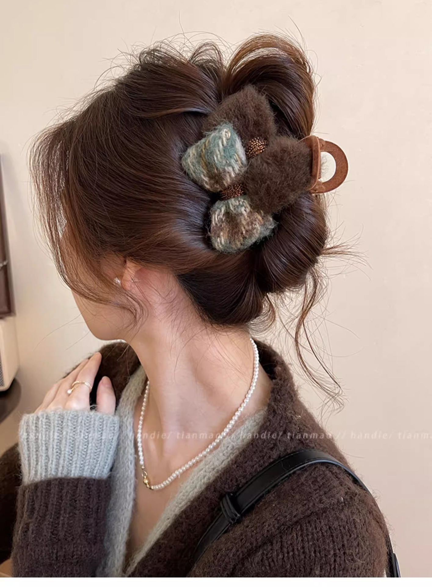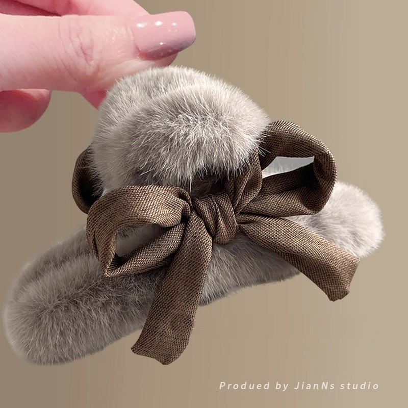 가을 겨울용 털 장식 리본 머리핀 여성용 뒷머리 샤크클립 2025 신상 고급스러운 스타일 헤어 액세서리