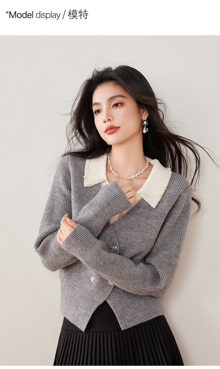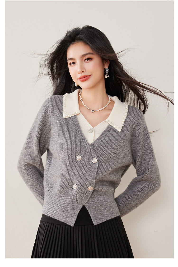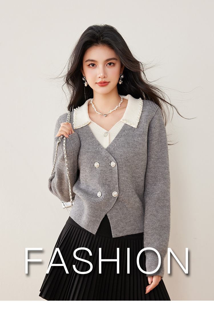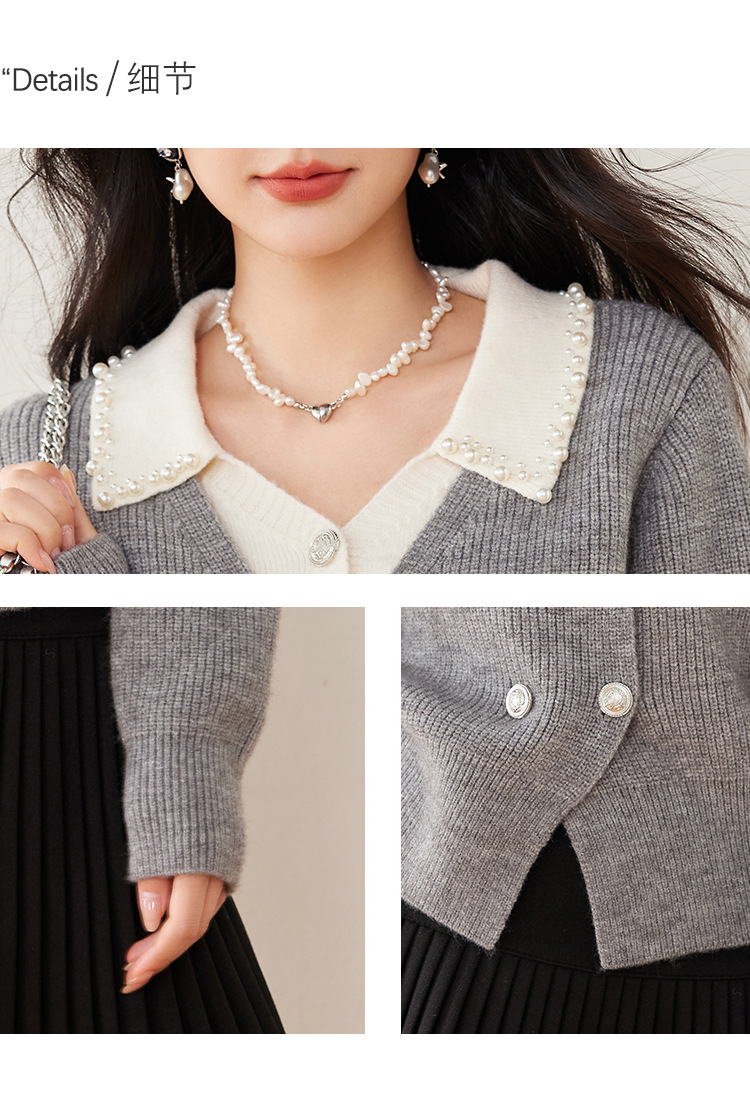 그레이 페이크 투피스 스웨터 여성 2024 년 겨울 새 한국 스타일 우아한 펄 버클 인형 칼라 짧은 니트 스웨터스토어 가기