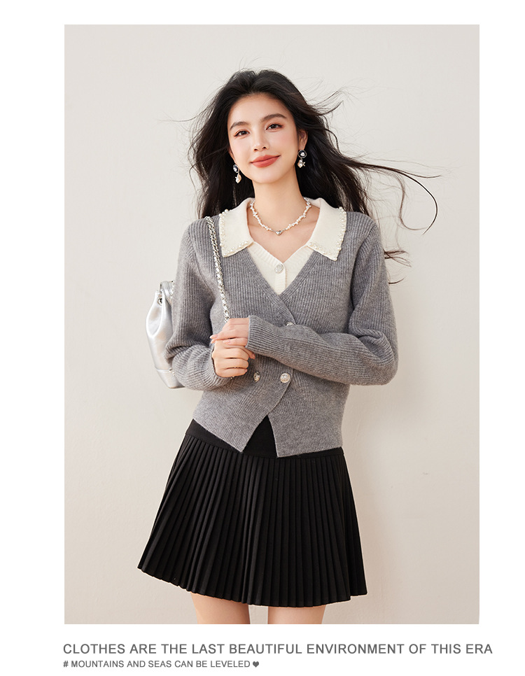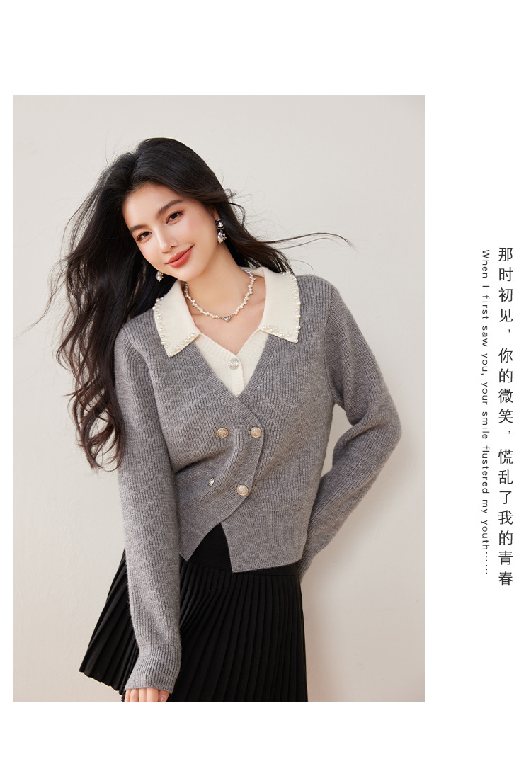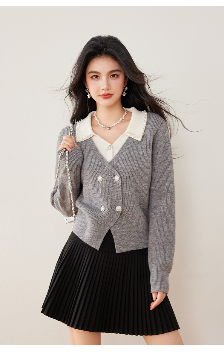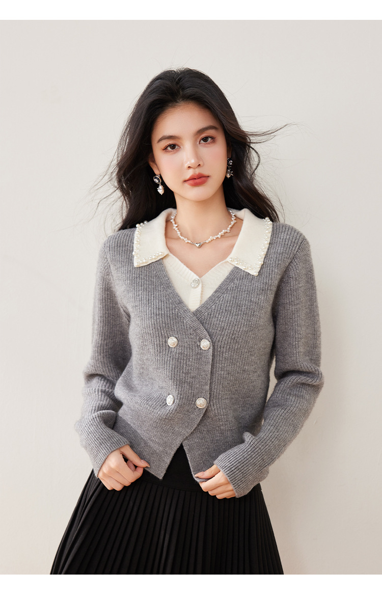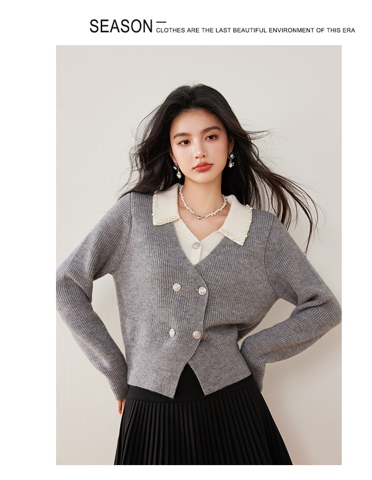 그레이 페이크 투피스 스웨터 여성 2024 년 겨울 새 한국 스타일 우아한 펄 버클 인형 칼라 짧은 니트 스웨터