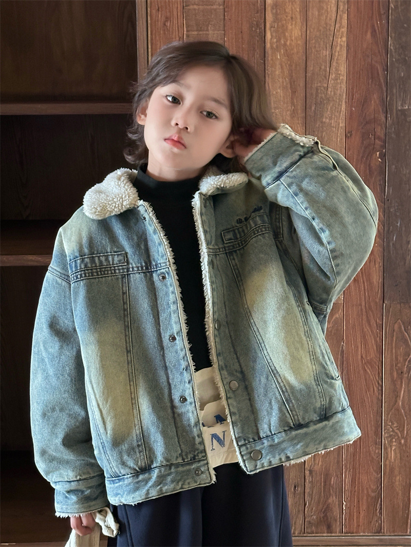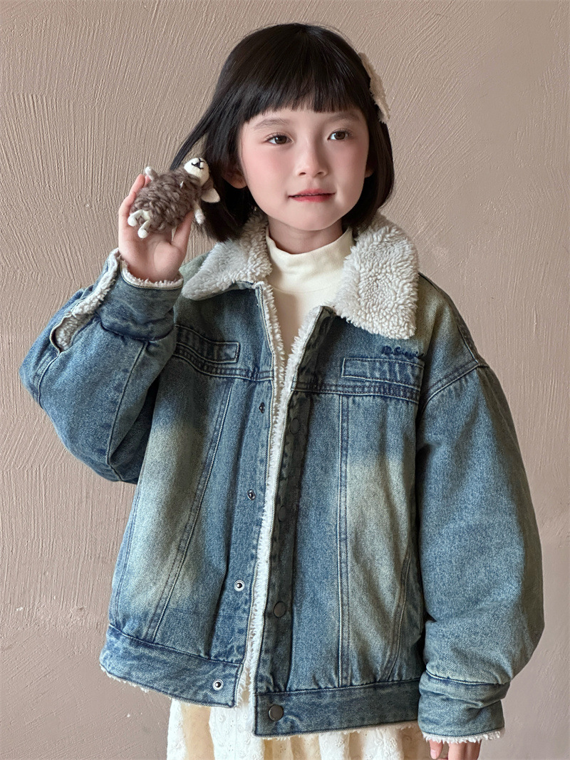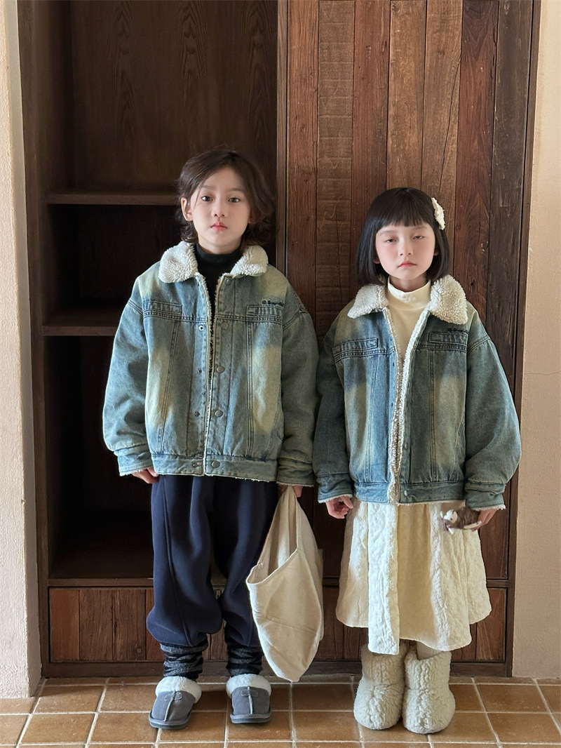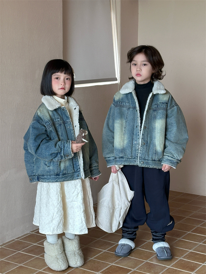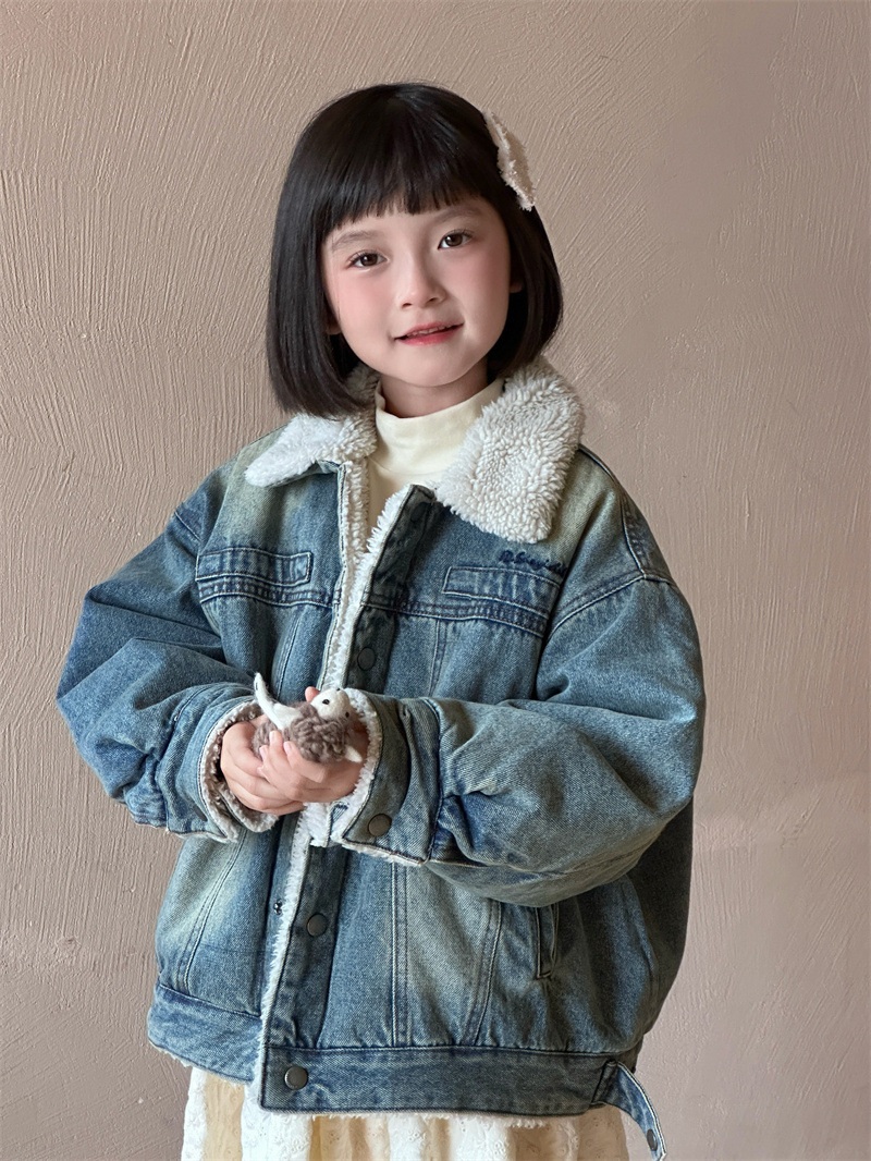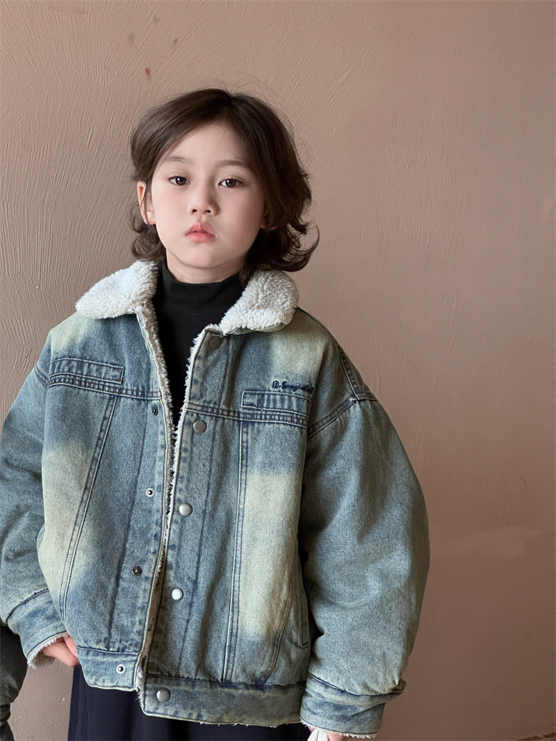 Chipmunk 2024 겨울 어린이 양고기 양모 데님 코트 소년 소녀 옷깃 올매치 느슨한 두꺼운 재킷