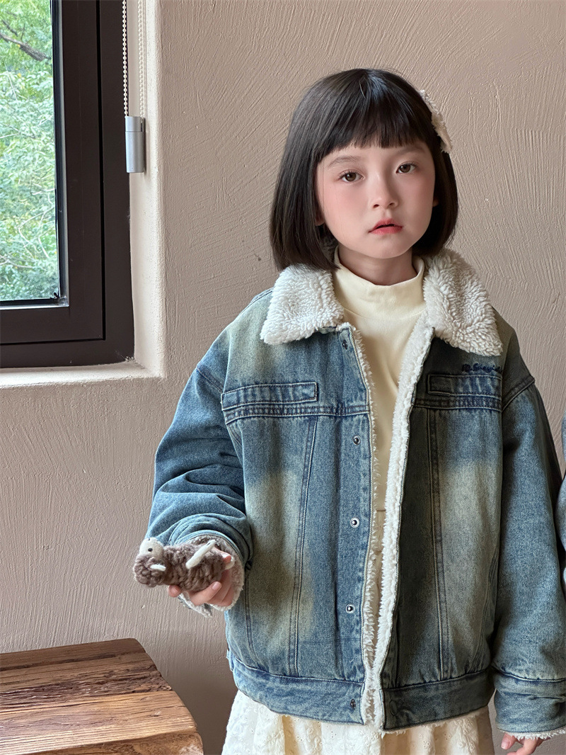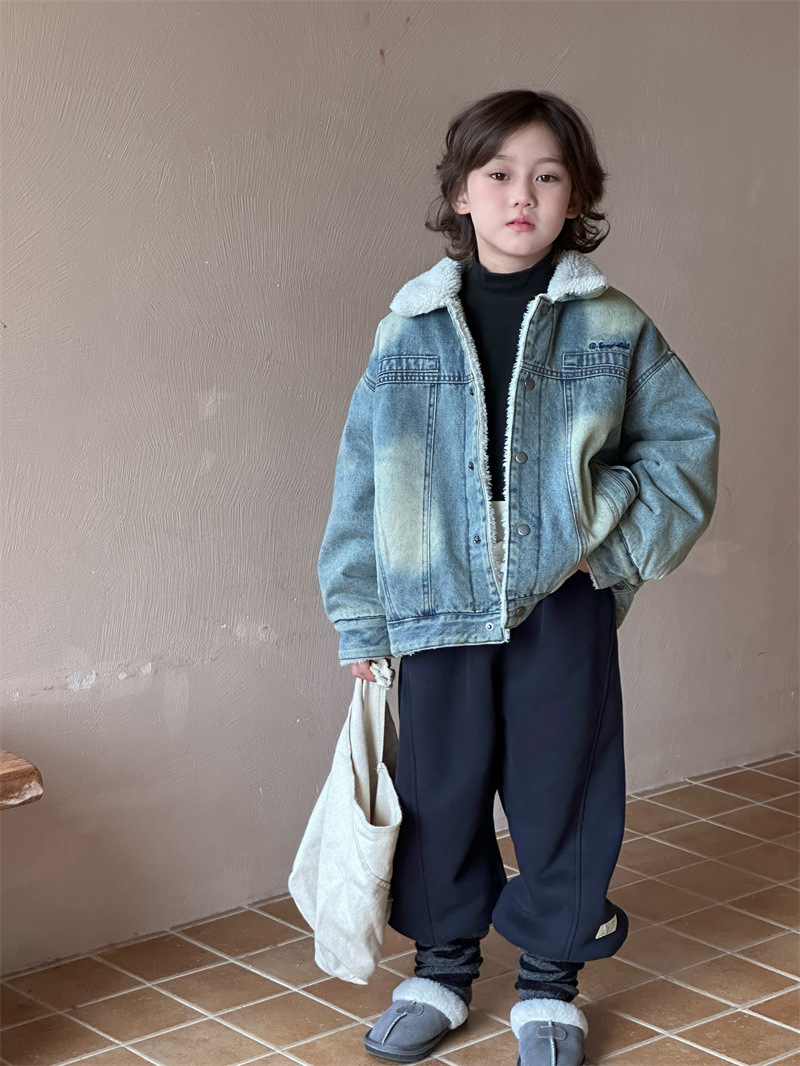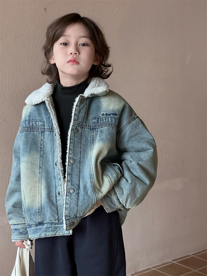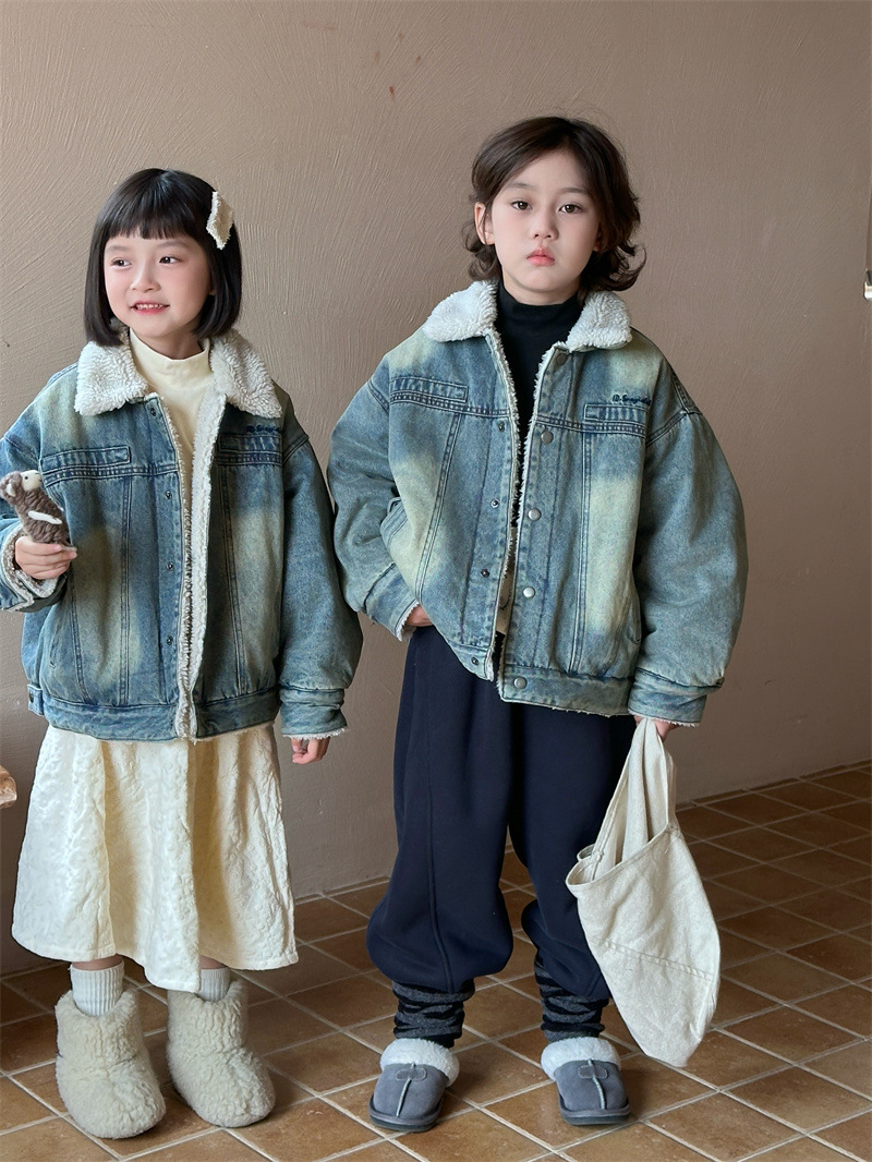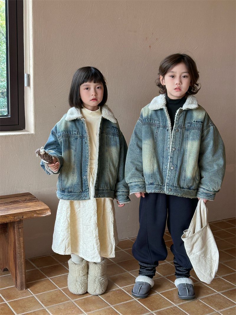 Chipmunk 2024 겨울 어린이 양고기 양모 데님 코트 소년 소녀 옷깃 올매치 느슨한 두꺼운 재킷