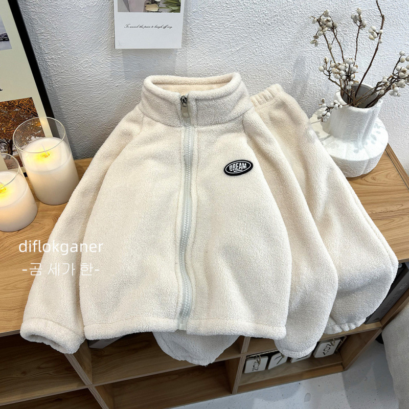 새로운 어린이 가을 및 겨울 칼라 양면 양털 세트 남녀 소프트 왁스 소프트 울 스웨터 재킷 바지 투피스 유행 세트스토어 가기