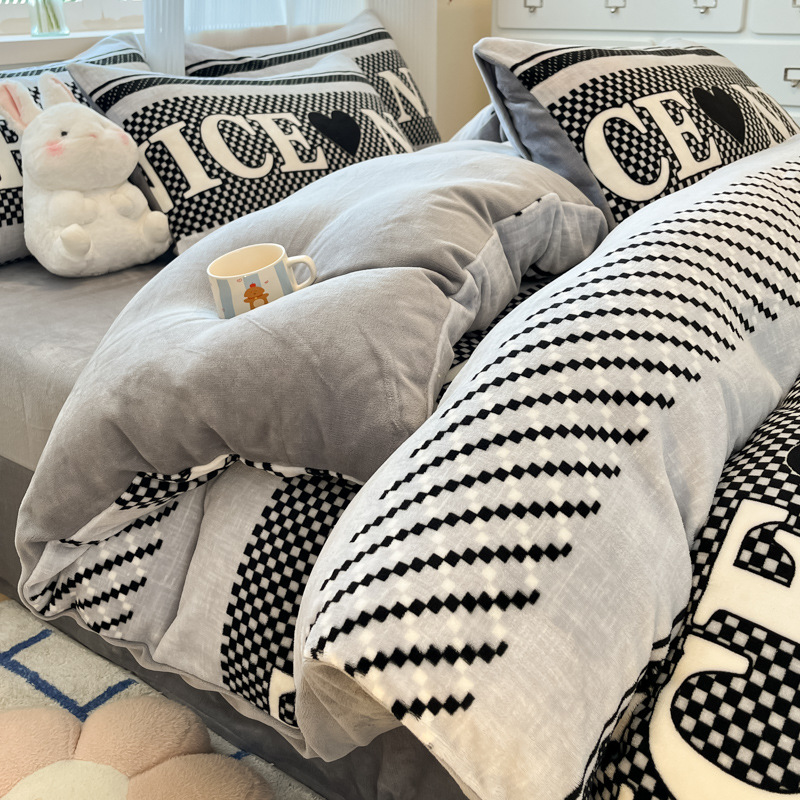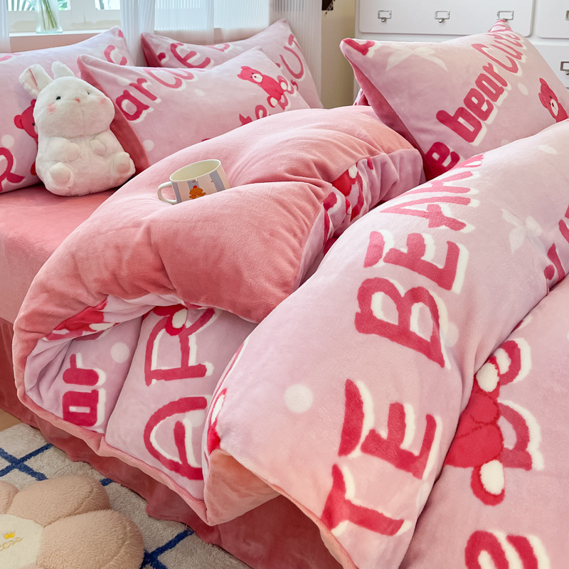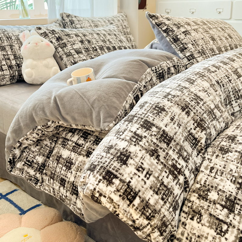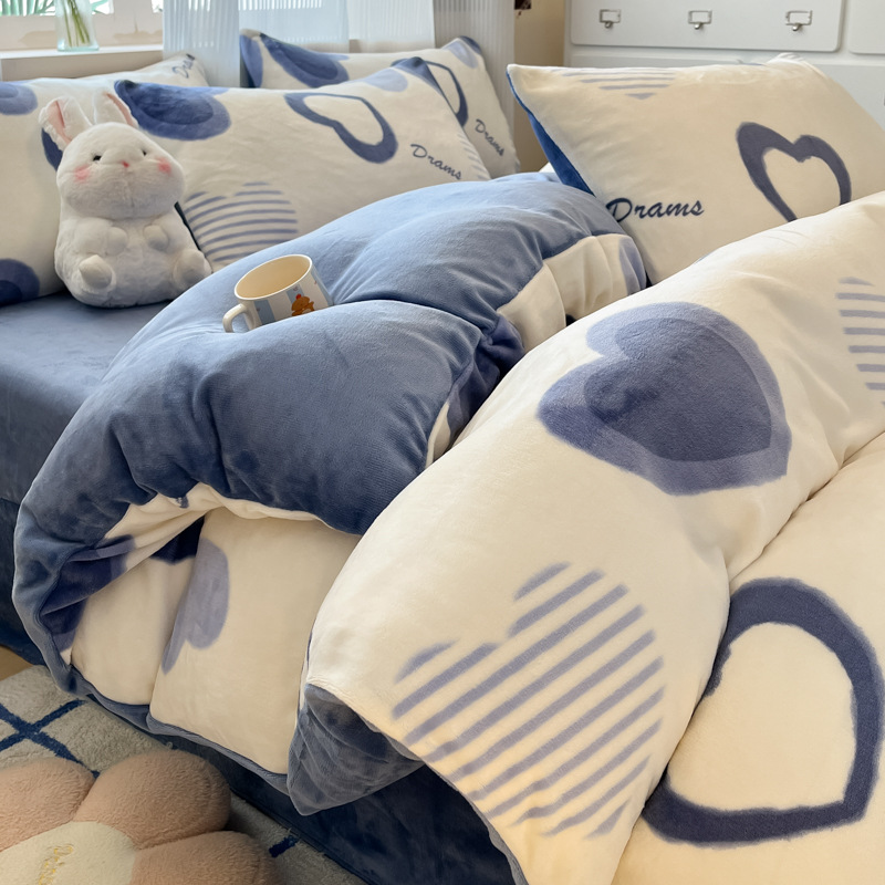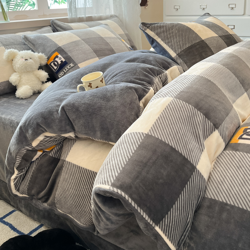 밀크 벨벳 침대 4 피스 세트 겨울 코랄 벨벳 두꺼운 플랜지 스웨이드 팔라이 기모 퀼트 커버 남성용 침대 시트 3 피스 세트스토어 가기