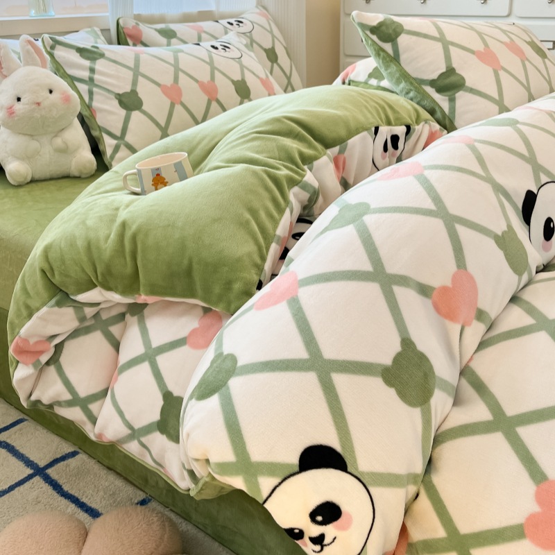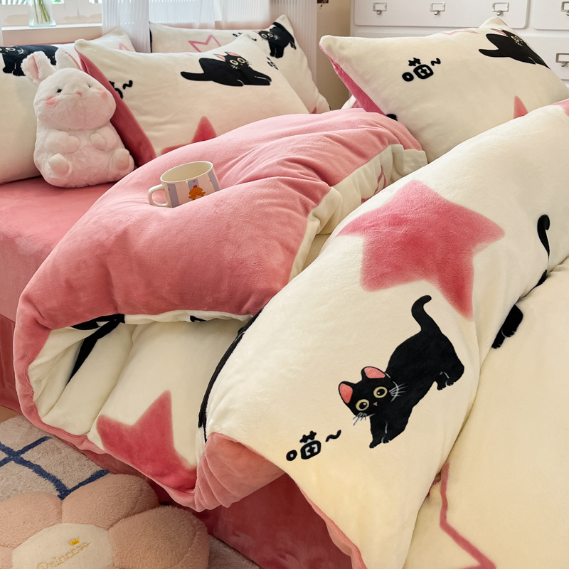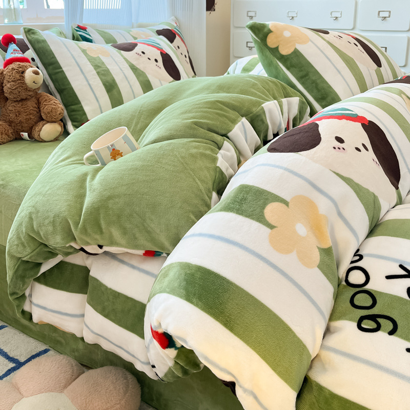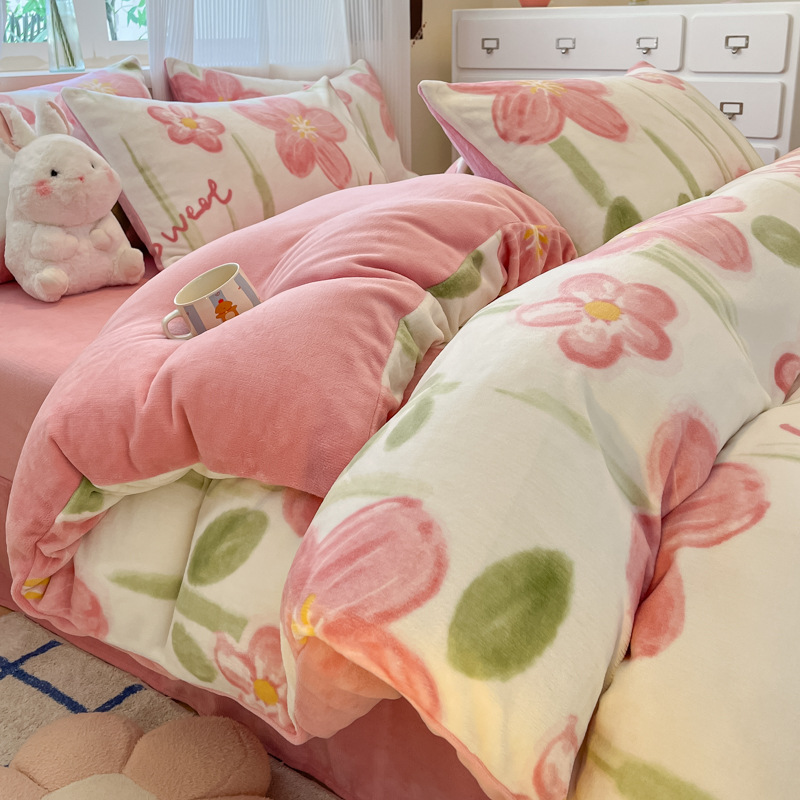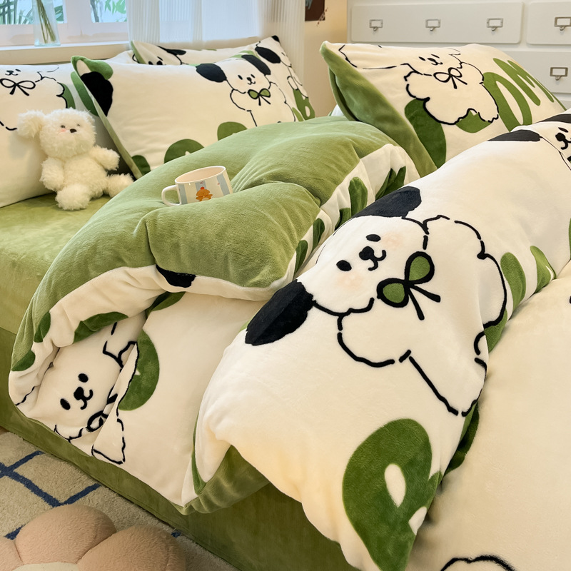 밀크 벨벳 침대 4 피스 세트 겨울 코랄 벨벳 두꺼운 플랜지 스웨이드 팔라이 기모 퀼트 커버 남성용 침대 시트 3 피스 세트스토어 가기