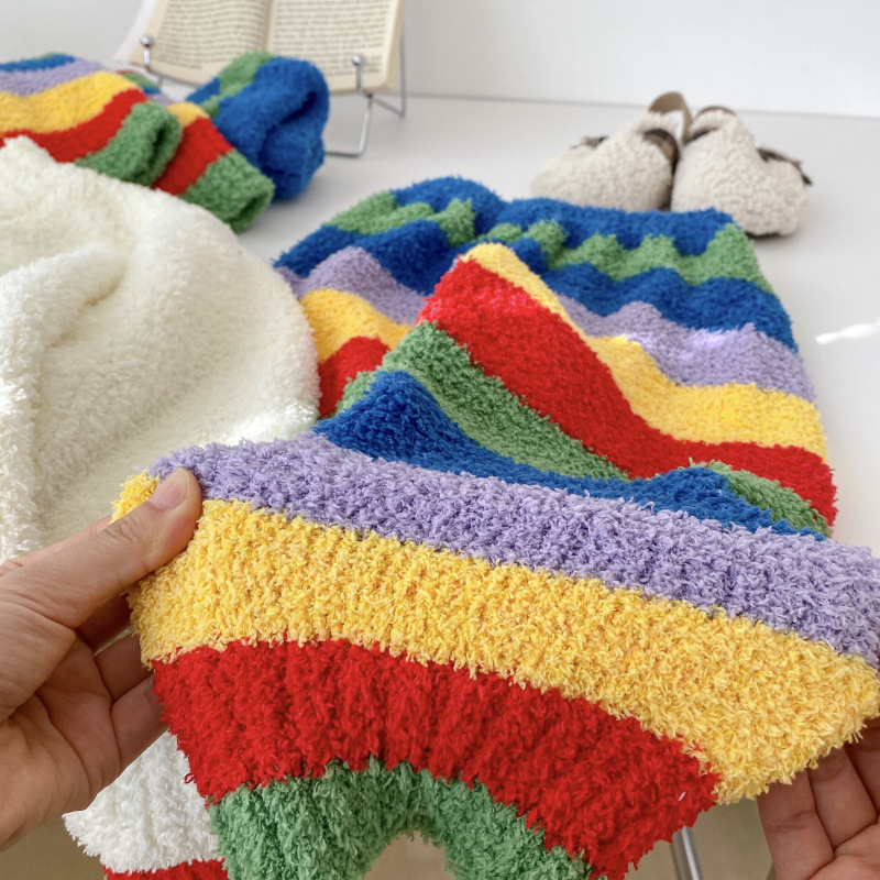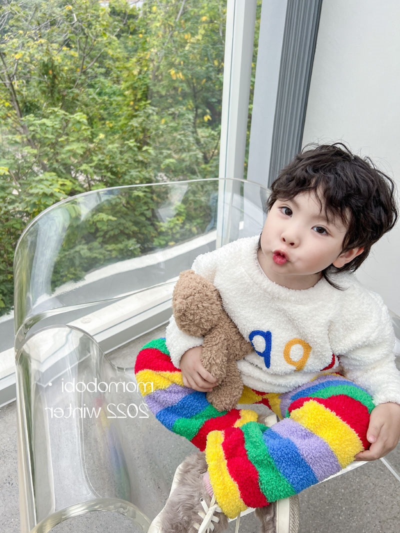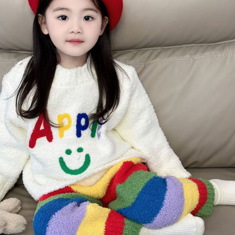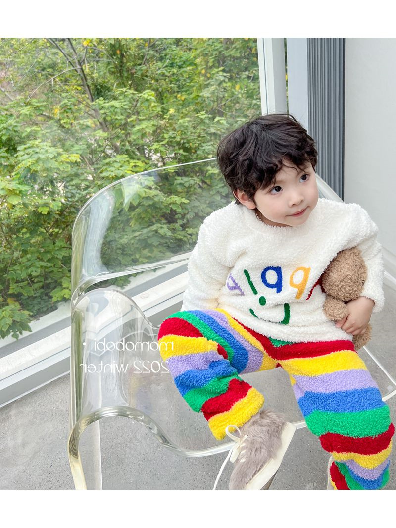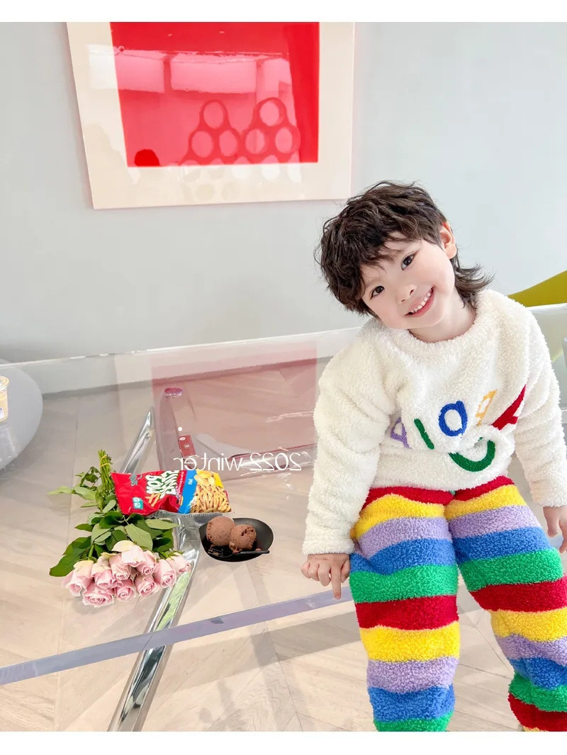 어린이 산호 양털 파자마 소년의 겨울 레인보우 스트립 홈 옷 소년 소녀 두꺼운 부드러운 홈 의류 세트