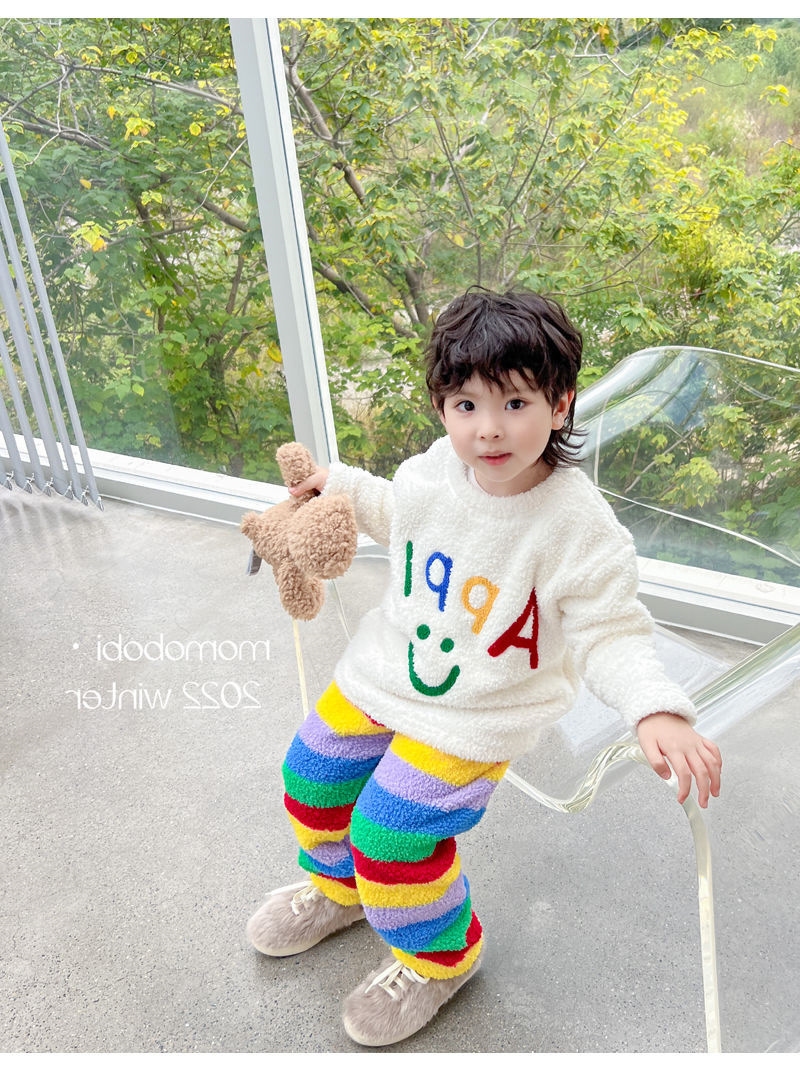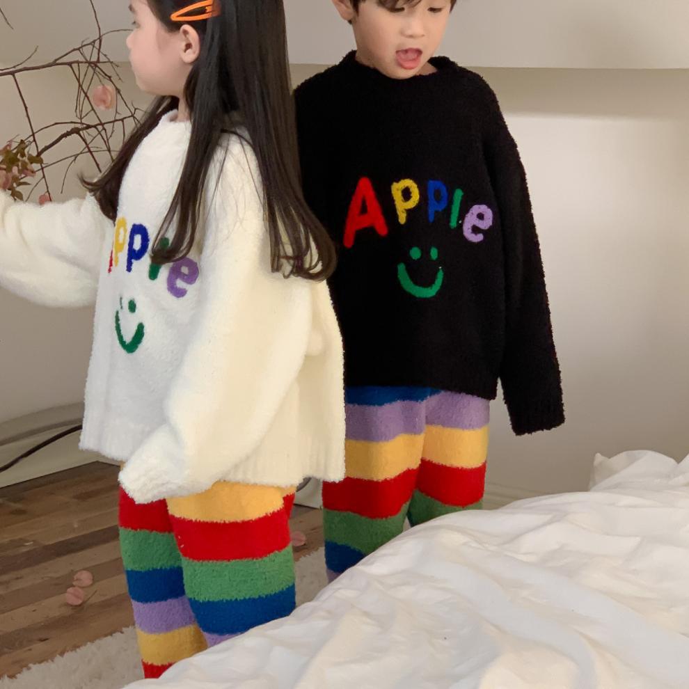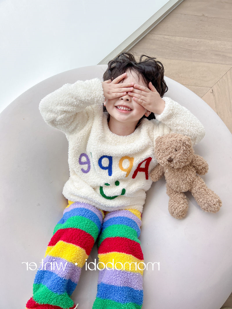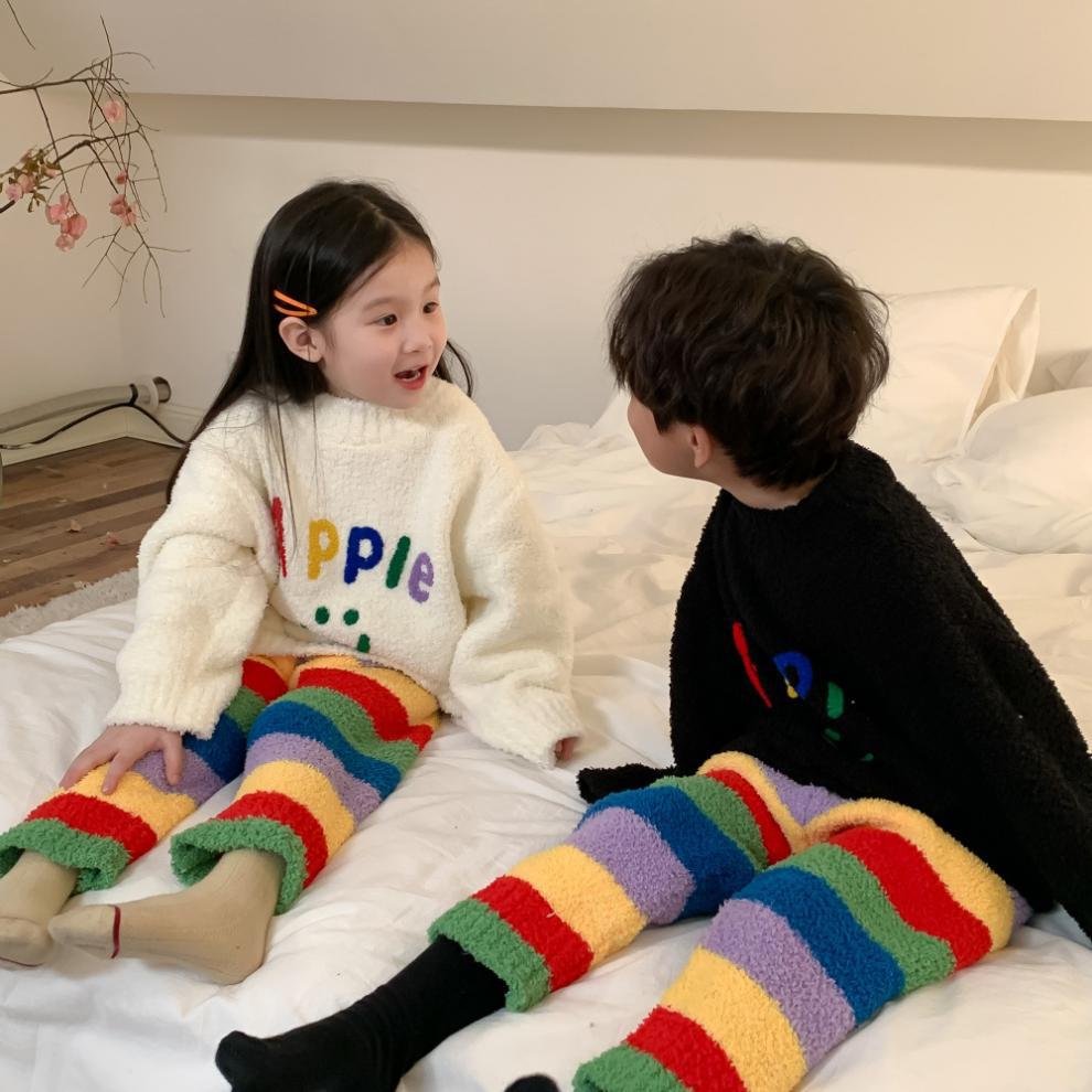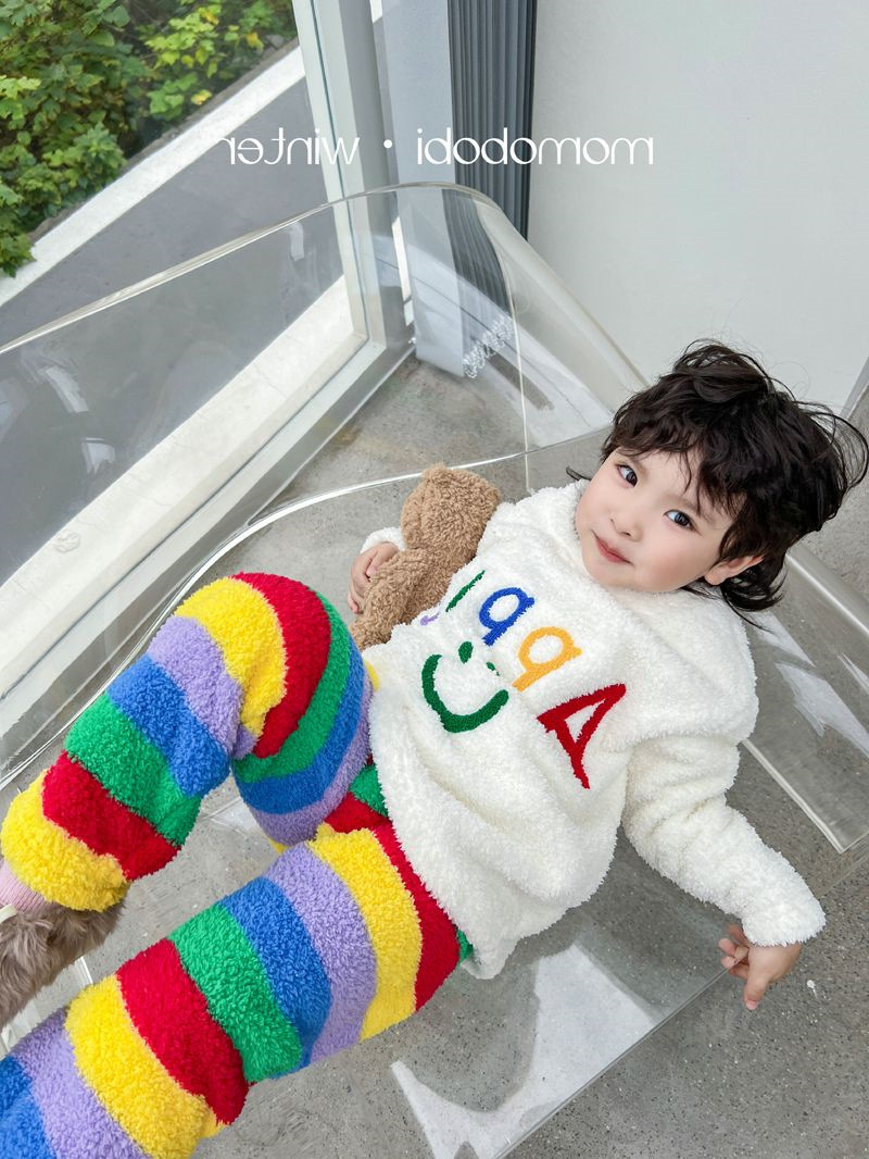 어린이 산호 양털 파자마 소년의 겨울 레인보우 스트립 홈 옷 소년 소녀 두꺼운 부드러운 홈 의류 세트
