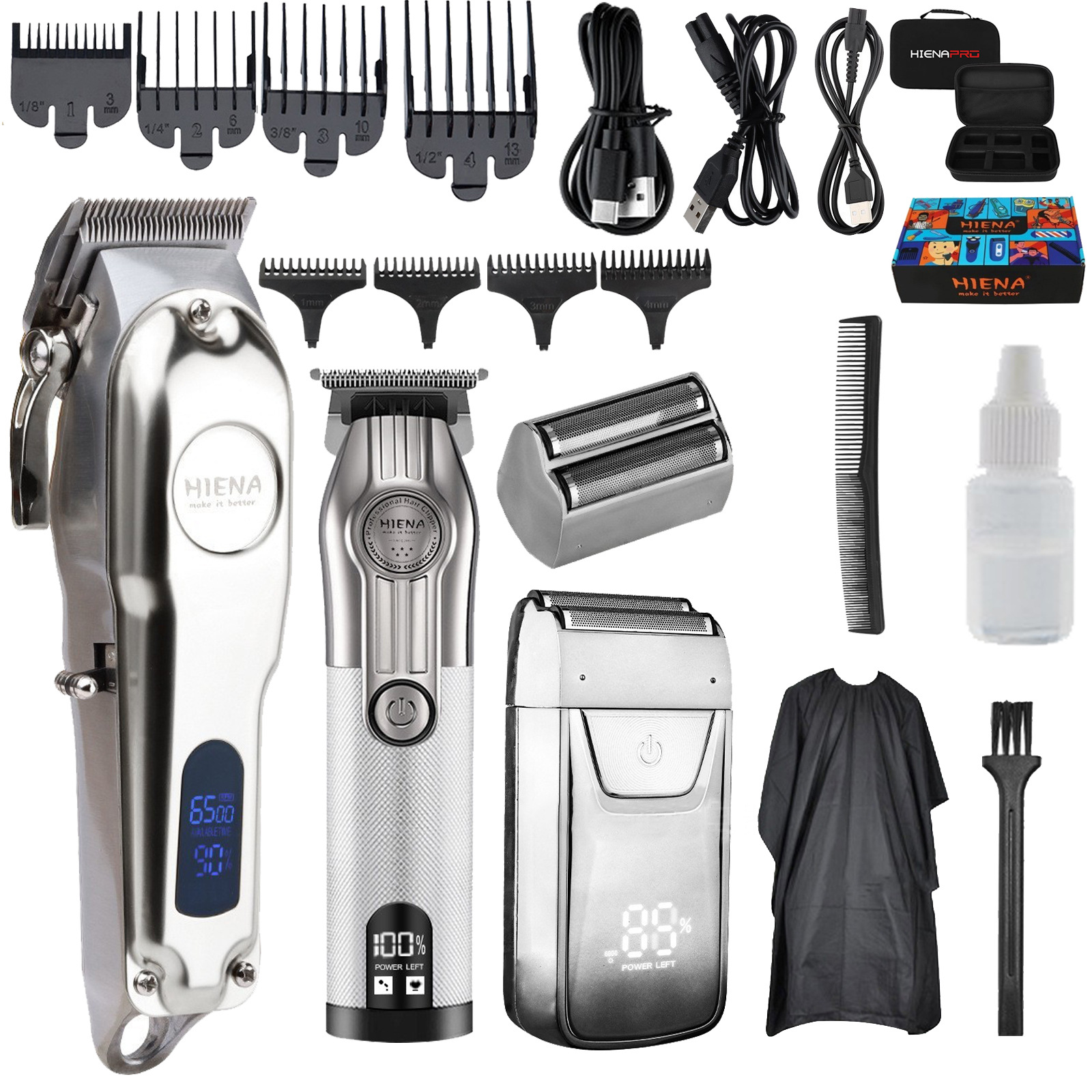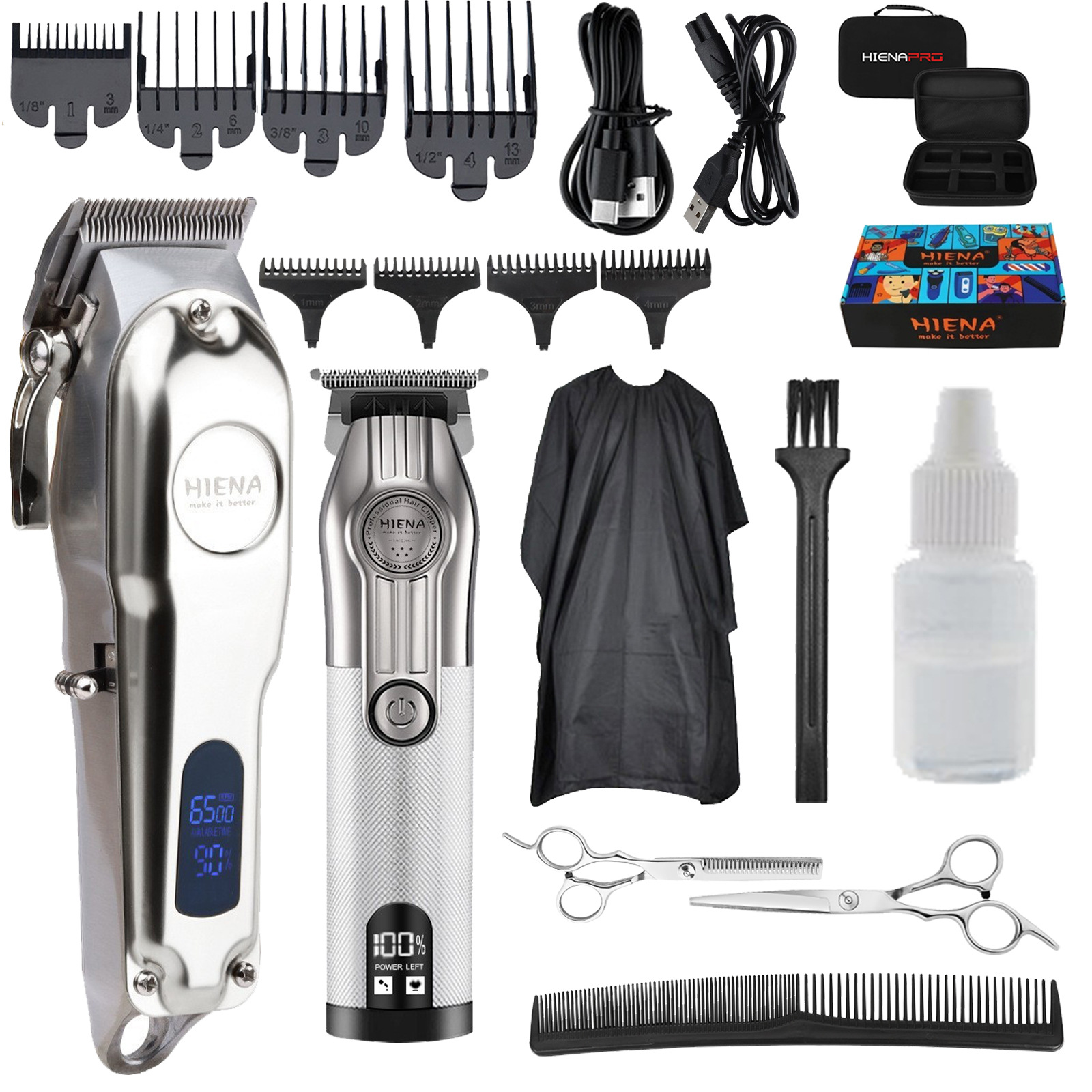 • HYN-202 실버 + HYN-601 화이트 + 실버 가위 세트 + 빗 + 천 + 단어가 포함된 중간 이발기 가방 + 중간 낙서 비행기 상자