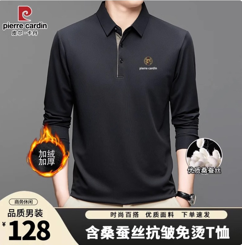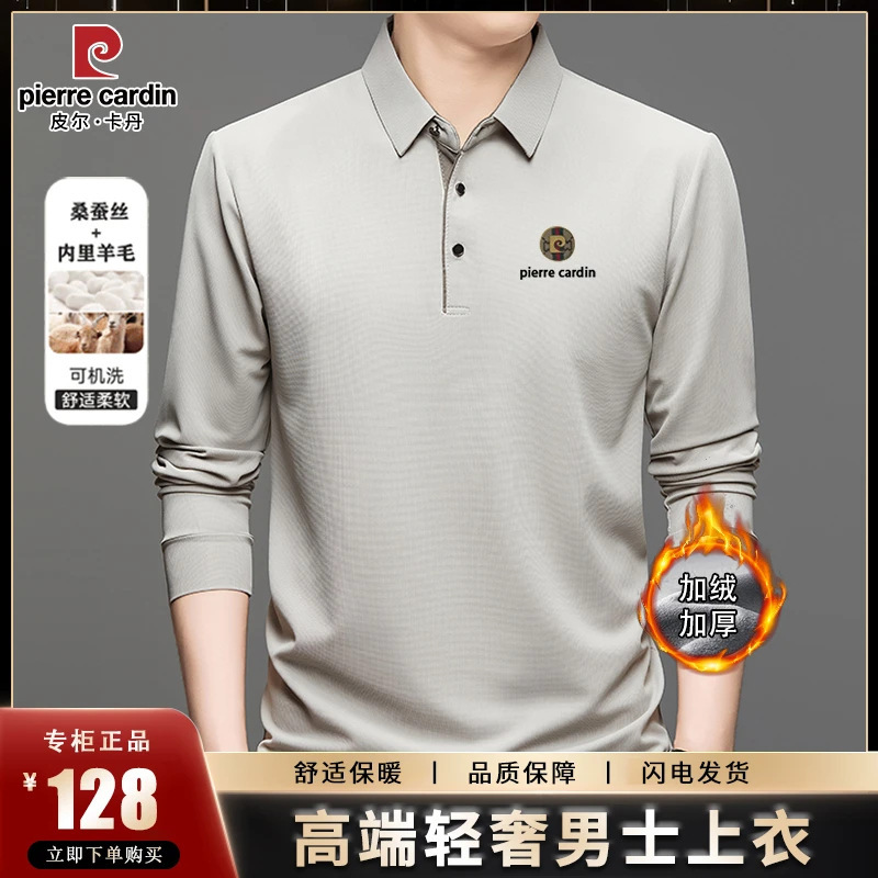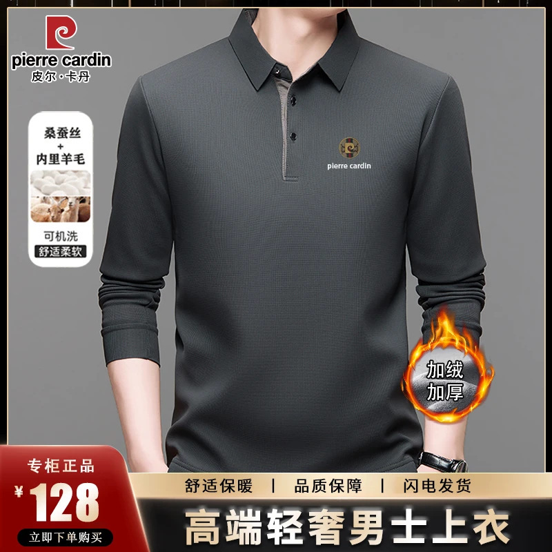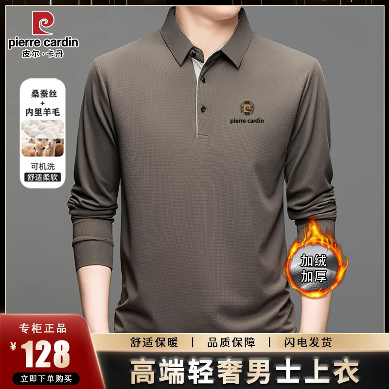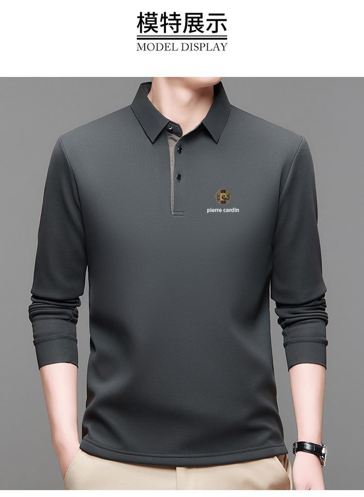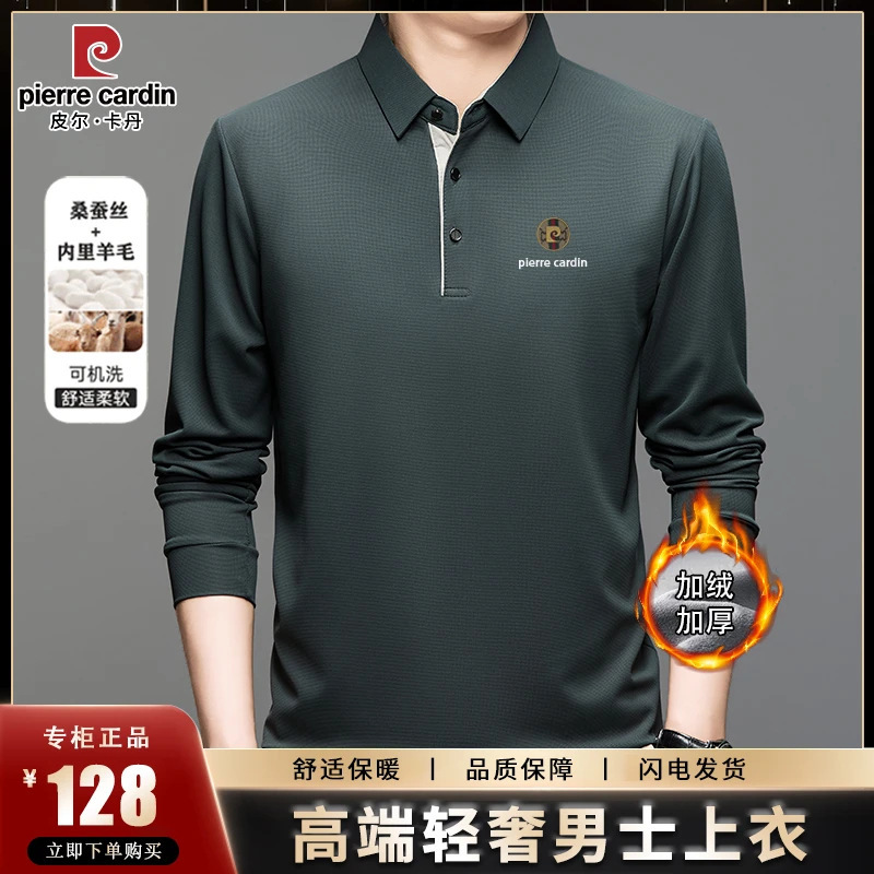 皮尔卡丹秋冬加绒加厚桑蚕丝长袖t恤男士保暖卫衣中年男装polo衫