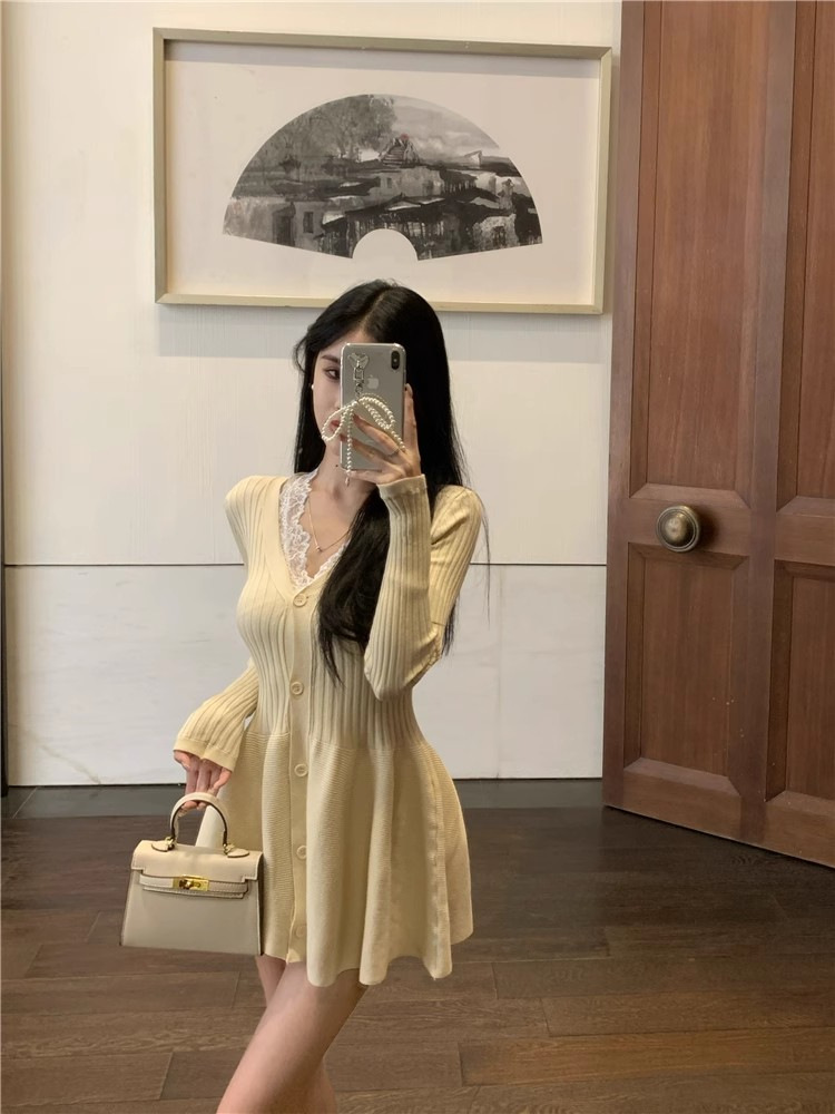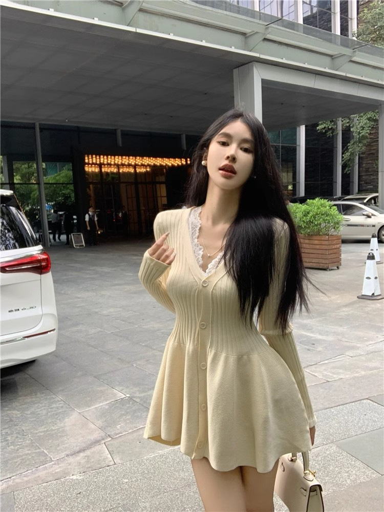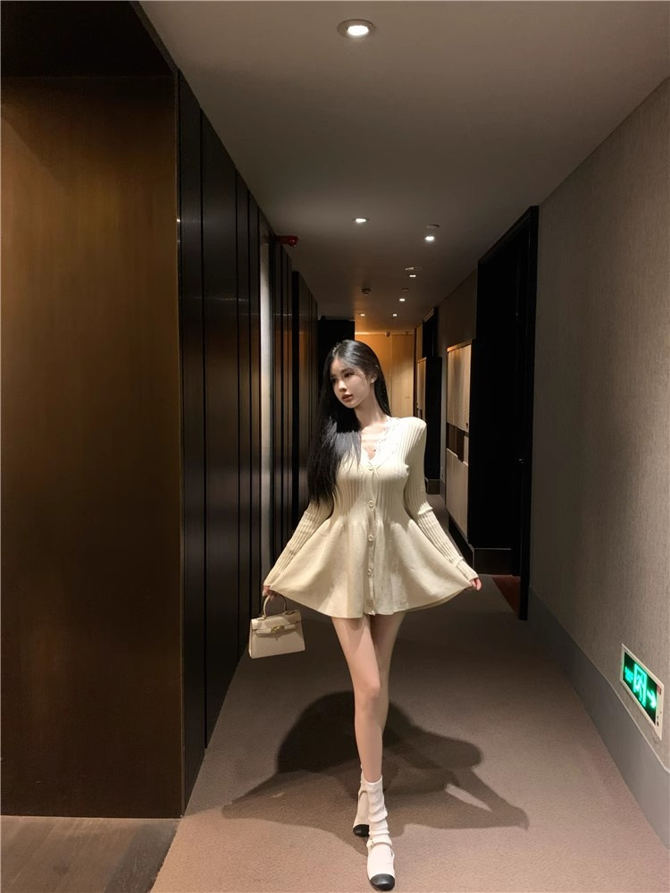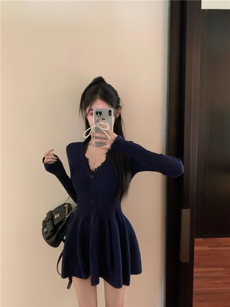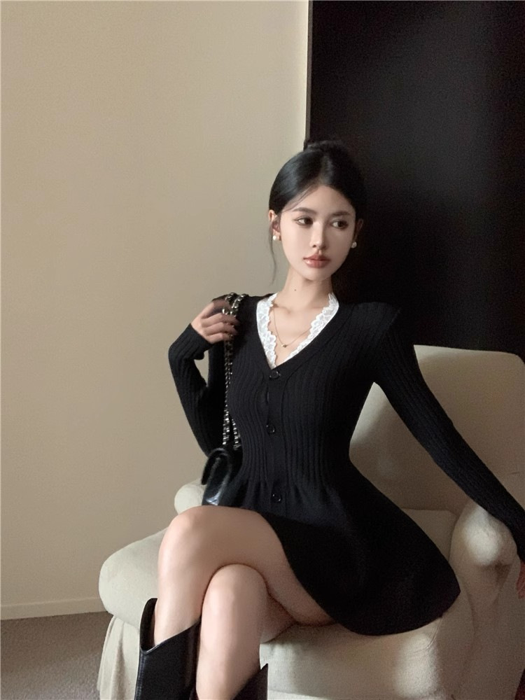 블랙 V 넥 긴 소매 니트 카디건 원피스 여성의 2024 년 초가을 새로운 허리 슬리밍 버드 짧은 치마스토어 가기